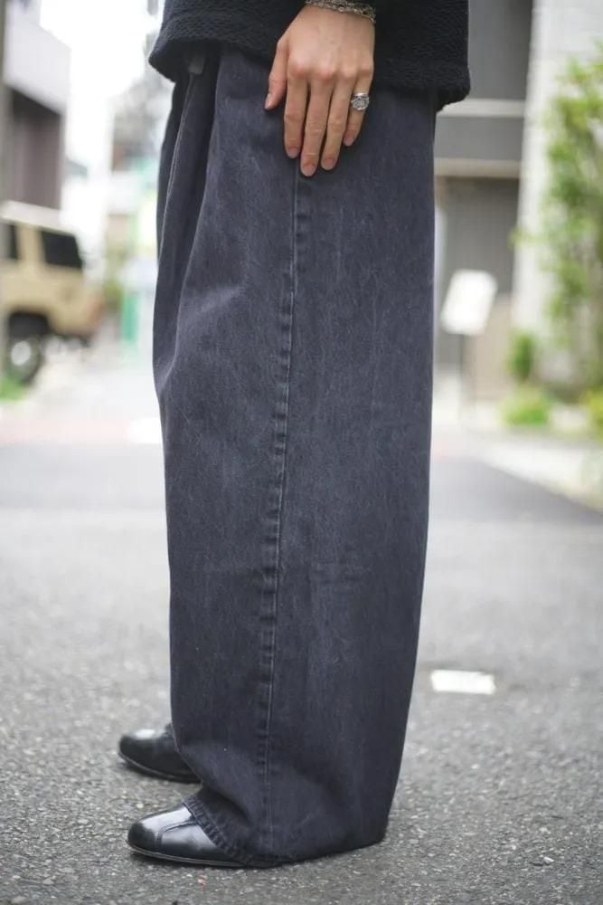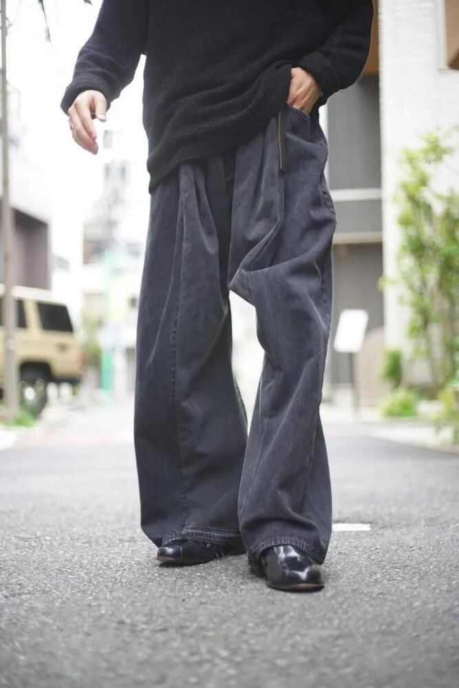 By using two strands, we have created a wide silhouette that is not found in vintage clothing, and by setting deep tucks at the waist, we have created a more voluminous look and an elegant drape.
