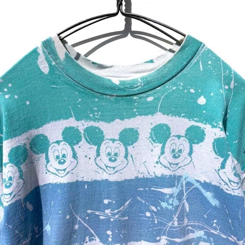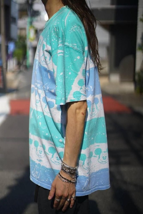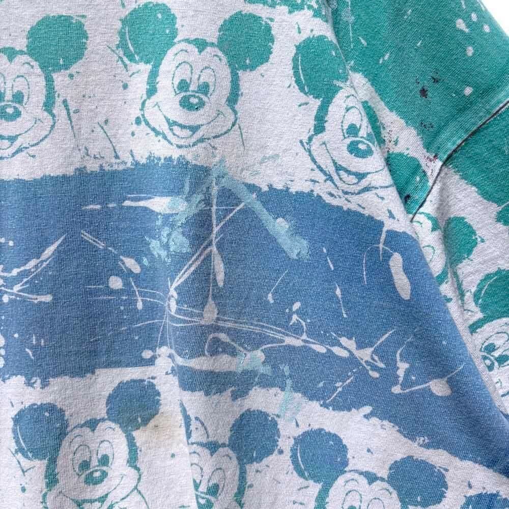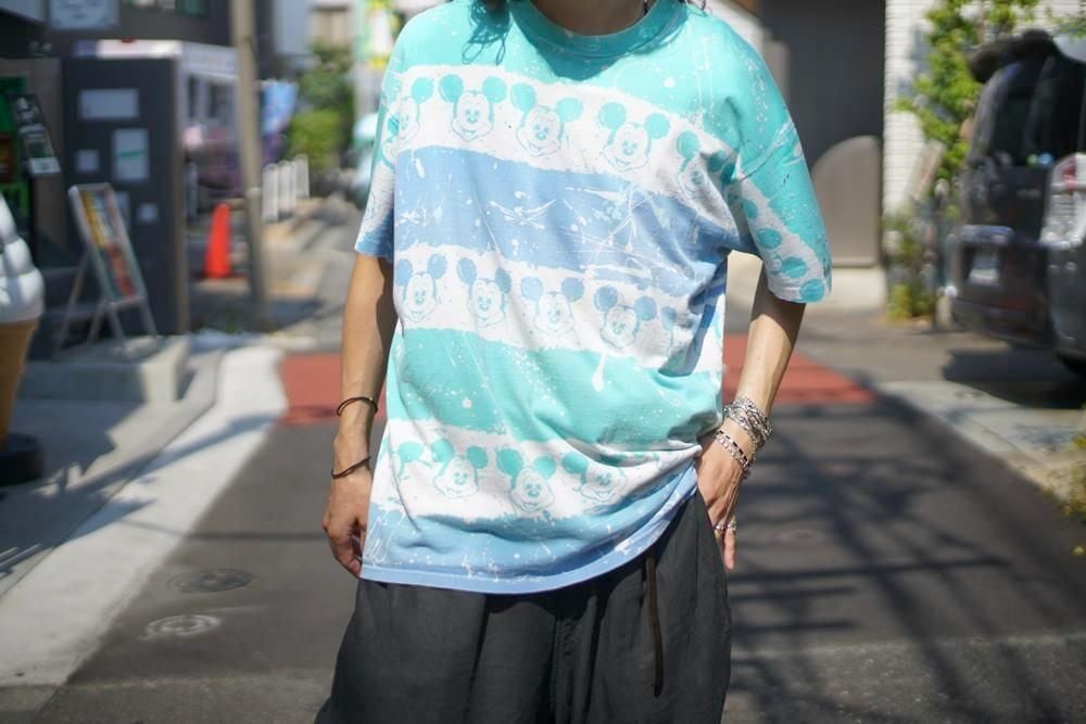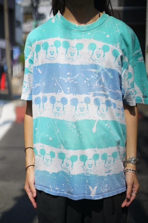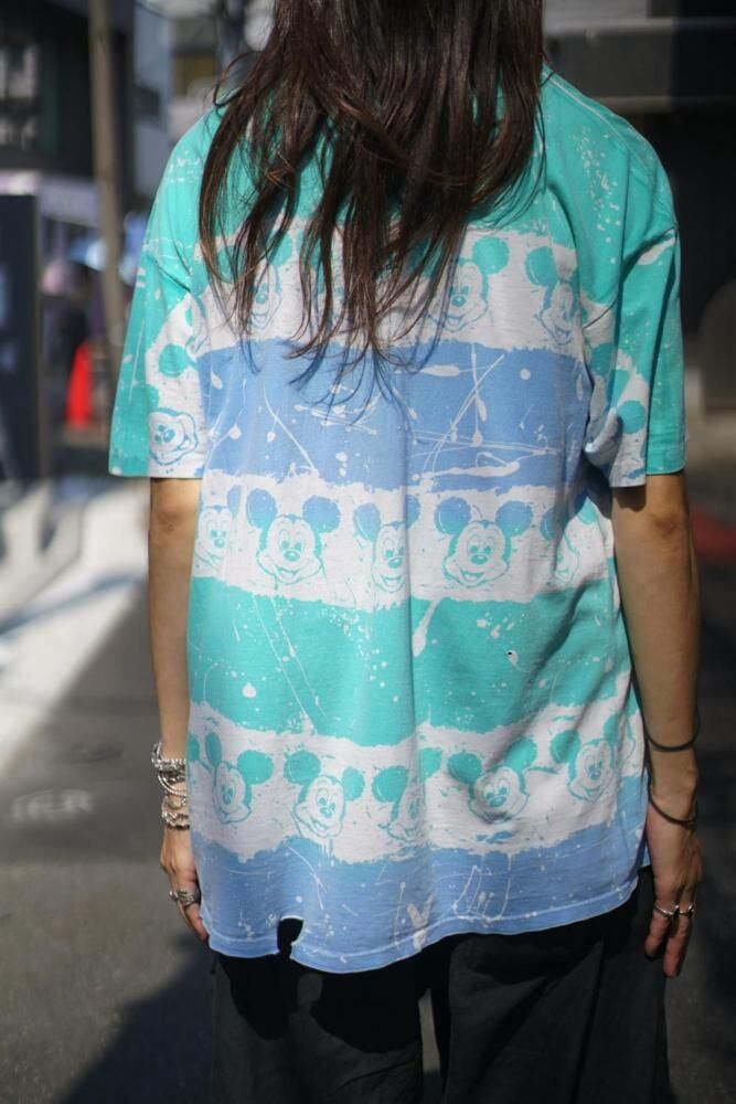 The faded vintage coloring and the rough design with Mickey Mouse lined up on a border and paint splattered on it make for an impressive piece, and the all-over print that is hand-printed even on the neck rib makes this an extremely rare piece.