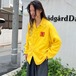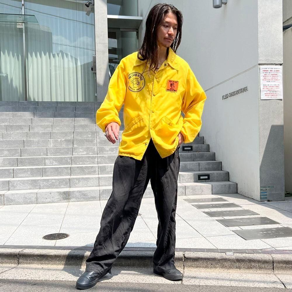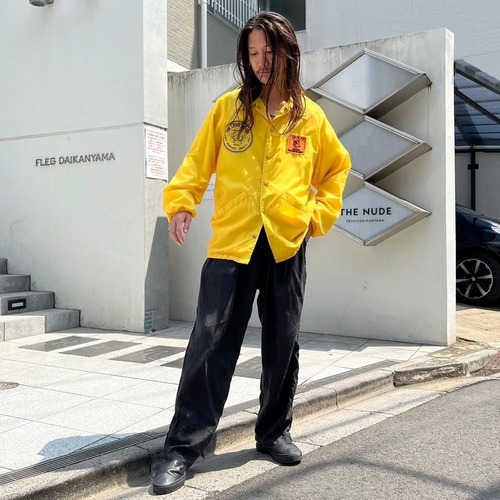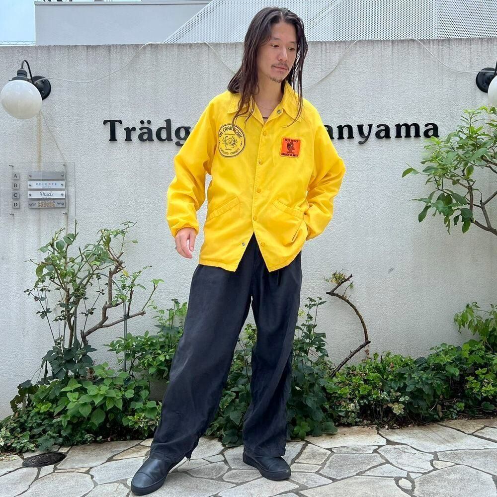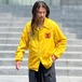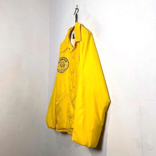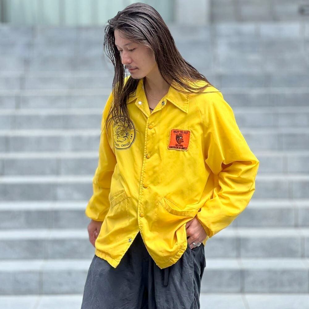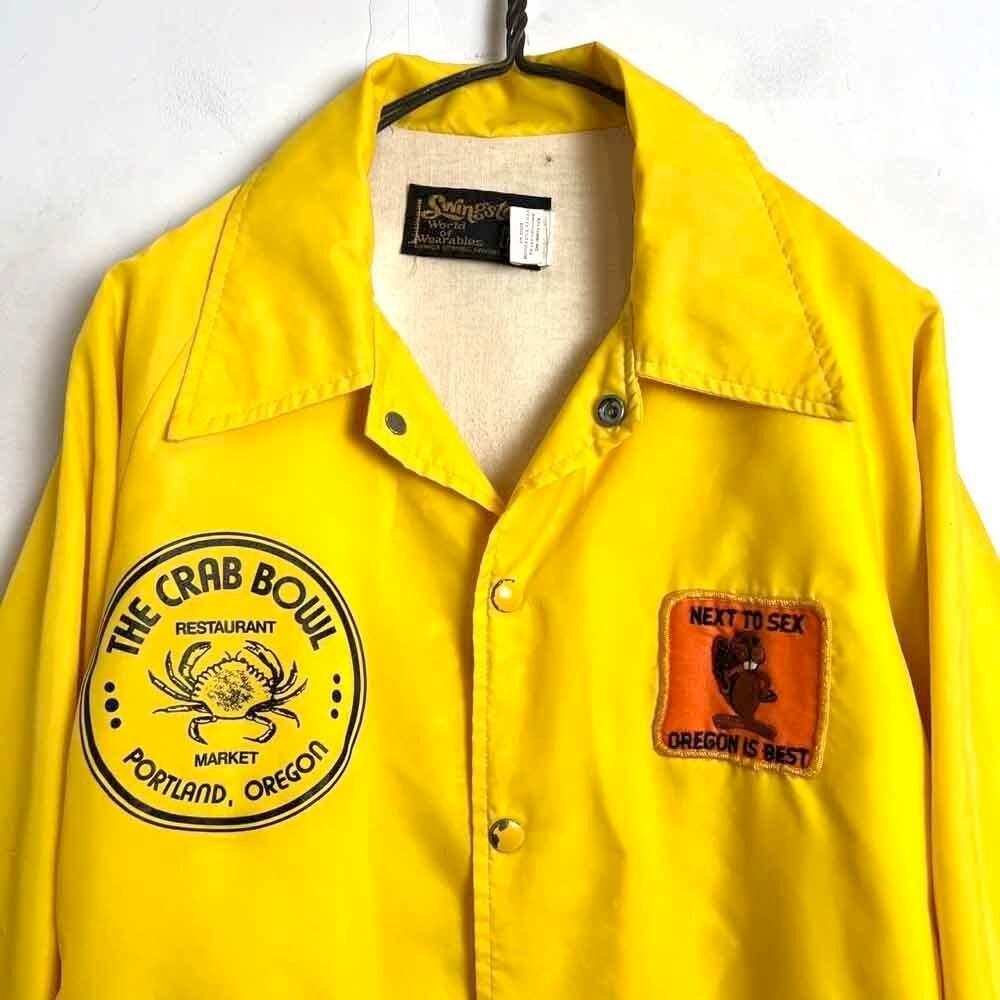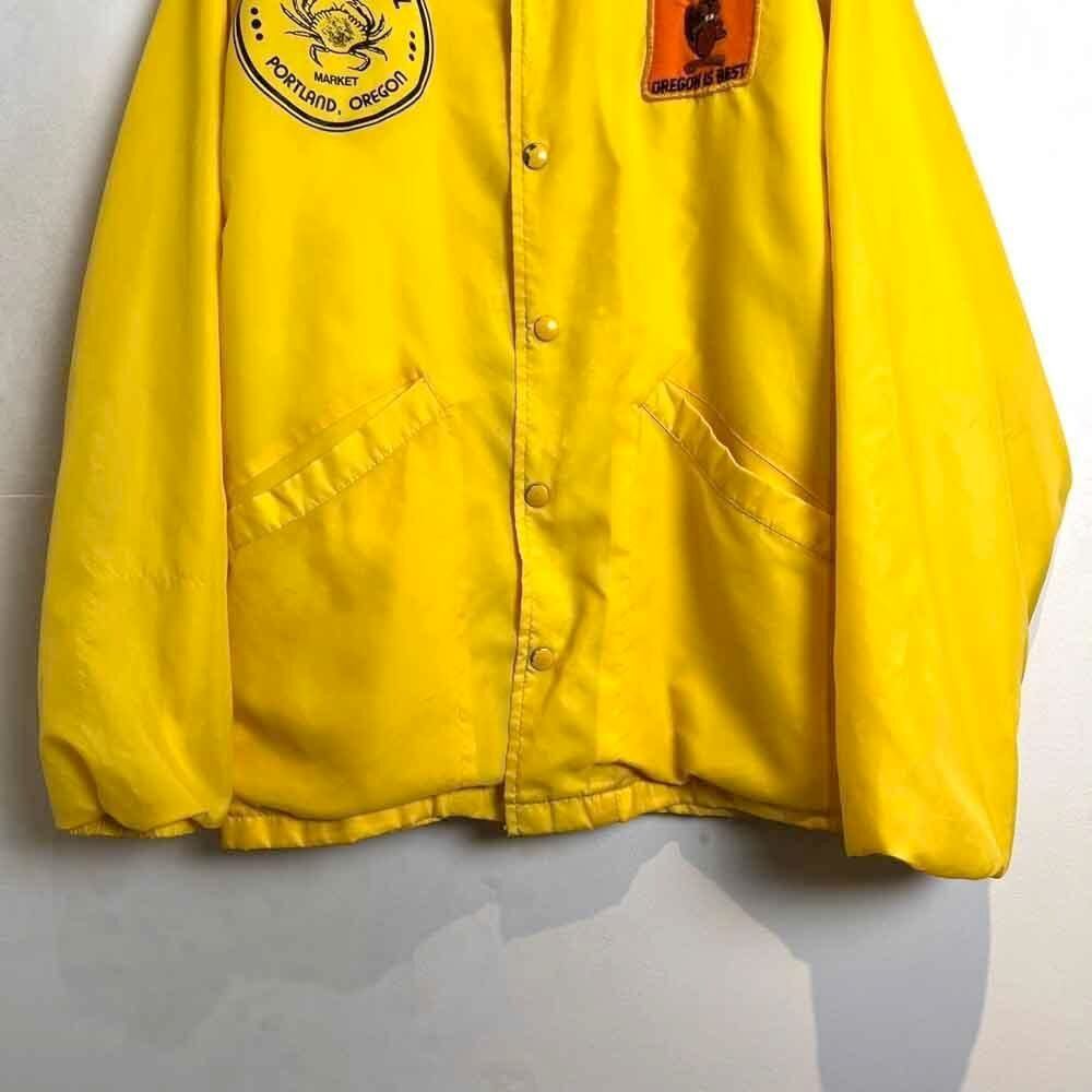 This 1980s coach jacket from a seafood restaurant in Portland, Oregon, features a vibrant yellow color and a cute print and patch on the chest. Its made of lightweight nylon with a lining, a comfortable fit, and a comfortable silhouette.