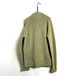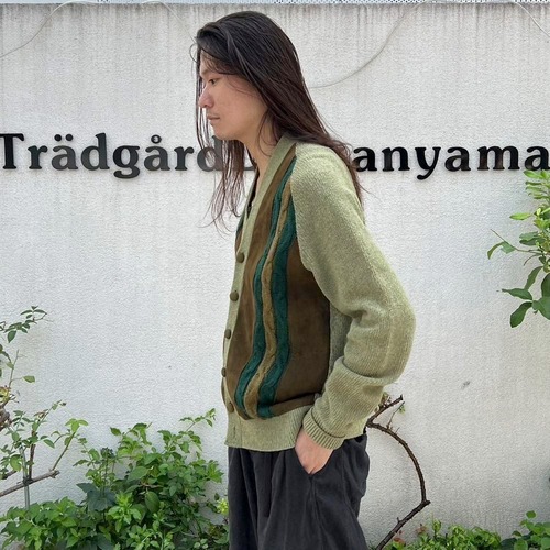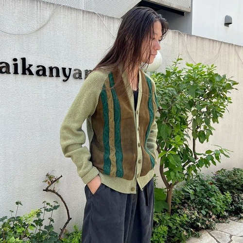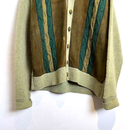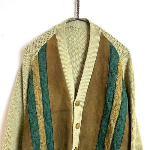 This cardigan from the 60s features a tasteful combination of suede and knit fabrics. The pale olive base features brown suede and green and khaki cable knit stripes, creating a very stylish piece.