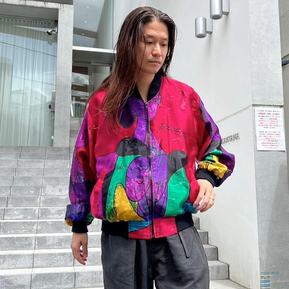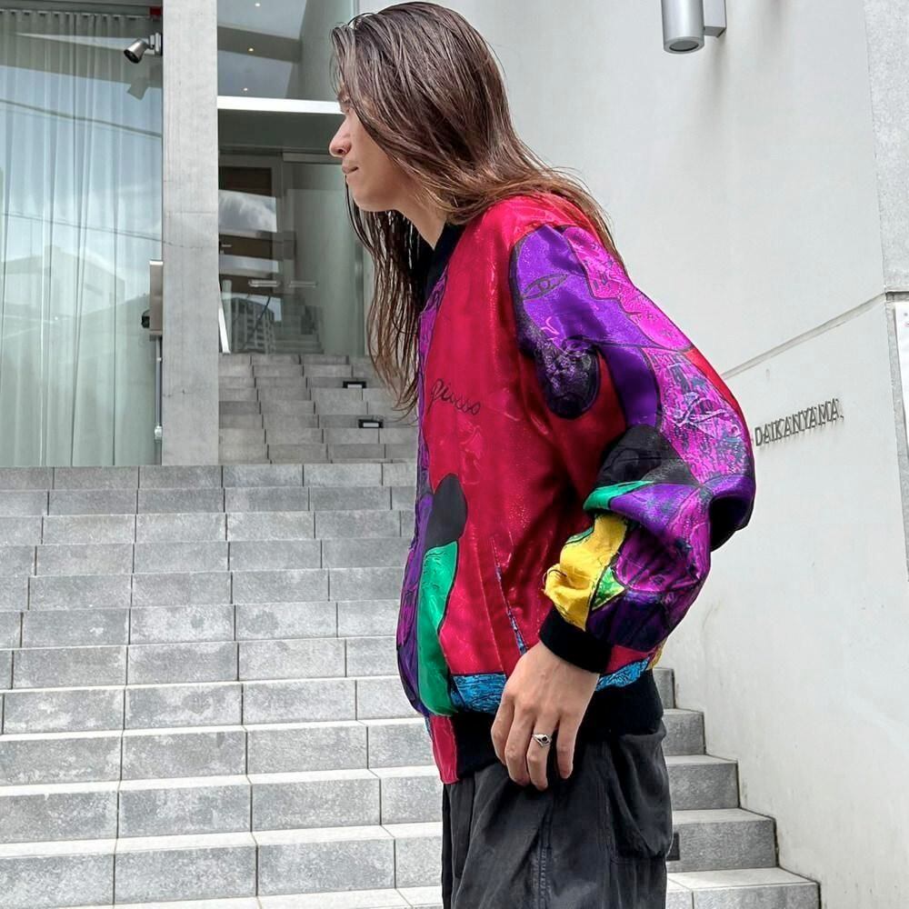 This 1980s Picasso art pattern jacket features a striking red and purple contrast, creating a striking color palette. Its bomber jacket design makes it easy to coordinate with other items, and its lightweight and comfortable to wear. Its relaxed fit creates a comfortable silhouette.