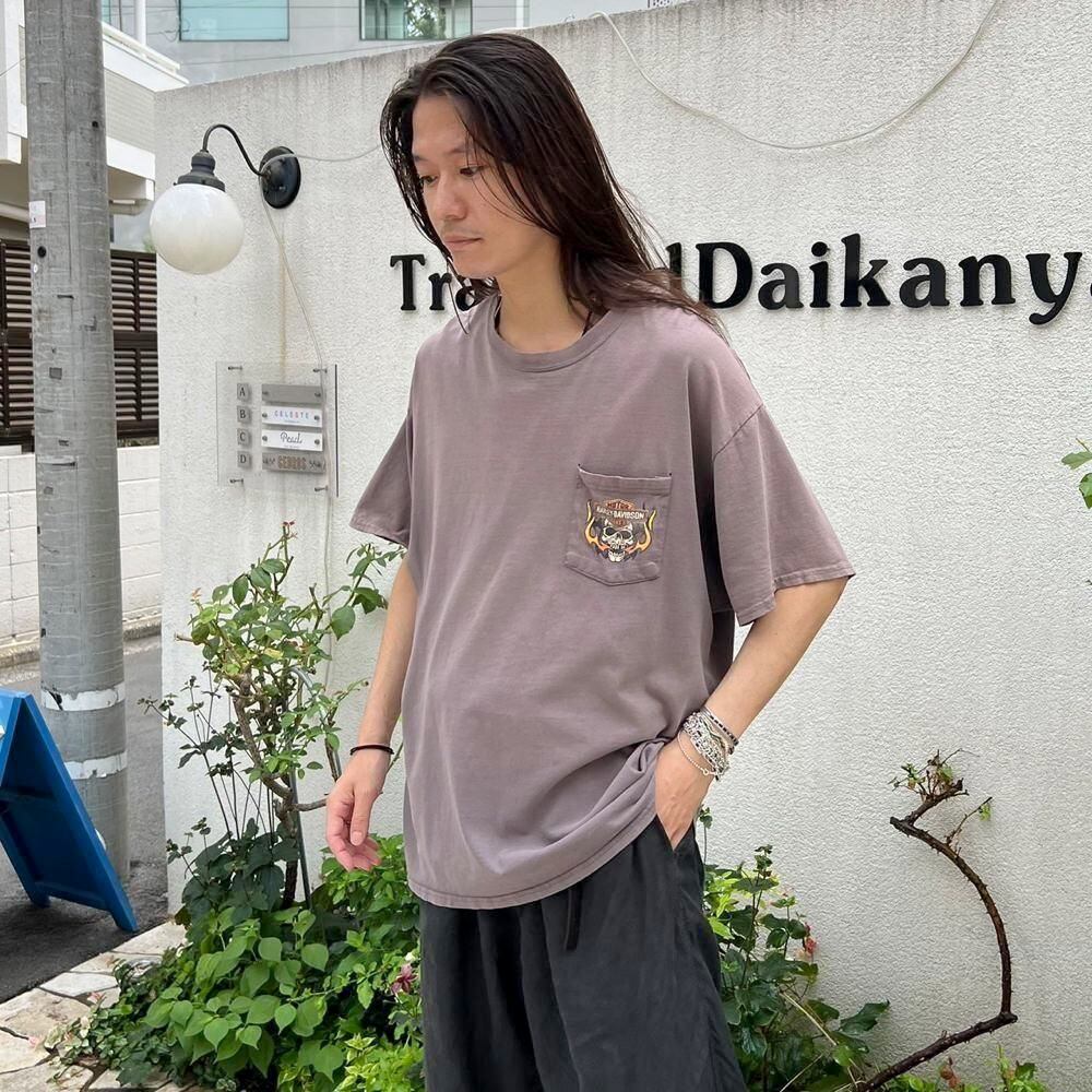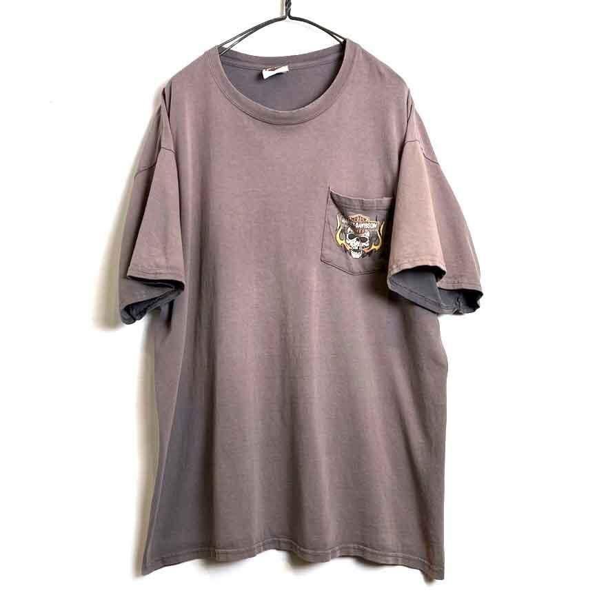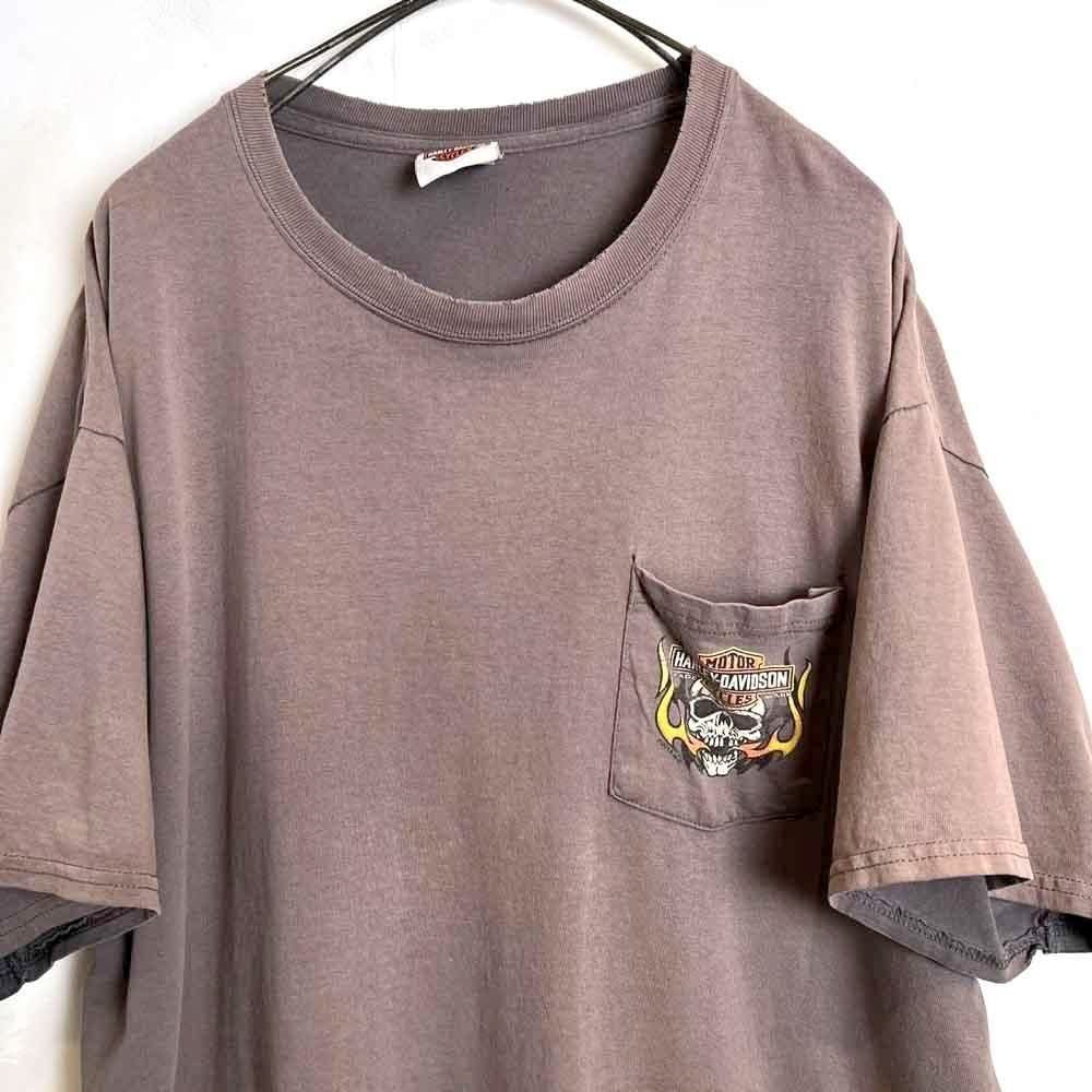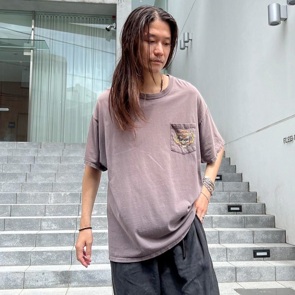 This Harley-Davidson 90s pocket T-shirt features a unique azuki gray body with a chest pocket and a printed design on the back. It has a relaxed silhouette and a comfortable fit.