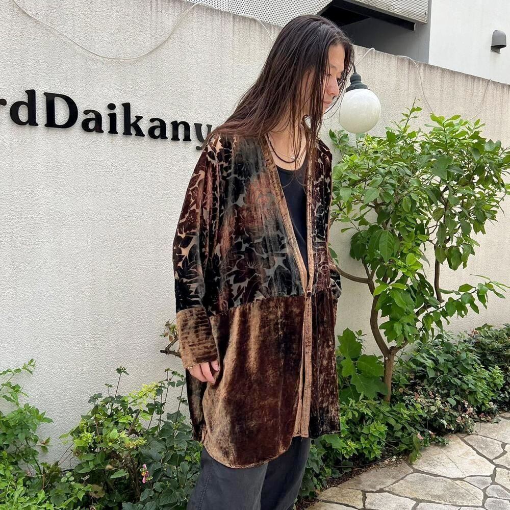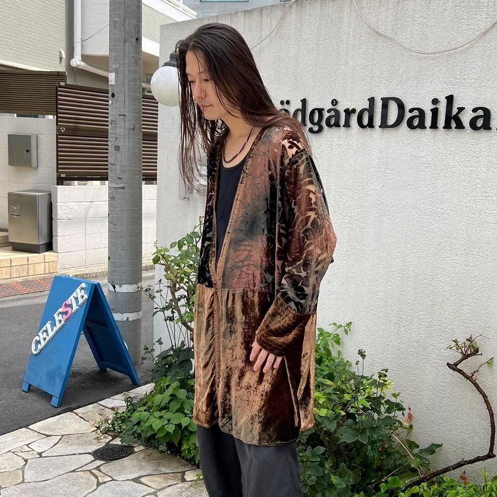 This 80s velvet gown features a unique iridescent color that blends brown, black, and burgundy. The upper half features a see-through botanical pattern, making it an interesting design. The sheerness allows for layering.