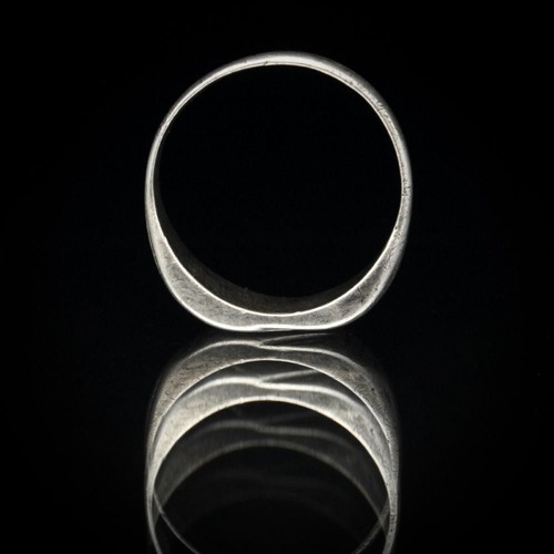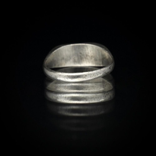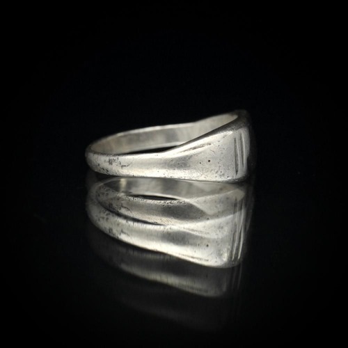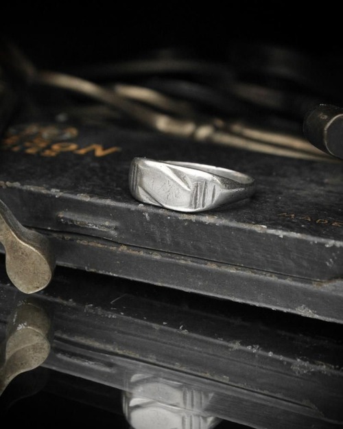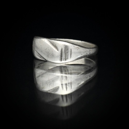 This signet ring dates back to the 1930s. The small, rectangular top has worn over time, giving it the air of vintage charm. The tarnished silver and minimalist design add a touch of elegance. Although the engraving has faded, it is still sterling silver. Please review the photos to confirm the condition and understand the unique characteristics of vintage items before purchasing.