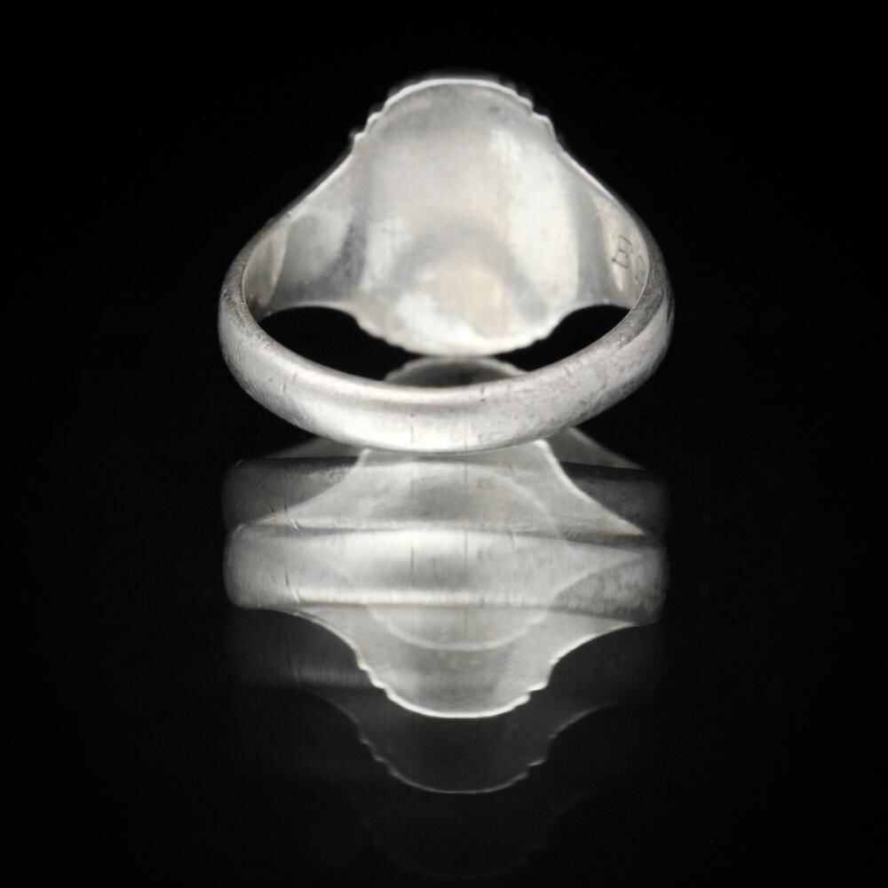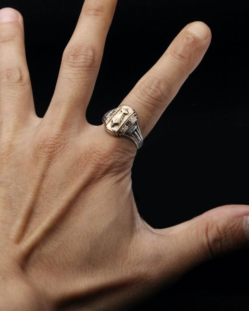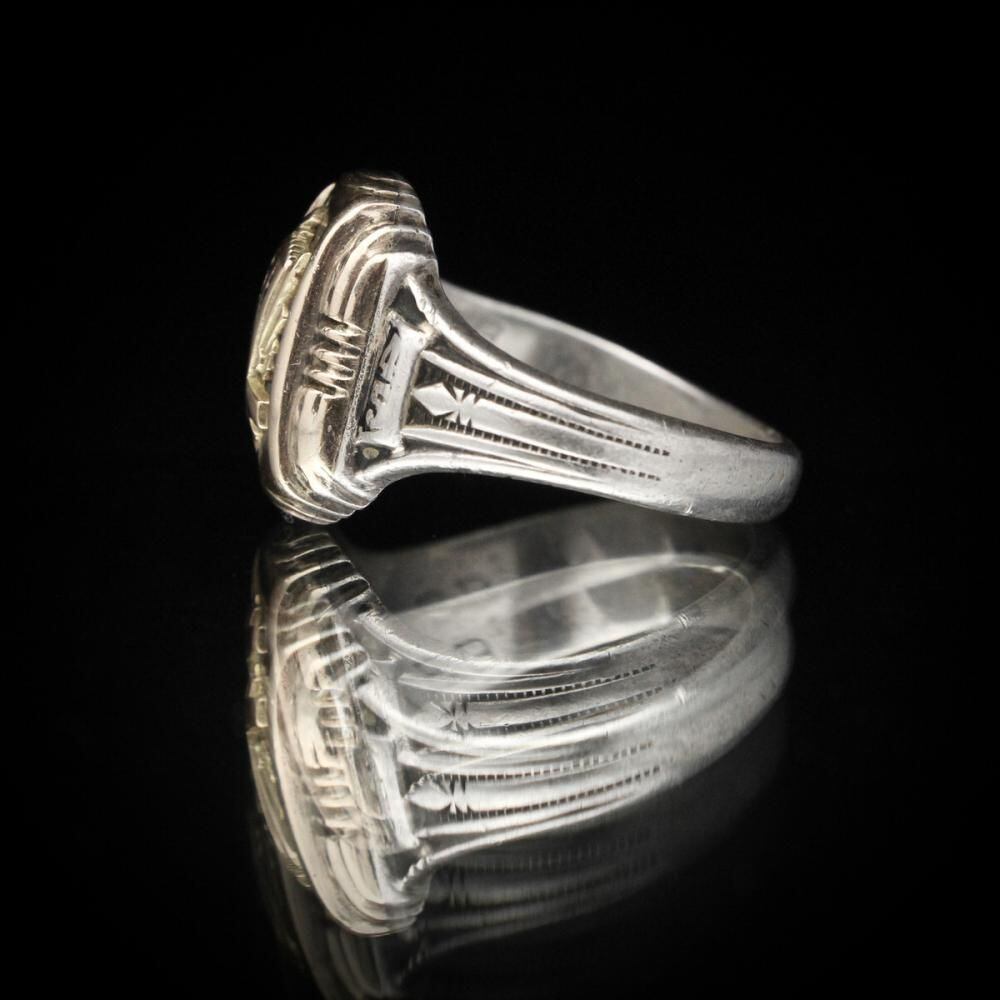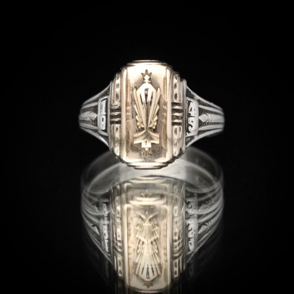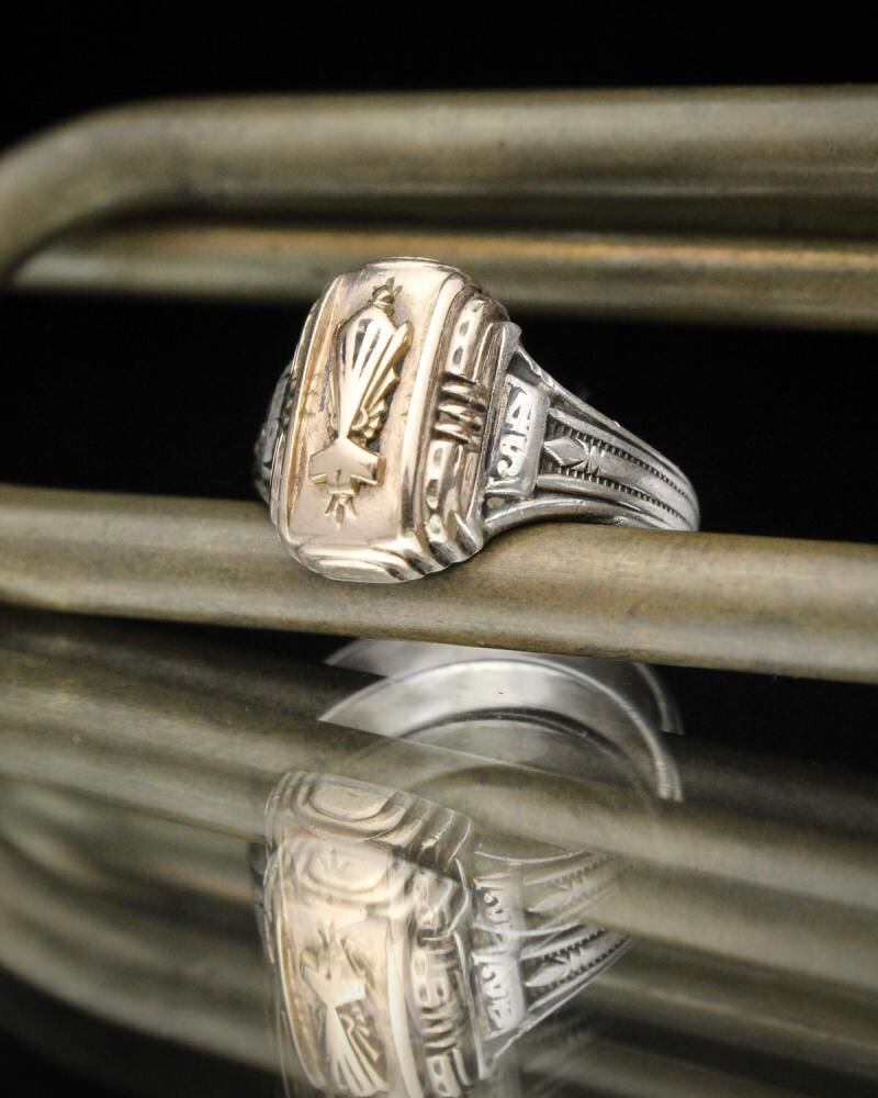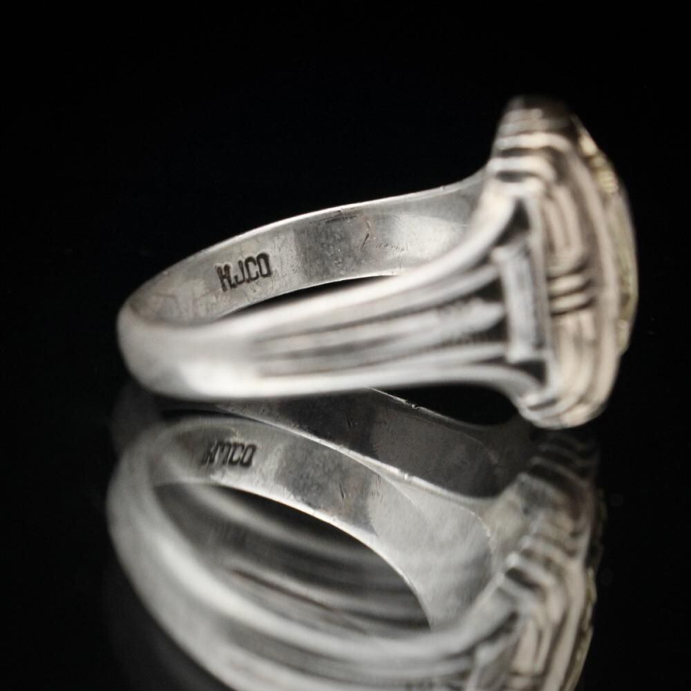 This vintage class ring dates back to 1945. It likely originated from a combination of silver and gold due to the precious metal shortage after World War II. The gold top and sterling silver hoops create a rugged yet simple design, contrasting beautifully with the sophisticated design. Made by the long-established Herff Jones company, it is 10k gold and silver, although the markings may or may not have worn off. Please review the photos to confirm the condition and understand the unique characteristics of this vintage piece before purchasing.