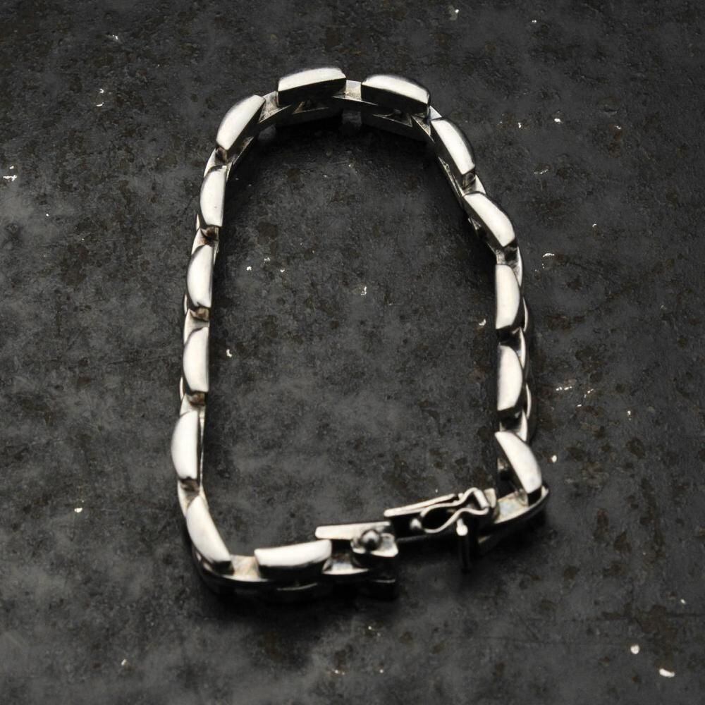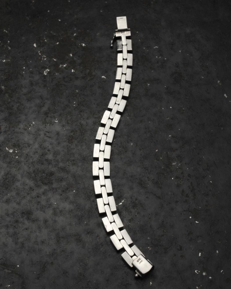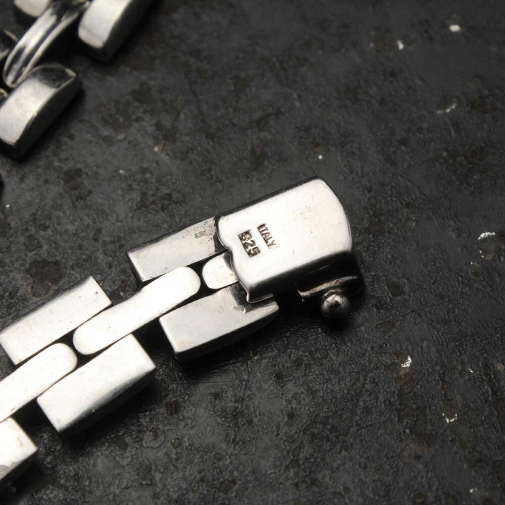 This chain bracelet is crafted in Italy by artisans who specialize in delicate craftsmanship. Its striking wide silhouette is reminiscent of a vintage watch band chain. This minimalist yet rare piece exudes a sense of weight and elegance, exuding a masculine look. It is stamped Made in Italy 925. As this is an old piece, there may be some scuffs. Please review the photos and understand the characteristics of vintage items before purchasing.