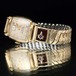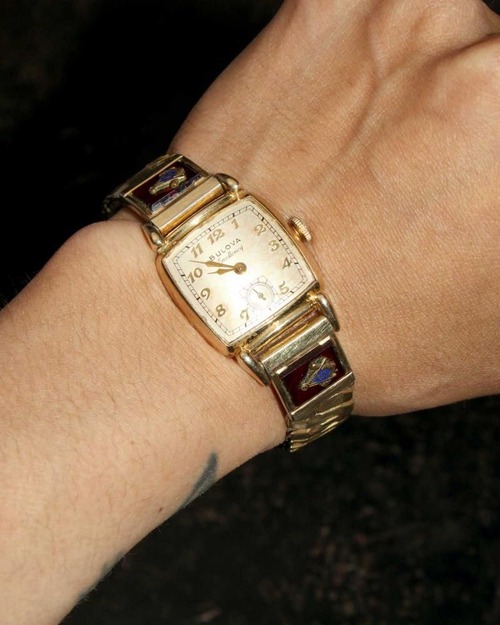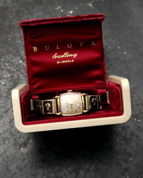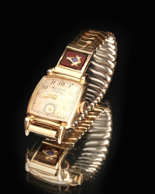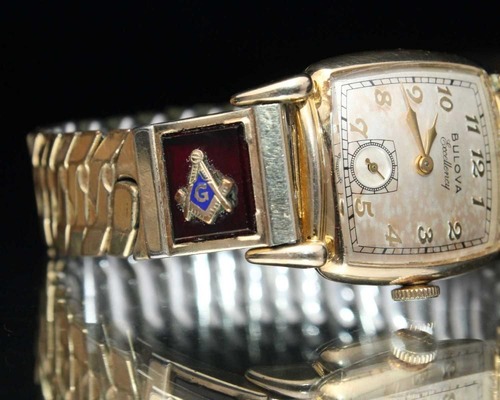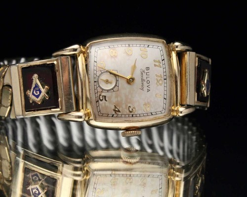This is a Bulova Excellency watch from 1950. While some dials feature the Freemason symbol, this one features a custom-made band, making it extremely rare. It features a simple gold-plated accordion (flexible) band and a square case typical of this era, featuring the Masonic symbol against a wine-colored synthetic resin (or perhaps glass) design. It is manual-wound, L0 (hallmarked for 1950), and 10k gold-fielded. It comes with a box. It was overhauled at an antique watch specialty store in August 2025. Please note that I do not have extensive expertise in watches. Due to its age, there may be some scratches. Please review the photos and understand the characteristics of vintage watches before purchasing.