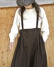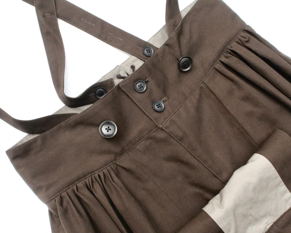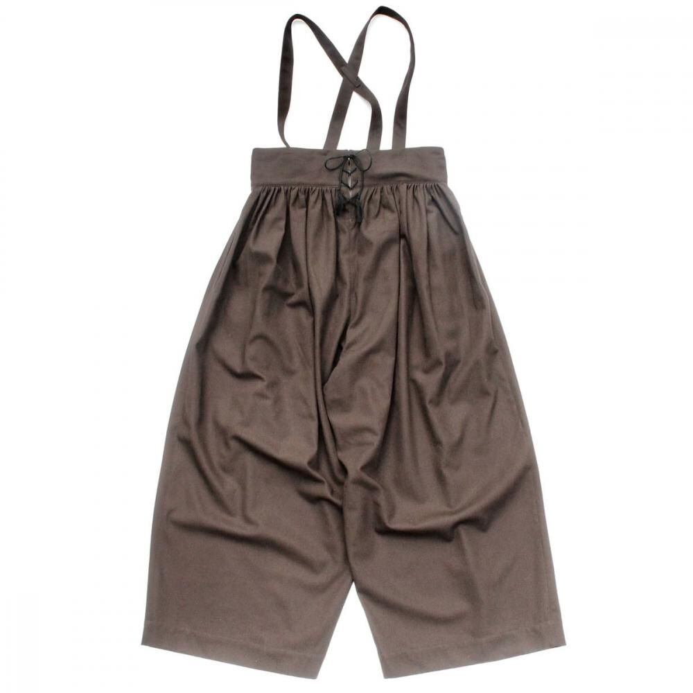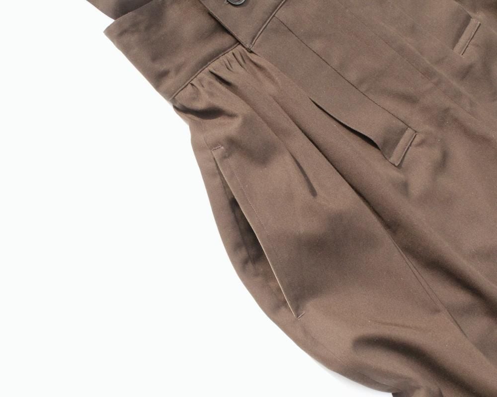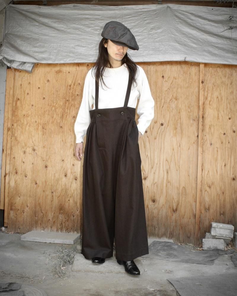 [ALVISTA] 7th issue Vol. 2. 2025AW Inspired by the style of wearing voluminous pants called bloomers as part of a set in the Aran Islands of Ireland, these pants also draw inspiration from the traditional clothing of Volendam, a long-established fishing town in Europe. The most distinctive feature is the extremely voluminous and impactful form created by countless pintucks placed below the waistband. To compensate for the slightly larger waist size due to the emphasis on form, a cord is threaded inside, and simple suspenders made of the same material are included, the length of which can be adjusted with buttons so that the pants can be worn without tightening. The distinctive waist detail and form of these pants are most prominent when tucked in with the suspenders. The buttons are made of vegetable ivory made from tagwa palm. The suspenders are set to their longest setting when worn.