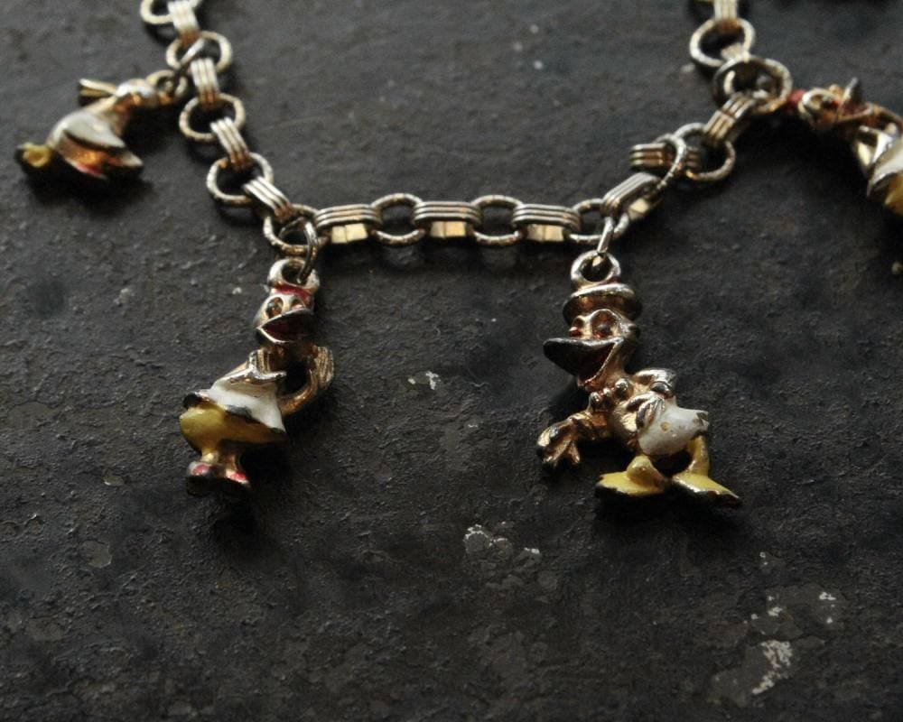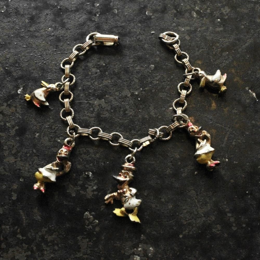 This is a Disney souvenir charm bracelet from before the company changed its name in 1986. It features a Donald Duck charm, giving it a kitschy look and a aged, charming appearance. Its made of alloy (copper with a plated finish) and is small, making it suitable for women. Due to its age, it may have some scuffs. Please review the photos and understand the characteristics of vintage items before purchasing.