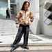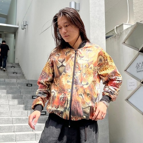 The Tyvek jacket from the 90s, known as a paper jacket due to its paper-like texture, is popular for its world map pattern, made famous by Kurt Cobain. This jacket, however, features a dense print of felines, creating a striking impact. Its light texture makes it perfect as a jacket for spring and autumn, and it also makes a fun layering piece during the colder months.