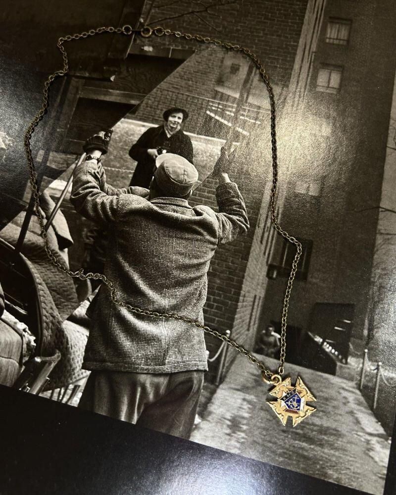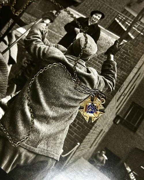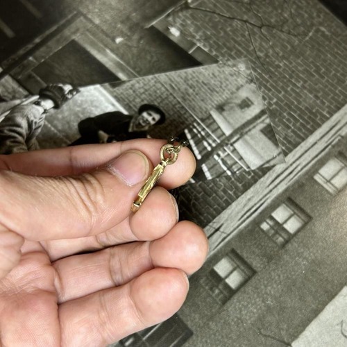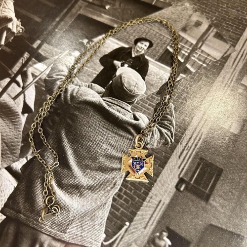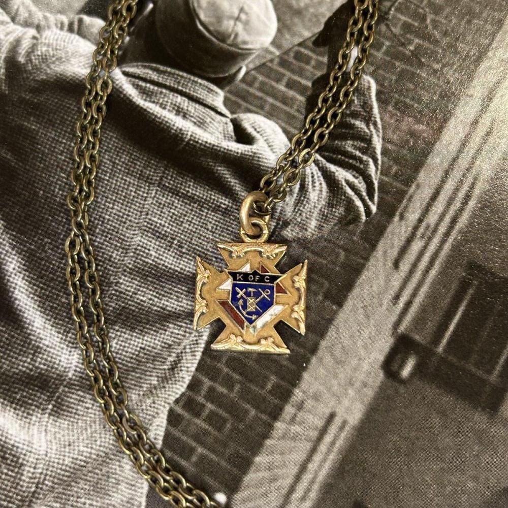 This Knights of Columbus top necklace dates back to the 1930s. It features a gold-plated iron cross emblem, a design that was abandoned during the war, and a small skull motif. Its simple yet dignified design is evident. The top is gold-plated, and the chain is sterling silver. Due to its age, it may show signs of aging, including tarnish and minor scratches. Please review the photos and understand the characteristics of vintage items before purchasing.