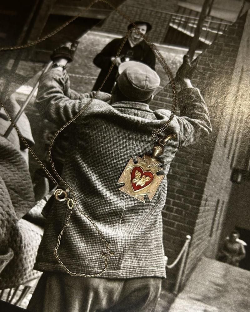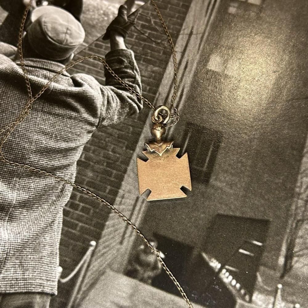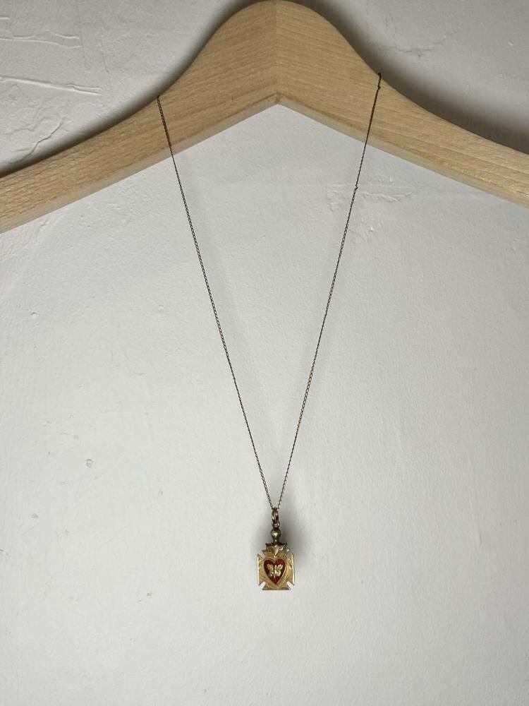This elk top necklace dates back to the 1930s. It features an elk seal within a rare heart motif on an iron cross, a design that fell out of use during World War II. Its small size and understated design, combined with the knight-shaped end pieces, create a striking piece. The top is made of gold-plated alloy, and the chain is gold-plated sterling silver. Due to its age, it may show signs of aging, including tarnish and minor scratches. Please review the photos and understand the characteristics of vintage items before purchasing.