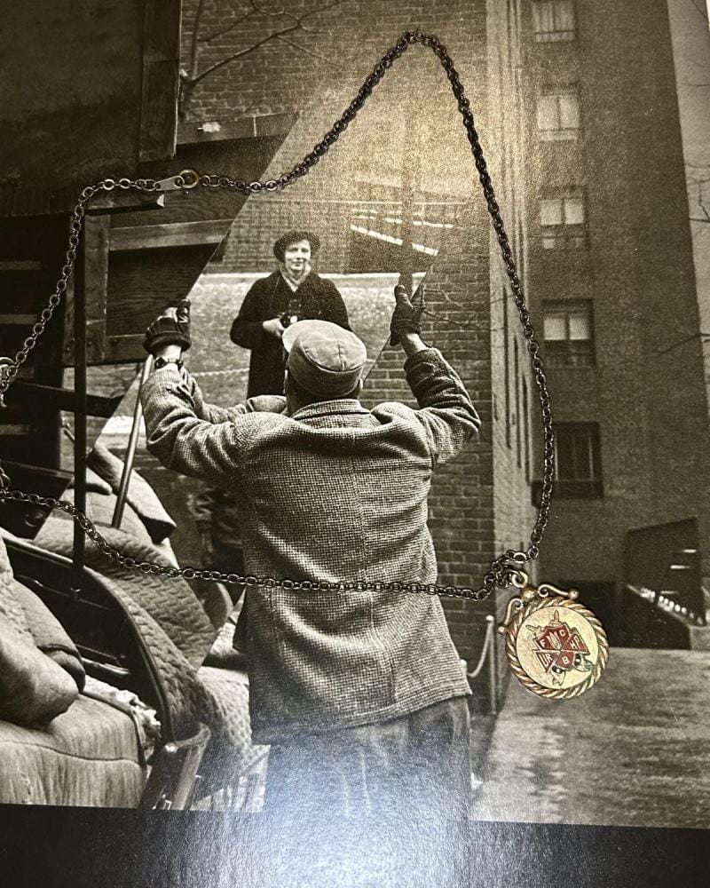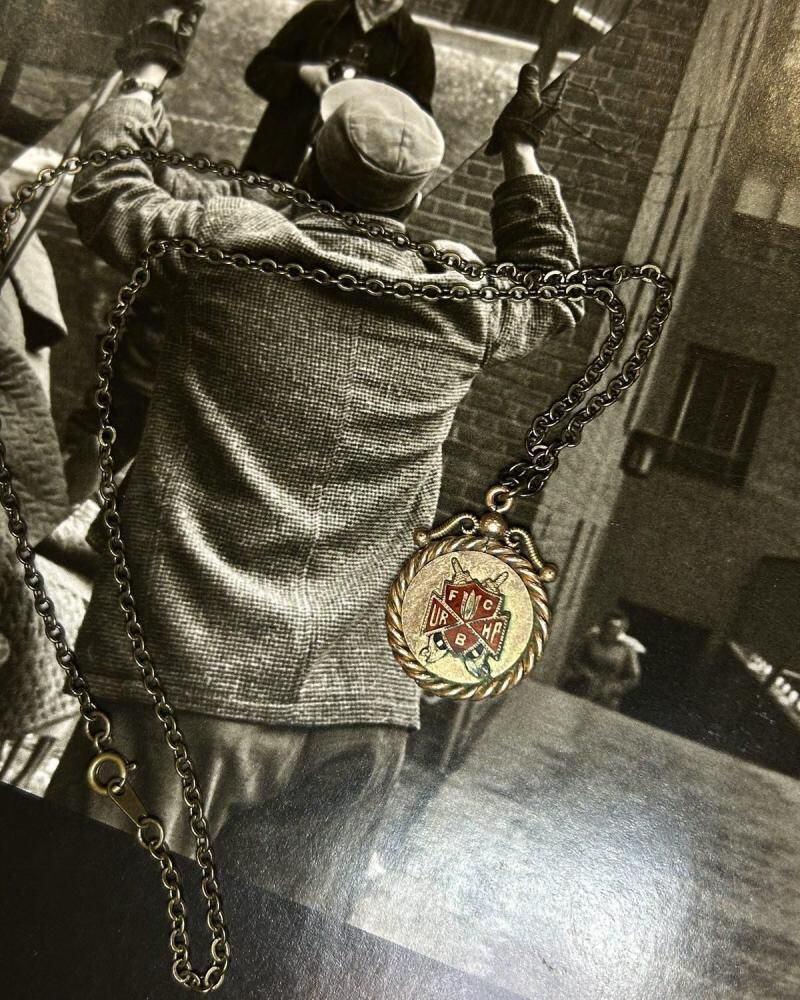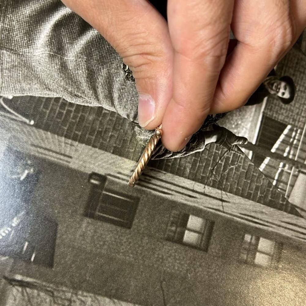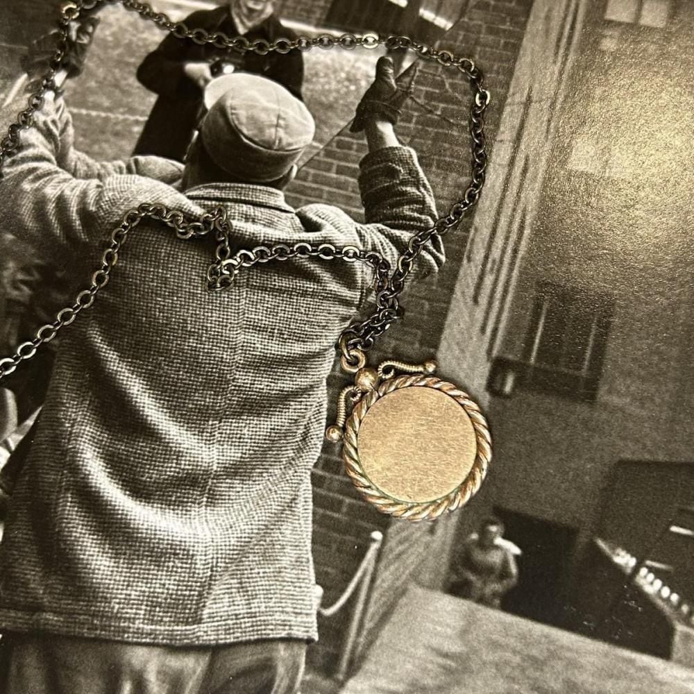 This Knights of Pythias top necklace dates back to the 1930s. It features a rare round top with an emblem, and twisted wire adorns the perimeter, creating a dignified, stately appearance. The top is made of gold-plated alloy, and the chain is brass. As this is an old piece, there may be some fading and minor scratches. Please review the photos and understand the characteristics of vintage items before purchasing.