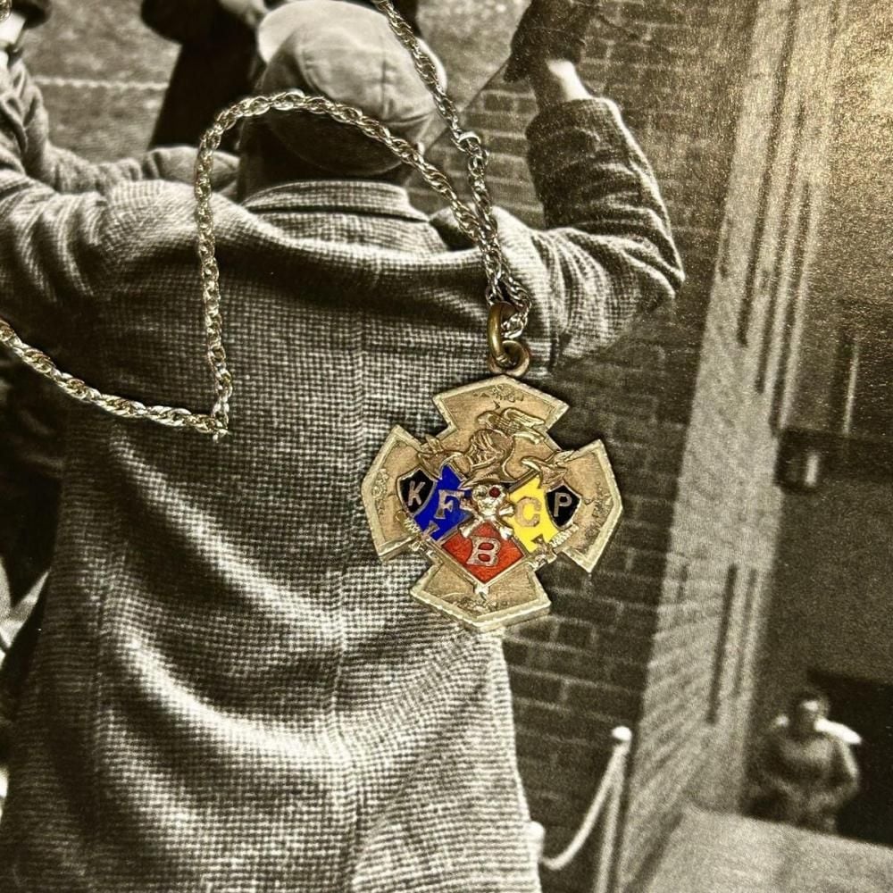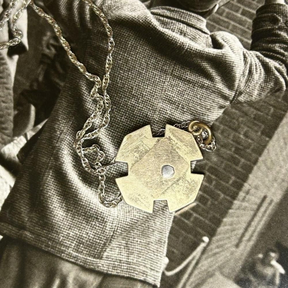 This Knights of Pythias top necklace dates from the 1930s. It features the Iron Cross, a design that fell out of use during World War II, embellished with the motto FCB (Friendship, Charity, Benevolence), and a skull motif in the center. The more angular cross motif and intricate construction enhance its unique character. The top is made of gold-plated alloy, and the chain is sterling silver. As this is an old piece, there may be some tarnish and minor scratches. Please review the photos and understand the characteristics of vintage items before purchasing.