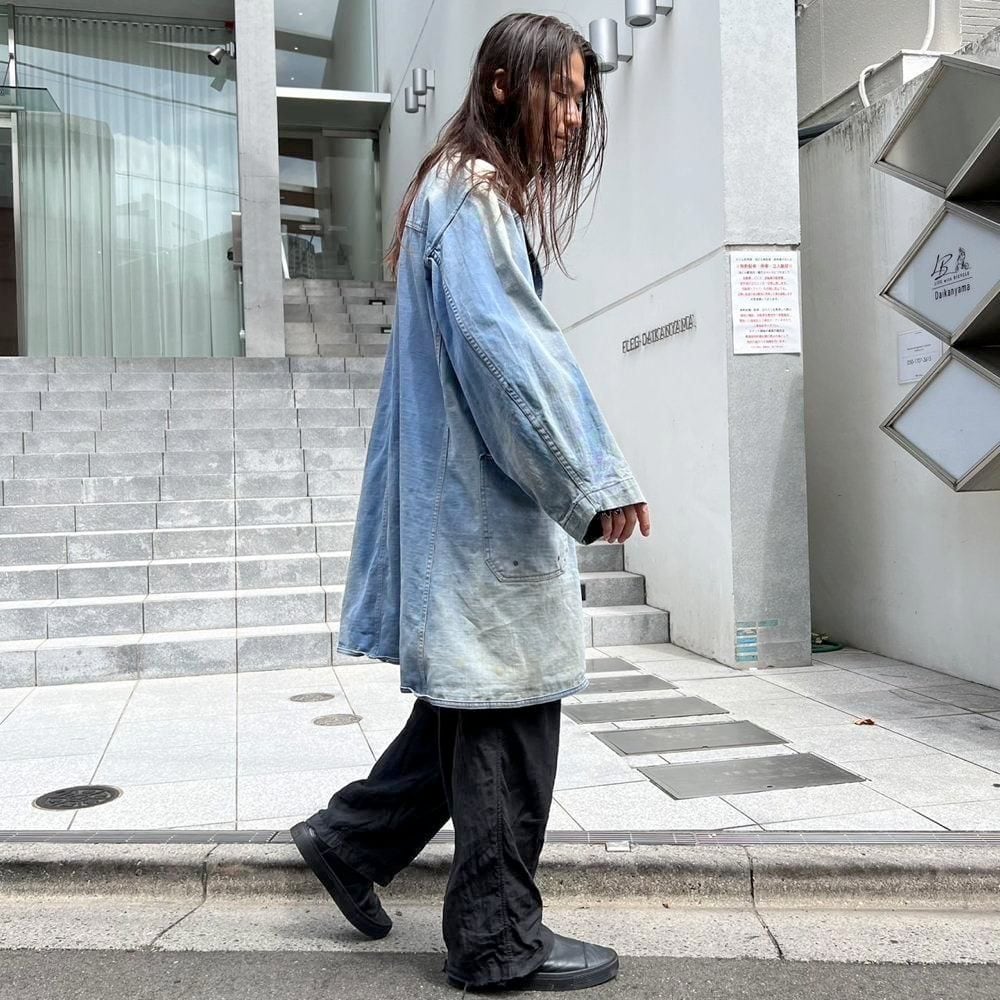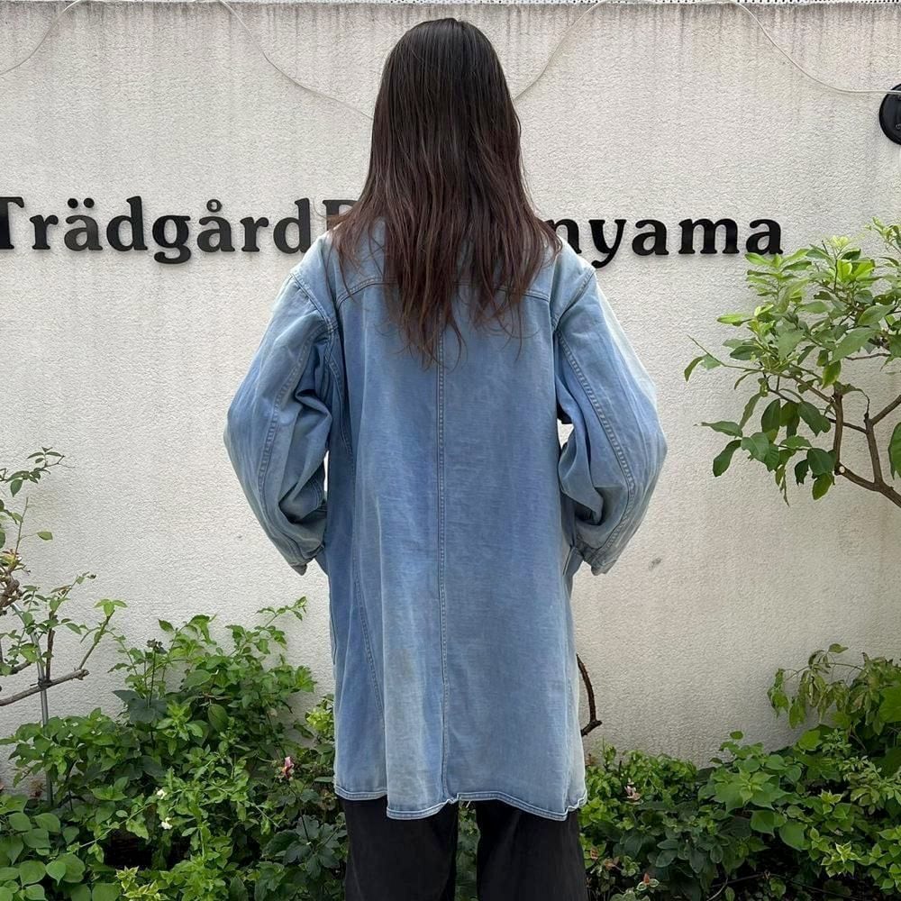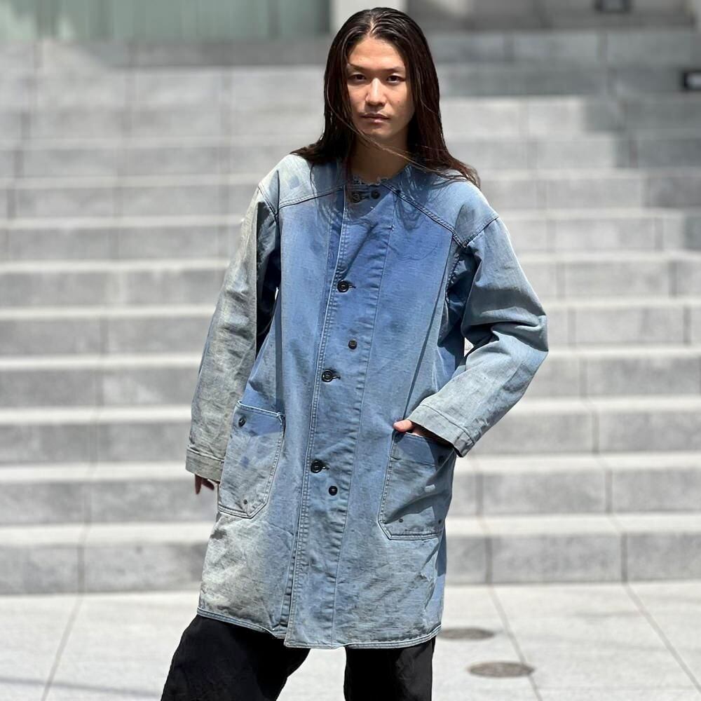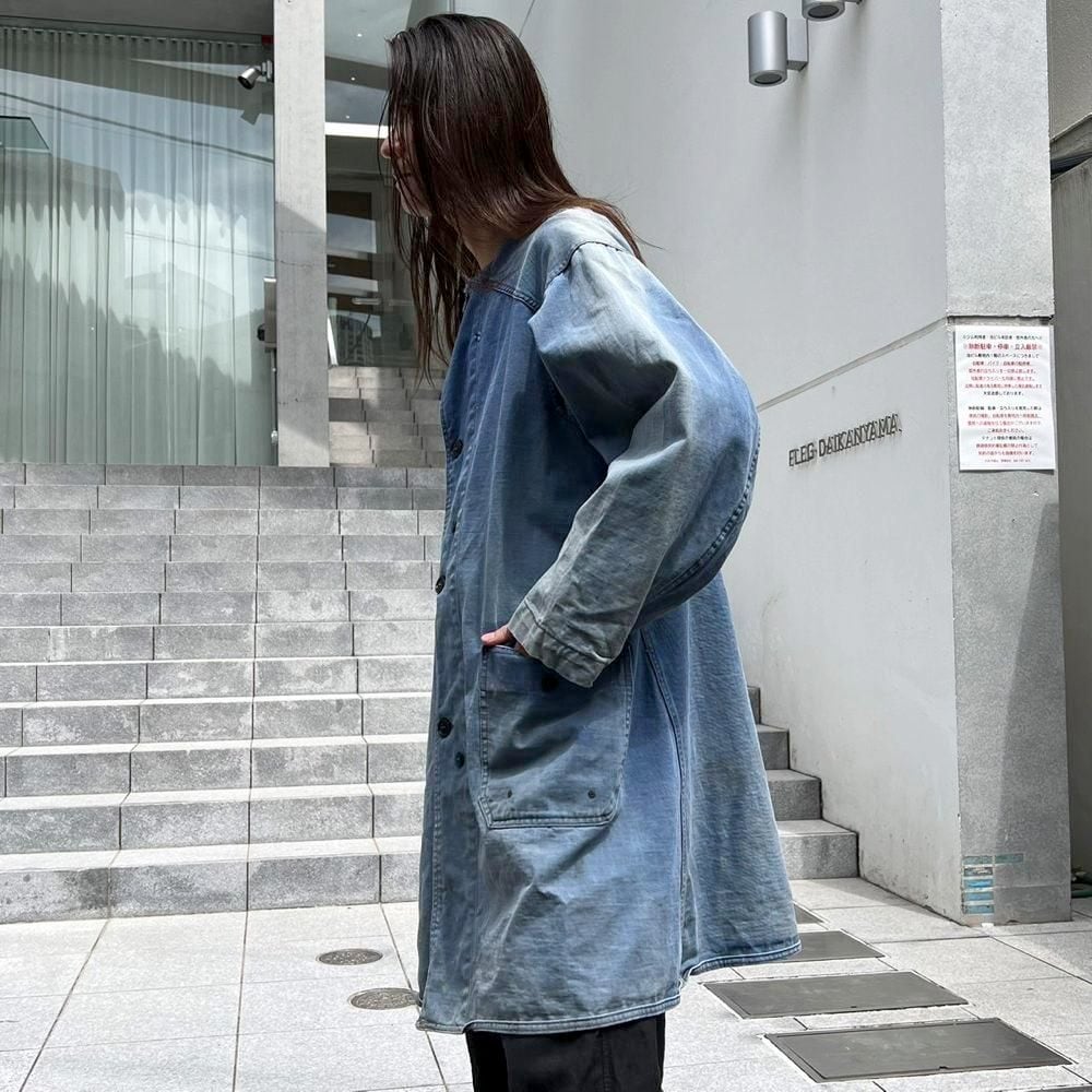 This minimalist work coat features a 1950s Euro-vintage design with no collar or pocket flaps. The artistically faded navy color creates a unique look. This light coat has a relaxed, oversized silhouette that can be worn loosely.