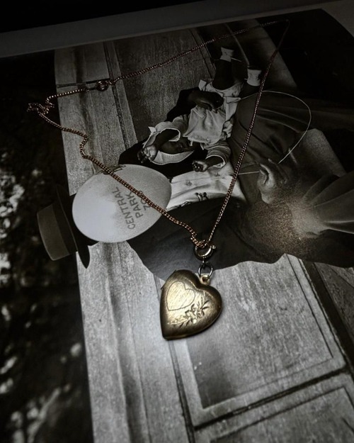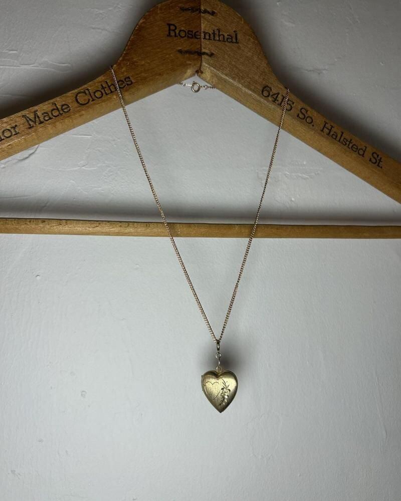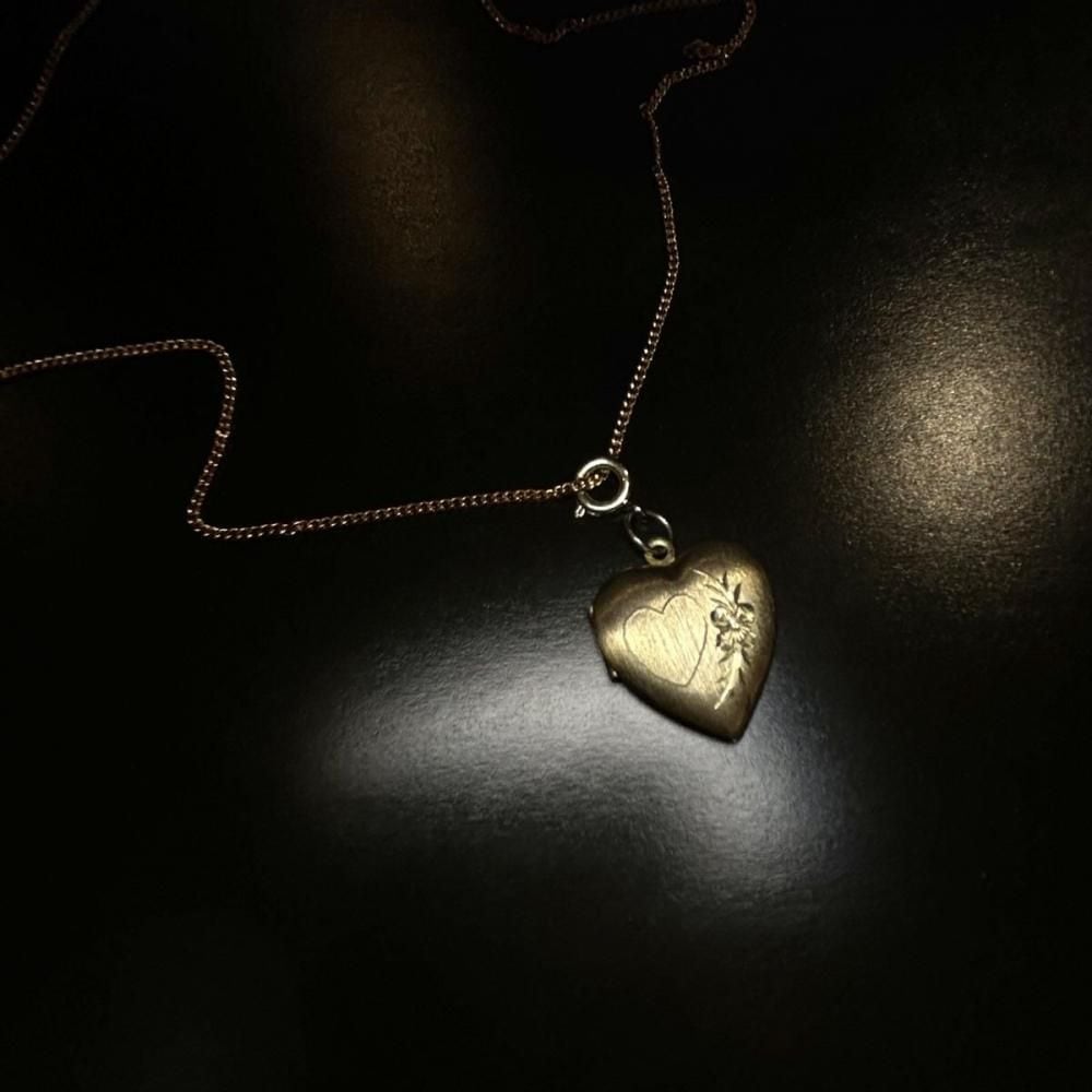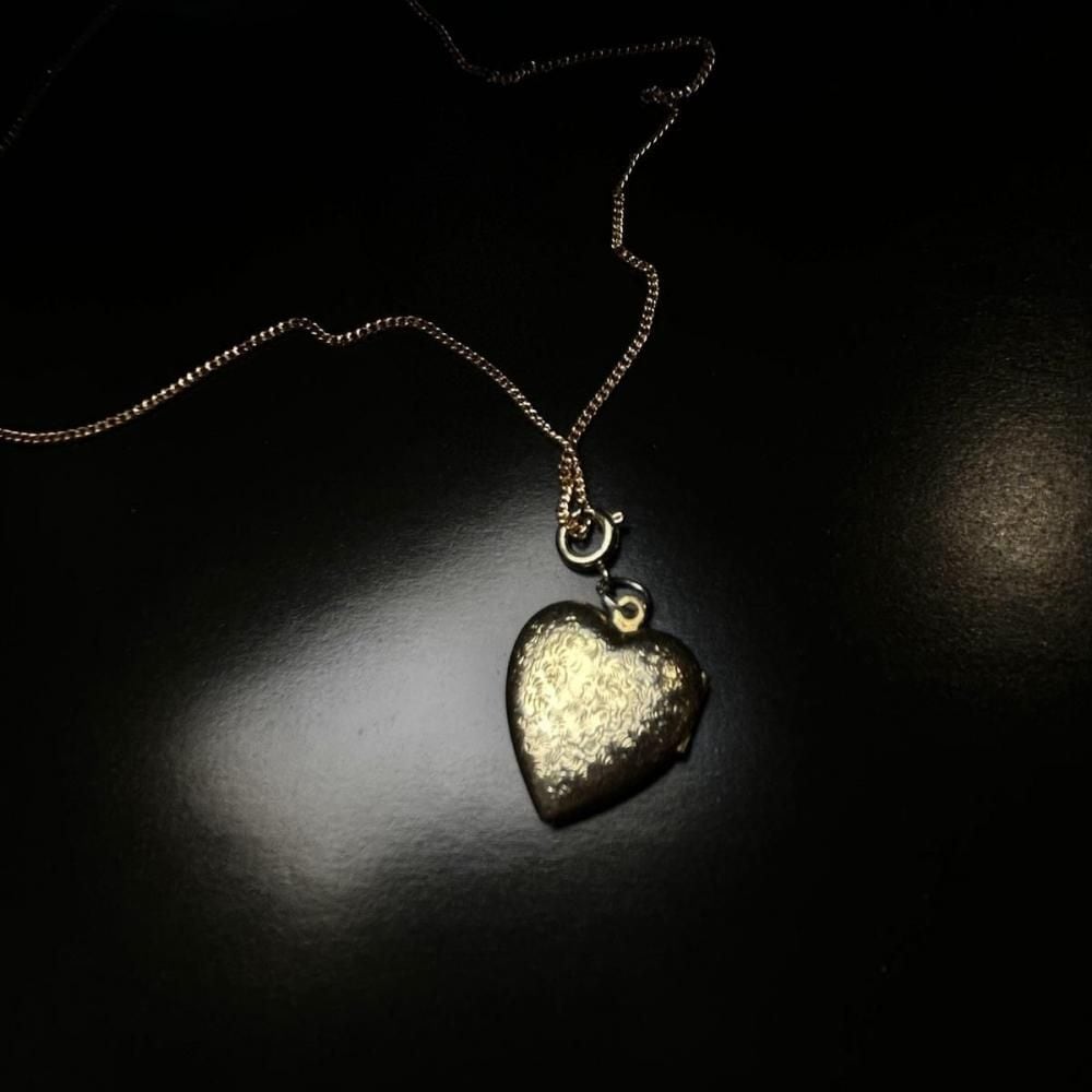 This item was a gift given by couples during wartime from the early 1900s through World War II. This locket-style necklace features a medium-sized heart and flower motif engraved on the top and a hammered back, creating an elegant piece. The chain is made of alloy and gold-plated. As this is an old item, there may be some fading and minor scratches due to age. Please review the photos and understand the characteristics of vintage items before purchasing.