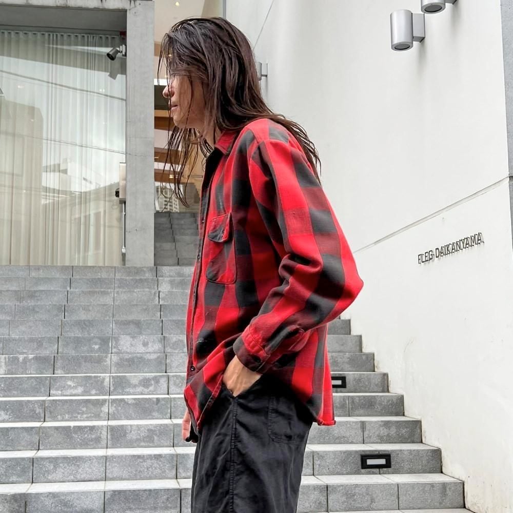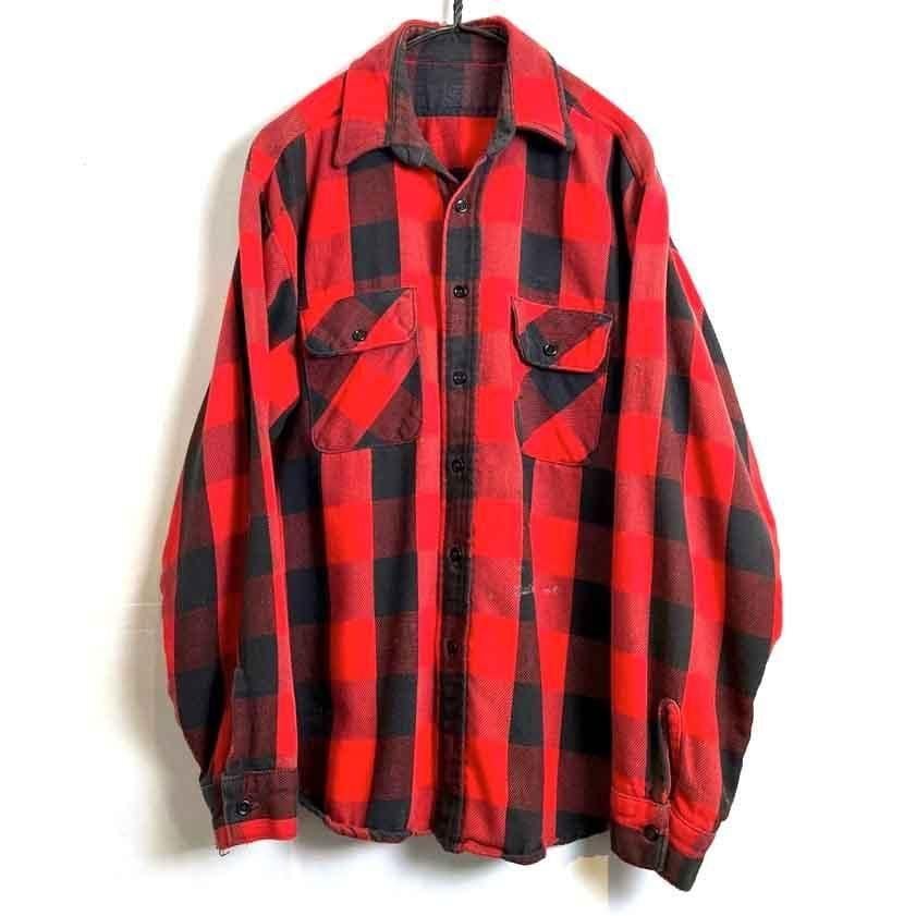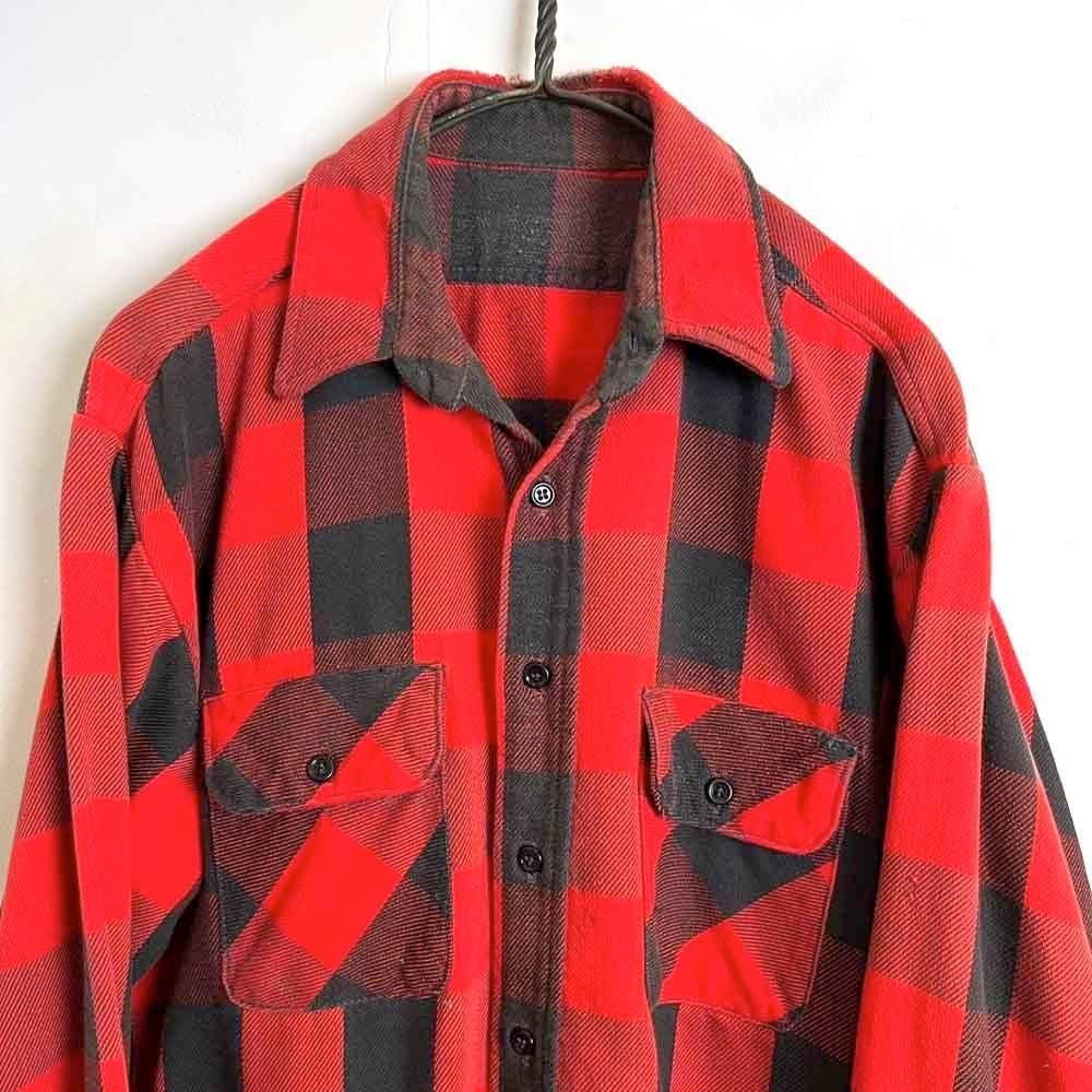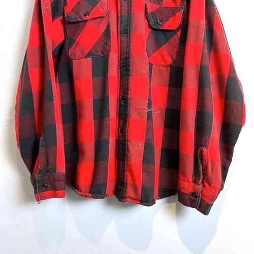This 1980s heavy flannel shirt features a faded red and black buffalo check pattern and a worn, soft, and worn heavy flannel look. It exudes a rustic vibe, making it a very cool piece. Its a comfortable fit.