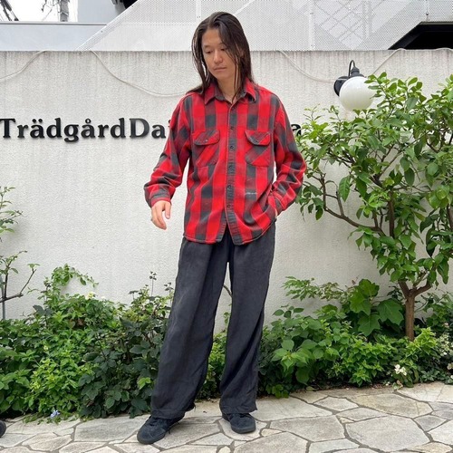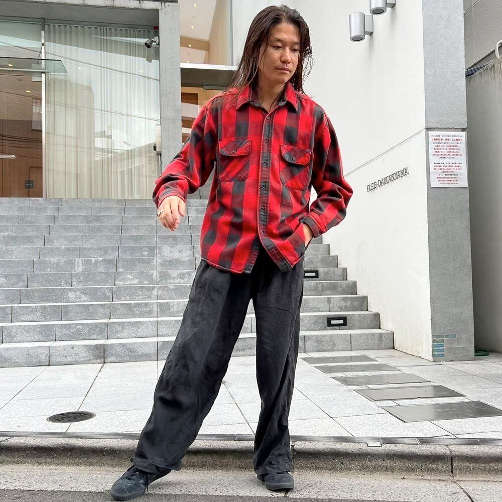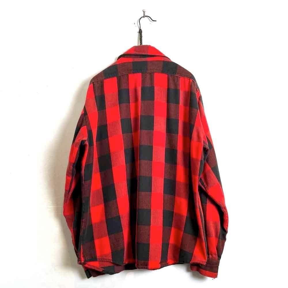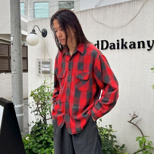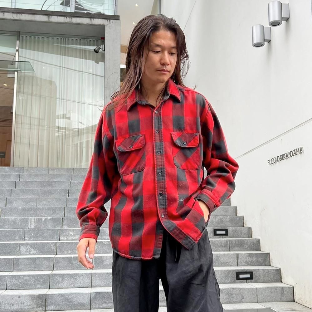 This 1980s heavy flannel shirt features a faded red and black buffalo check pattern and a worn, soft, and worn heavy flannel look. It exudes a rustic vibe, making it a very cool piece. Its a comfortable fit.