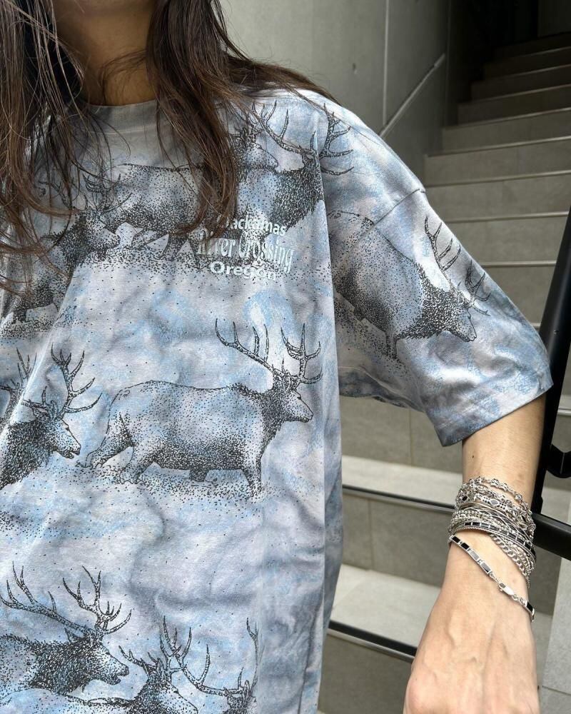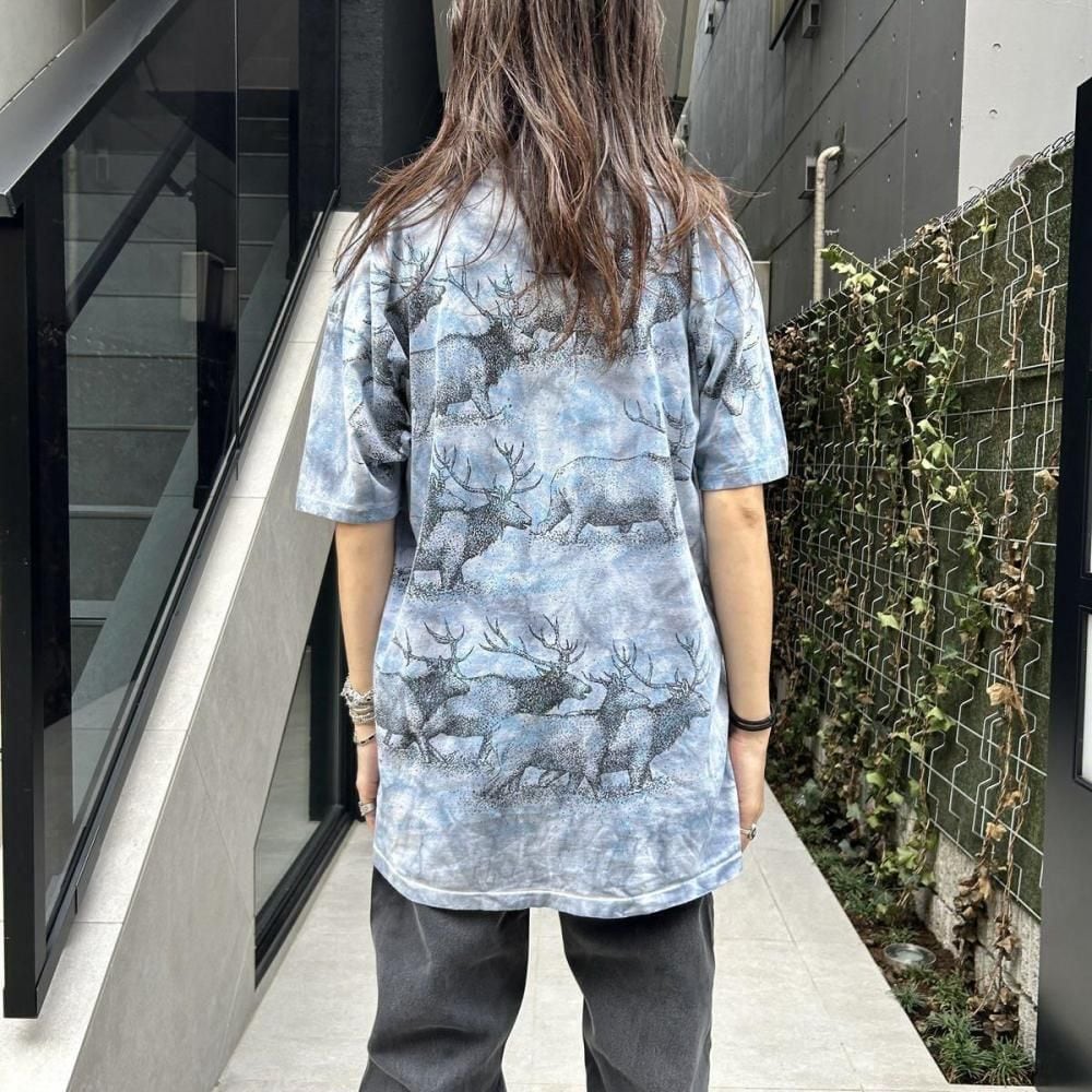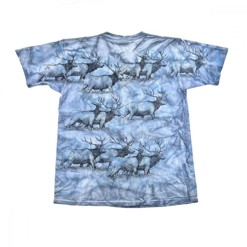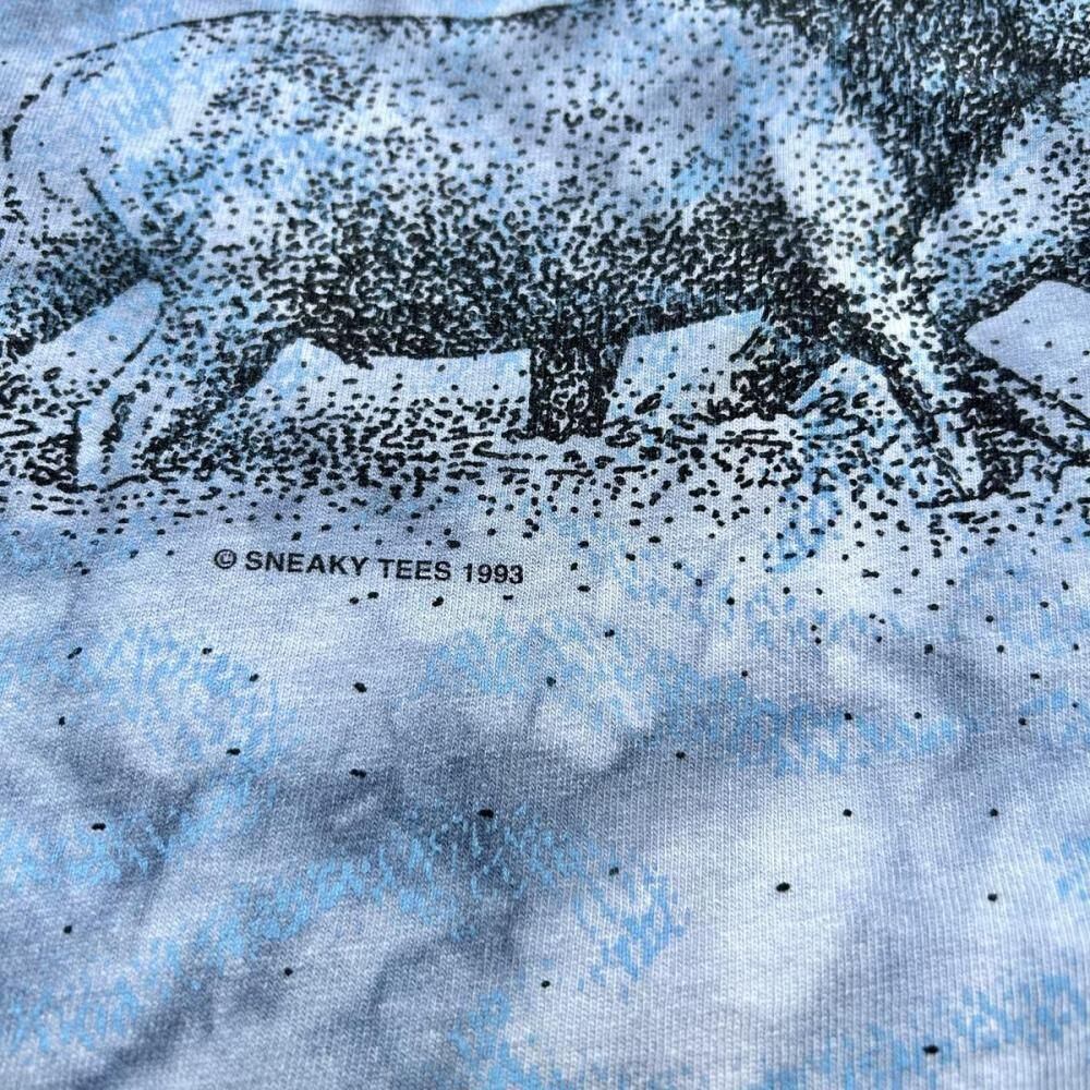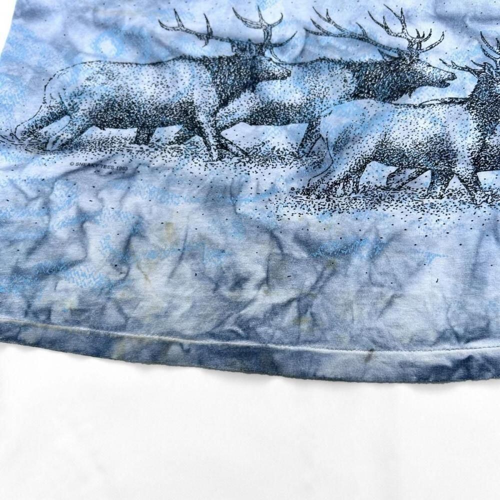 This souvenir T-shirt is from the 1990s. The all-over moose print is tie-dyed, creating a unique and artistic look. Its probably an XL size, with a relaxed silhouette. As this is an old item, there may be some minor signs of aging. Please review the photos and understand the characteristics of vintage items before purchasing.