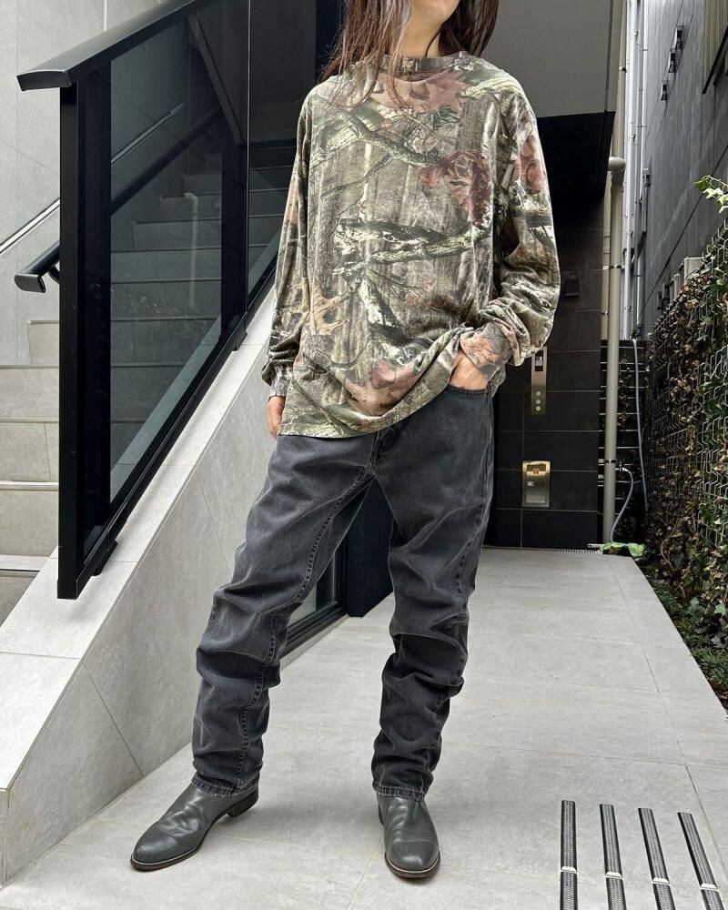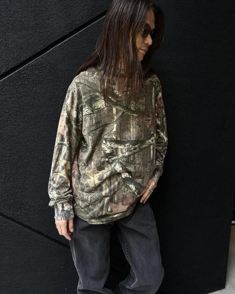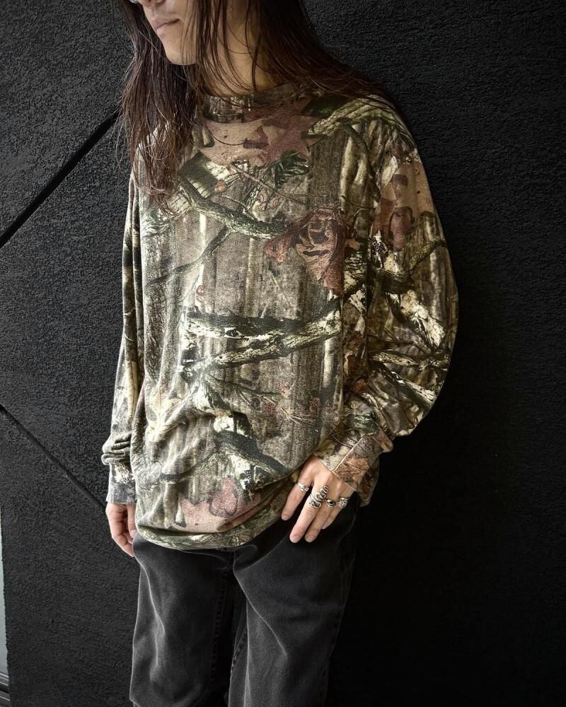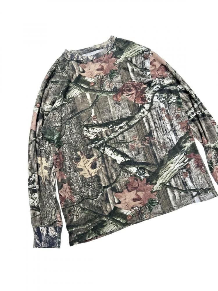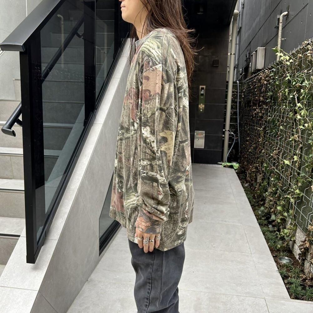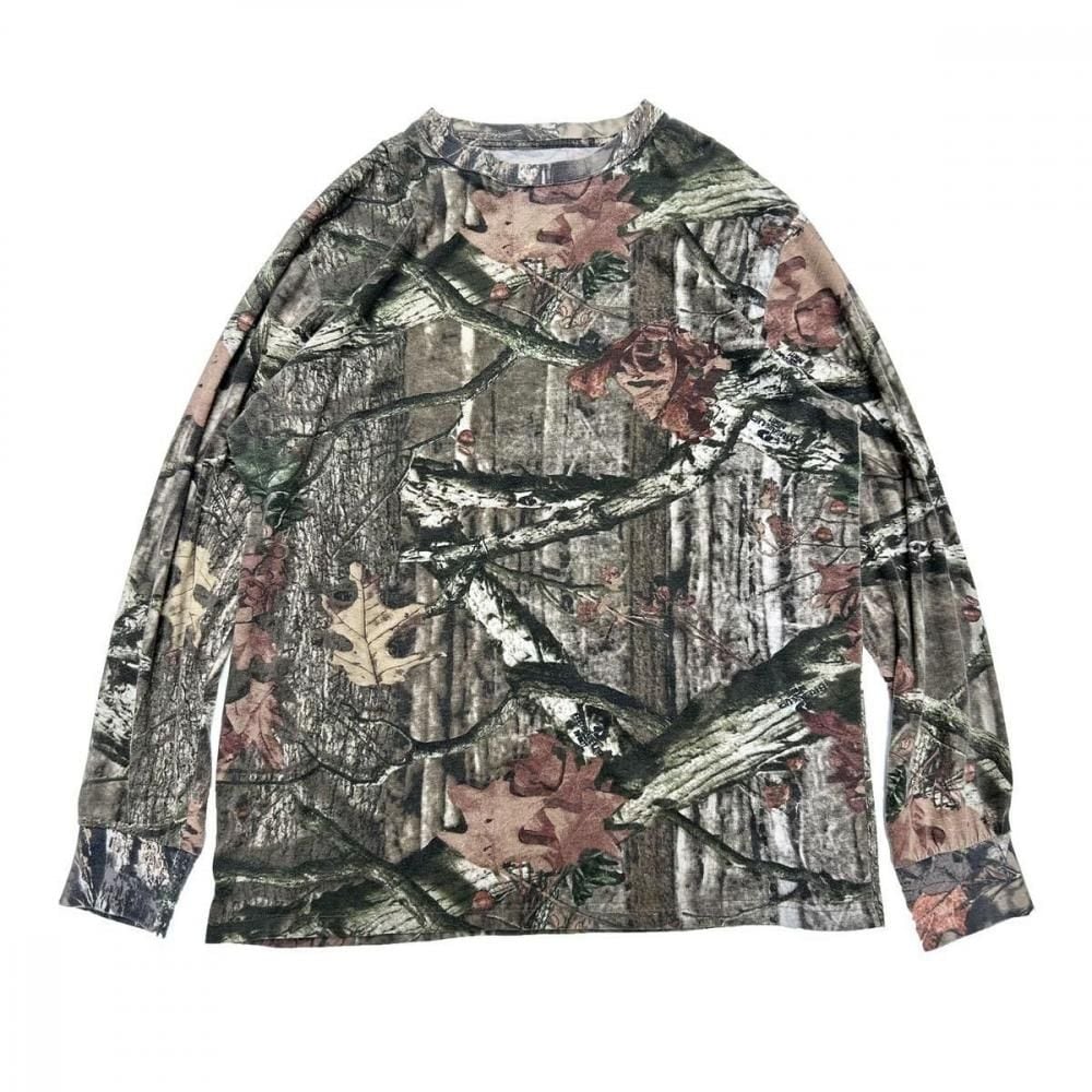 This tree camouflage T-shirt from the 2000s features a realistic forest design, a hunting camouflage pattern seen from the 1990s to the 2000s. Its artistic feel and versatile design complement any outfit. The faded print adds a touch of elegance. The 2XL size offers a relaxed silhouette. As this is an old item, there may be some slight fading over time. Please review the photos and understand the unique characteristics of vintage items before purchasing.