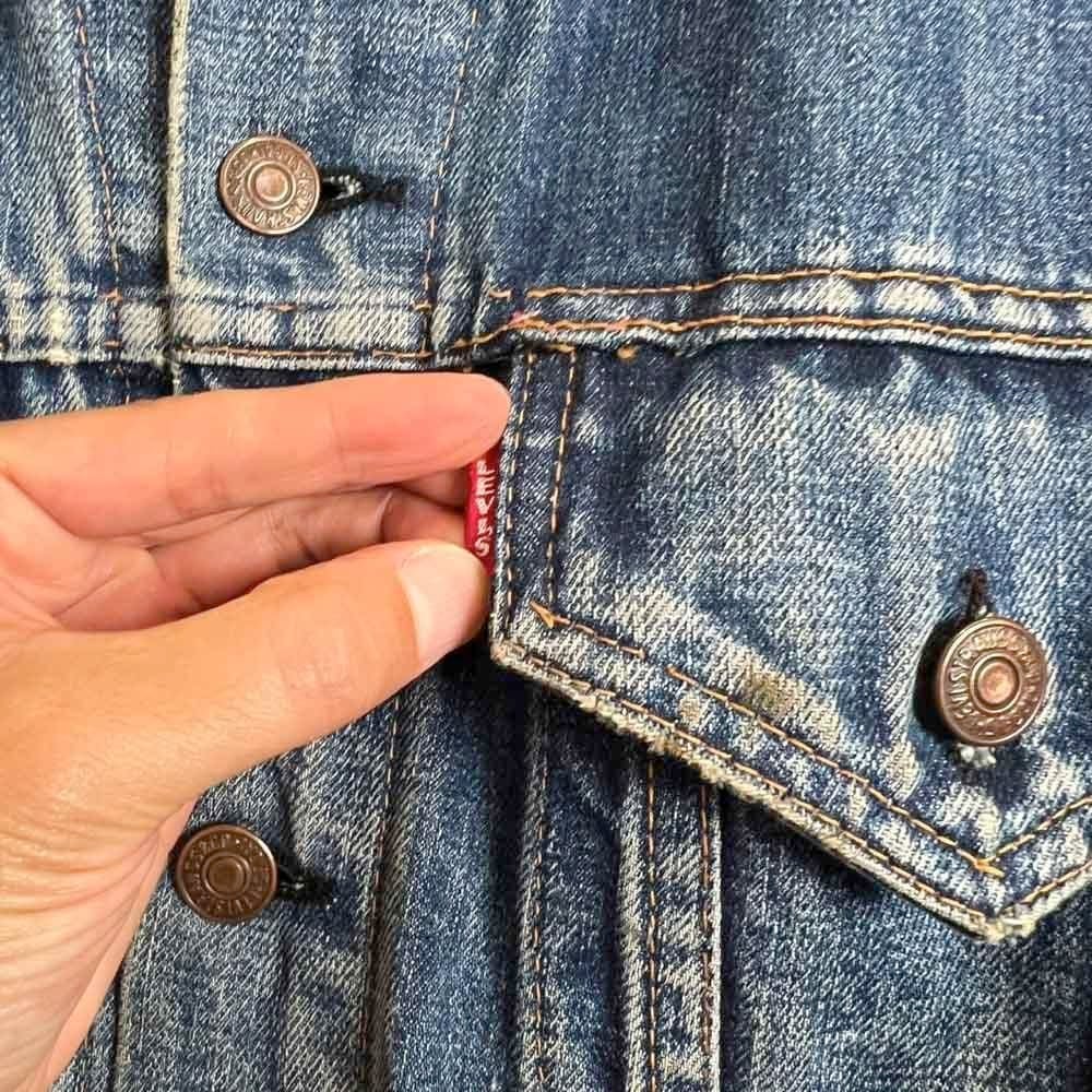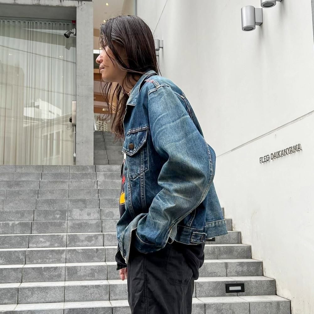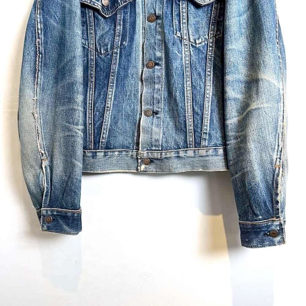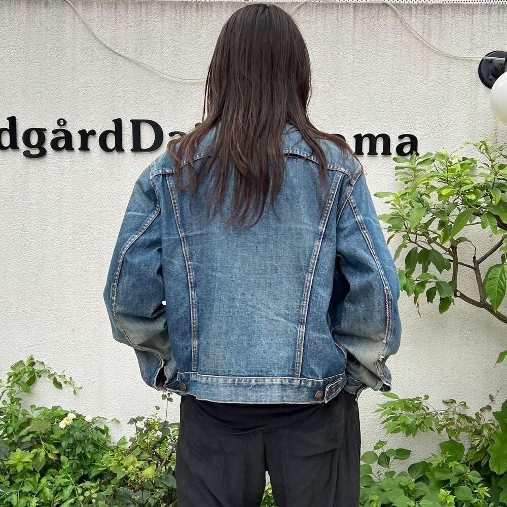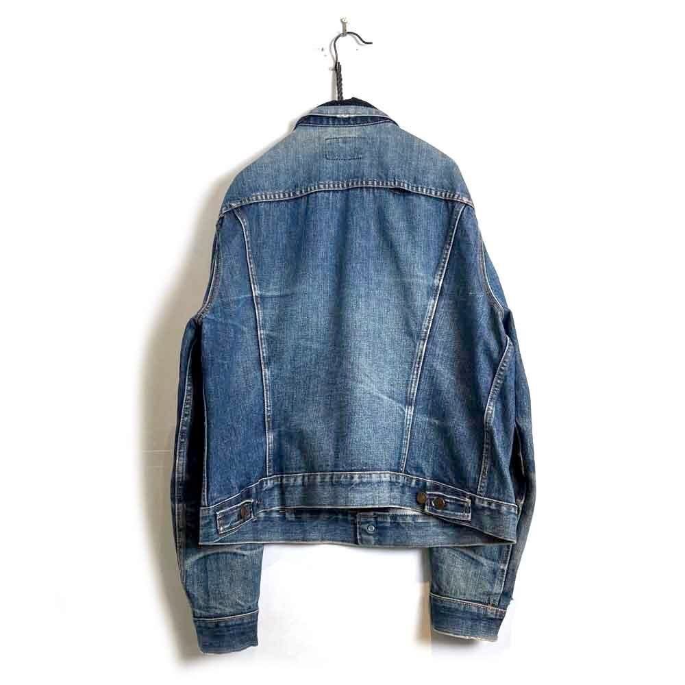 This Levis 70505 Big E denim jacket from the 1970s features a beautiful, tasteful indigo fade, pink hand stitching, and a repaired collar with a separate piece of fabric. While I cant confirm the size, it fits me like a size 46 and has a relaxed silhouette.