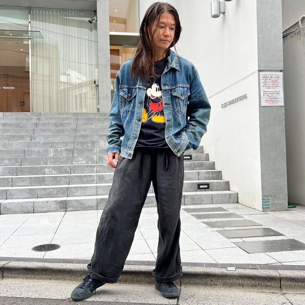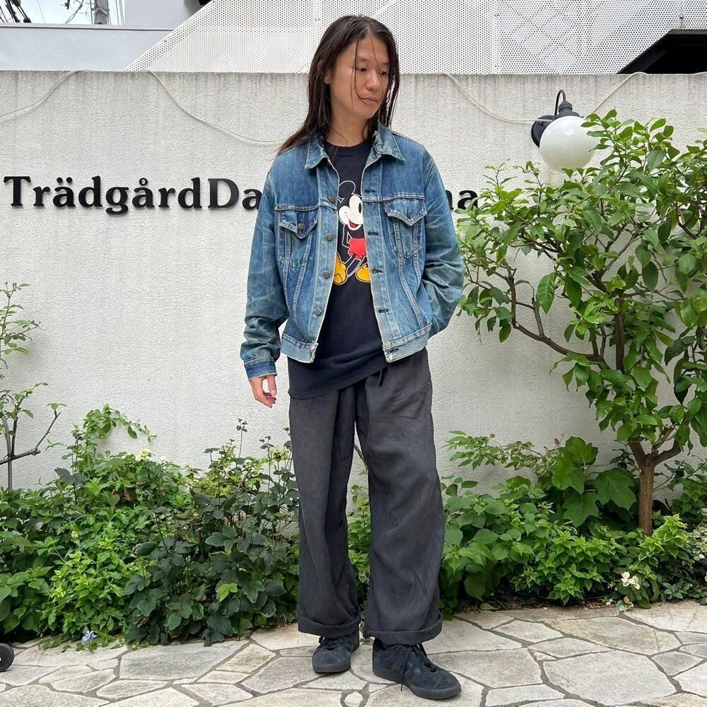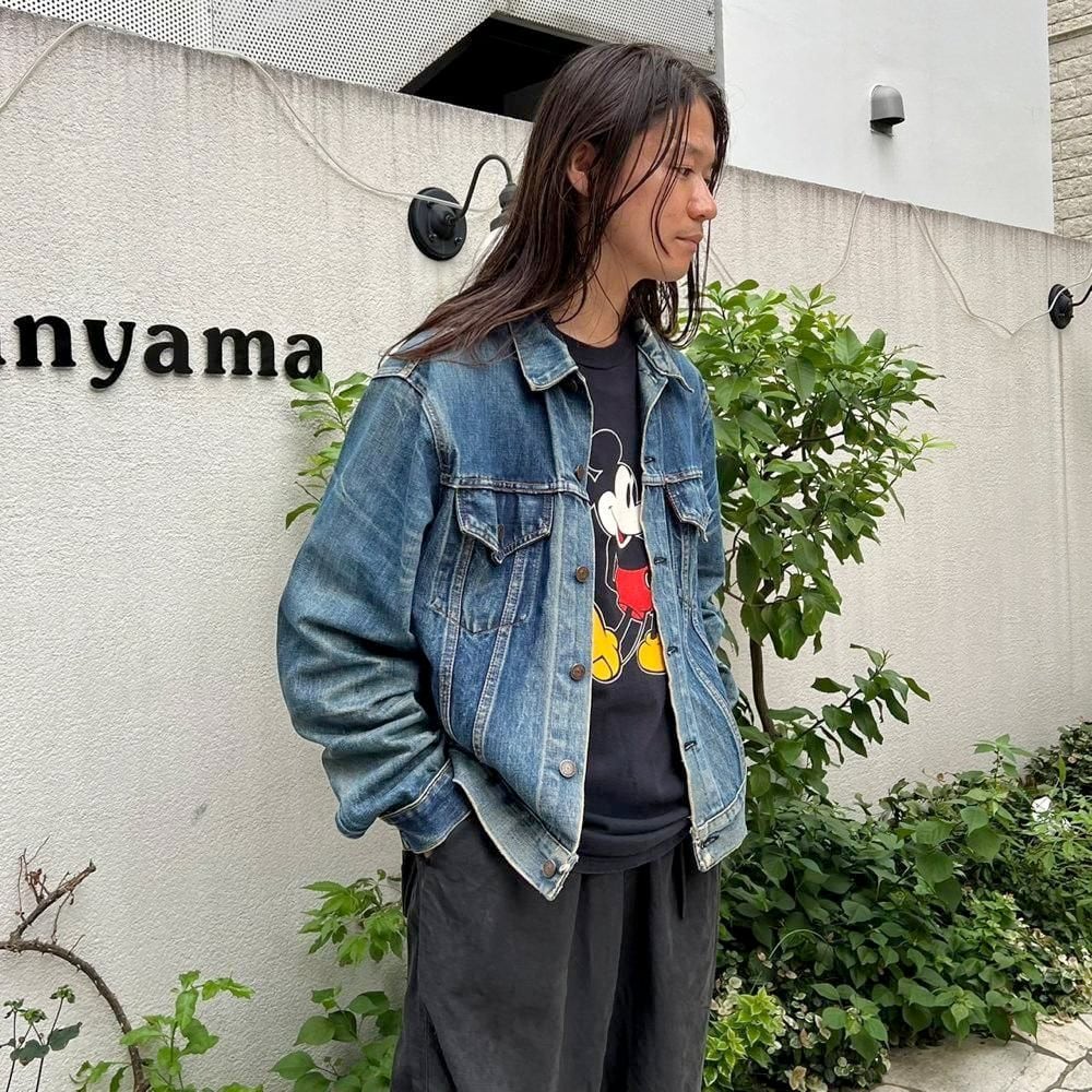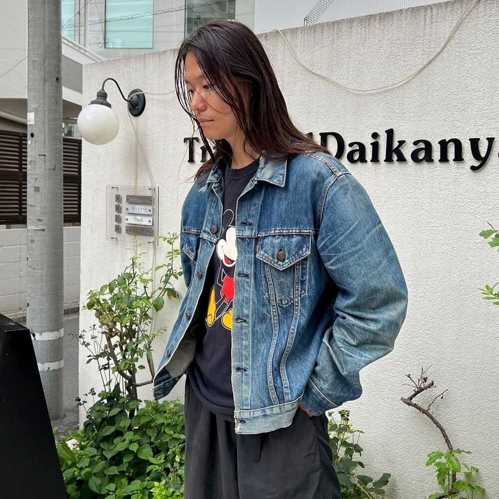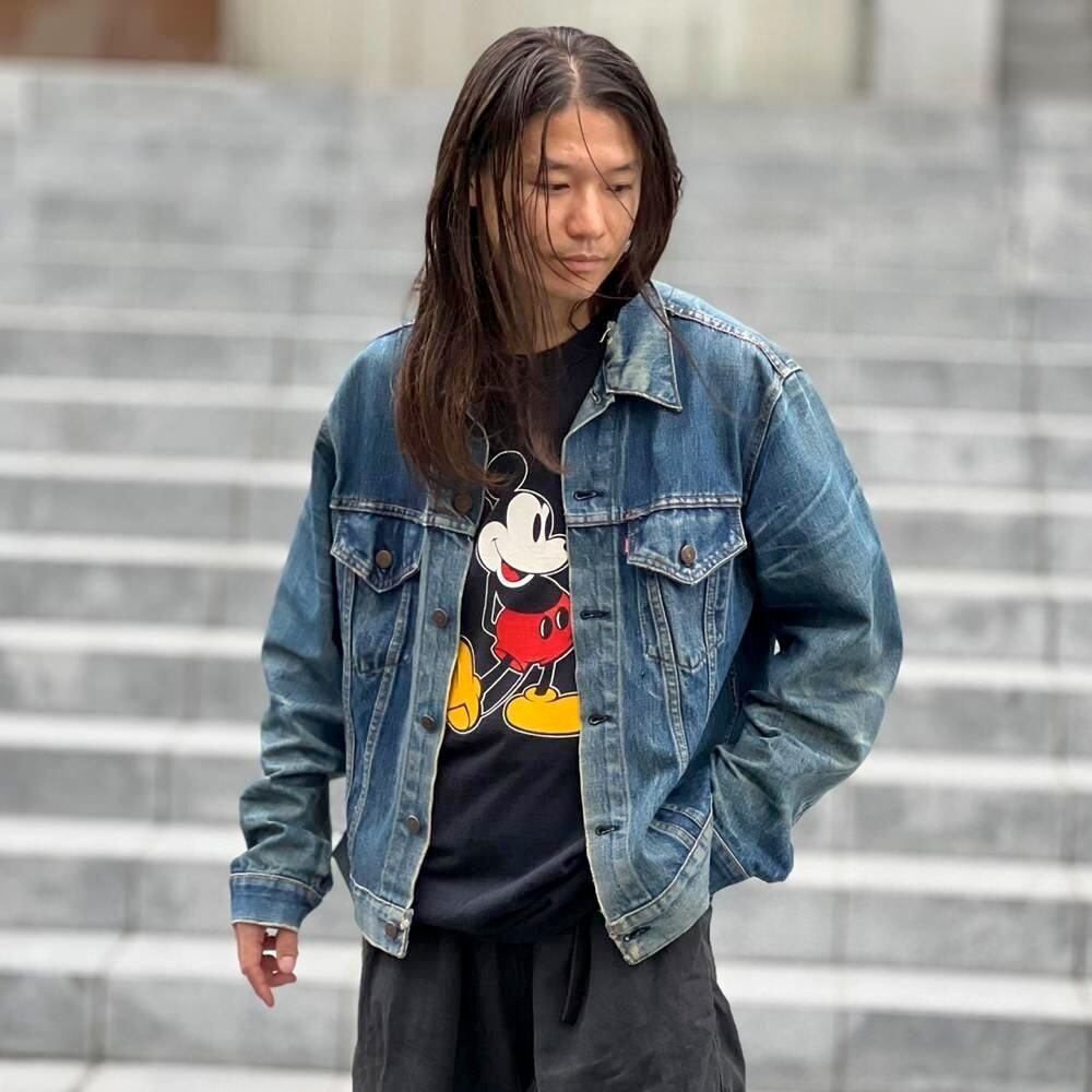 This Levis 70505 Big E denim jacket from the 1970s features a beautiful, tasteful indigo fade, pink hand stitching, and a repaired collar with a separate piece of fabric. While I cant confirm the size, it fits me like a size 46 and has a relaxed silhouette.