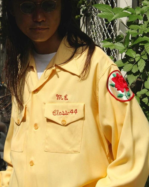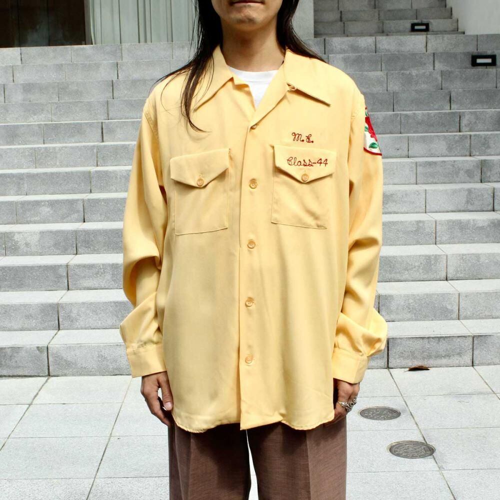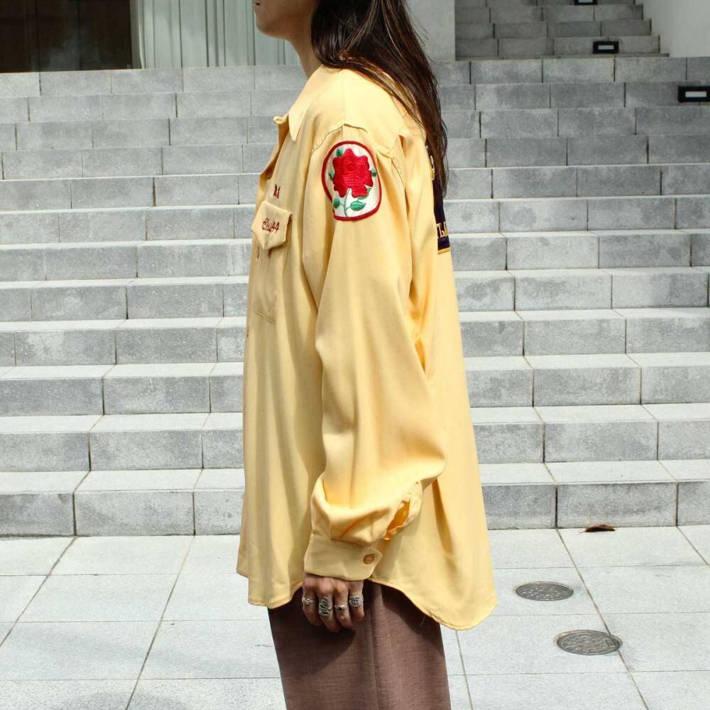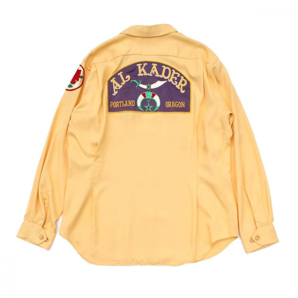 This is a rare long-sleeved bowling shirt, produced until the 1950s. Crafted from a medium-weight rayon twill, it has a smooth, drapey feel. The vintage-inspired mustard yellow color creates a mannish and elegant look. Shriners patch and rose-motif patches complement the body color. While listed as a size L, its a very large size rarely seen in vintage clothing, and the shirt cut creates a more relaxed silhouette. As this is an old item, there may be some fading over time. Please review the photos and understand the characteristics of vintage clothing before purchasing.