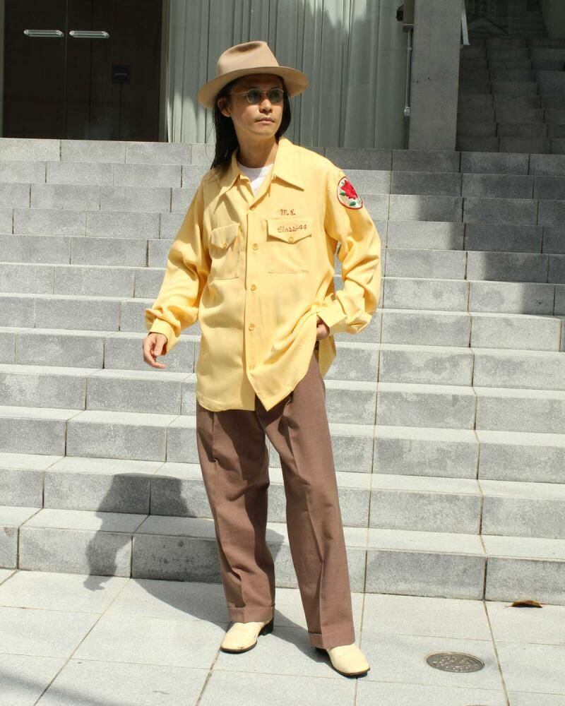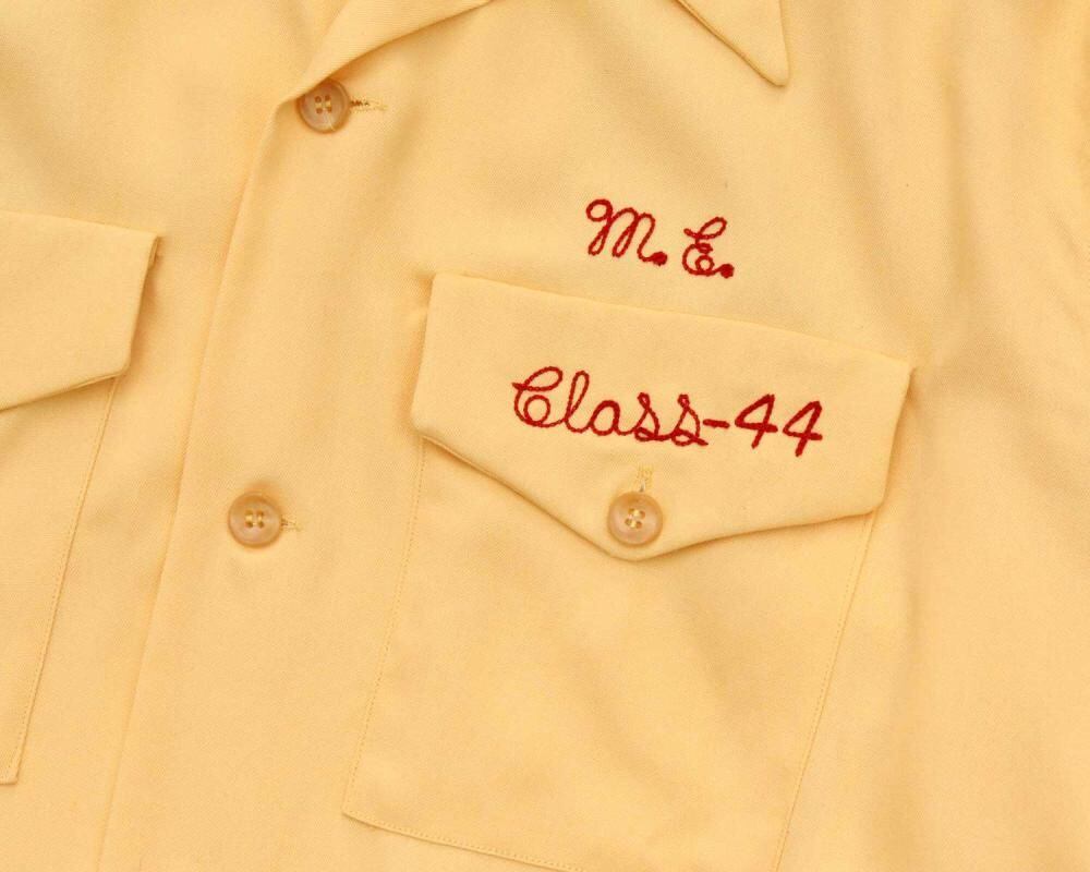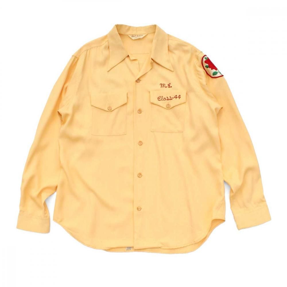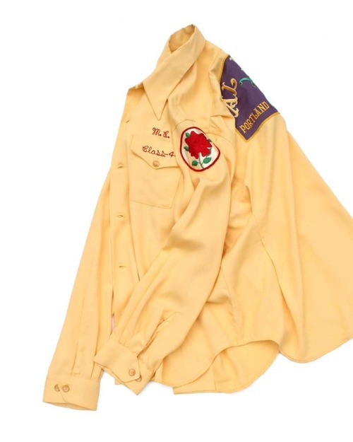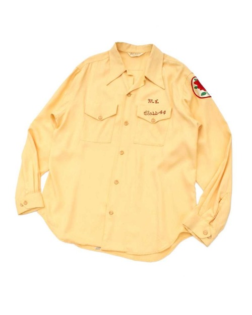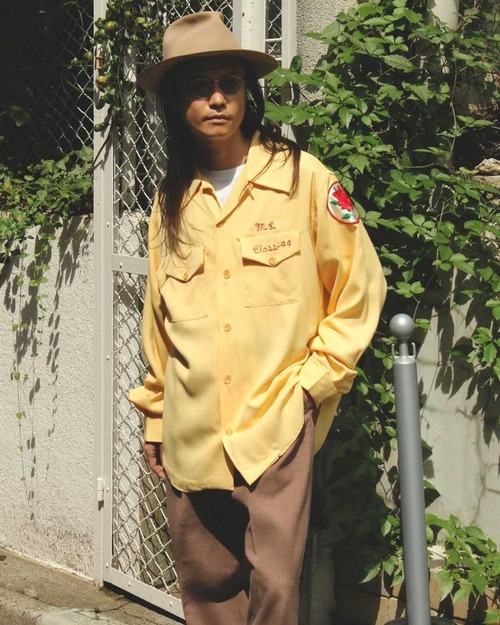 This is a rare long-sleeved bowling shirt, produced until the 1950s. Crafted from a medium-weight rayon twill, it has a smooth, drapey feel. The vintage-inspired mustard yellow color creates a mannish and elegant look. Shriners patch and rose-motif patches complement the body color. While listed as a size L, its a very large size rarely seen in vintage clothing, and the shirt cut creates a more relaxed silhouette. As this is an old item, there may be some fading over time. Please review the photos and understand the characteristics of vintage clothing before purchasing.