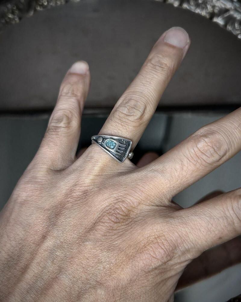 This vintage ring features a healing hand, a symbol of Native American culture, at the center. Its minimalist design and pinky-sized hoop create an elegant piece. As this is a vintage item, there may be some wear and tear. Please review the photos and understand the characteristics of vintage and antique items before purchasing.