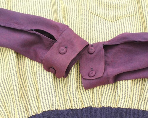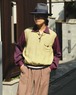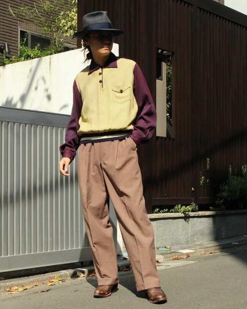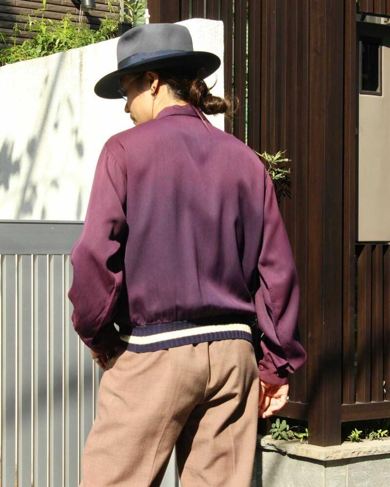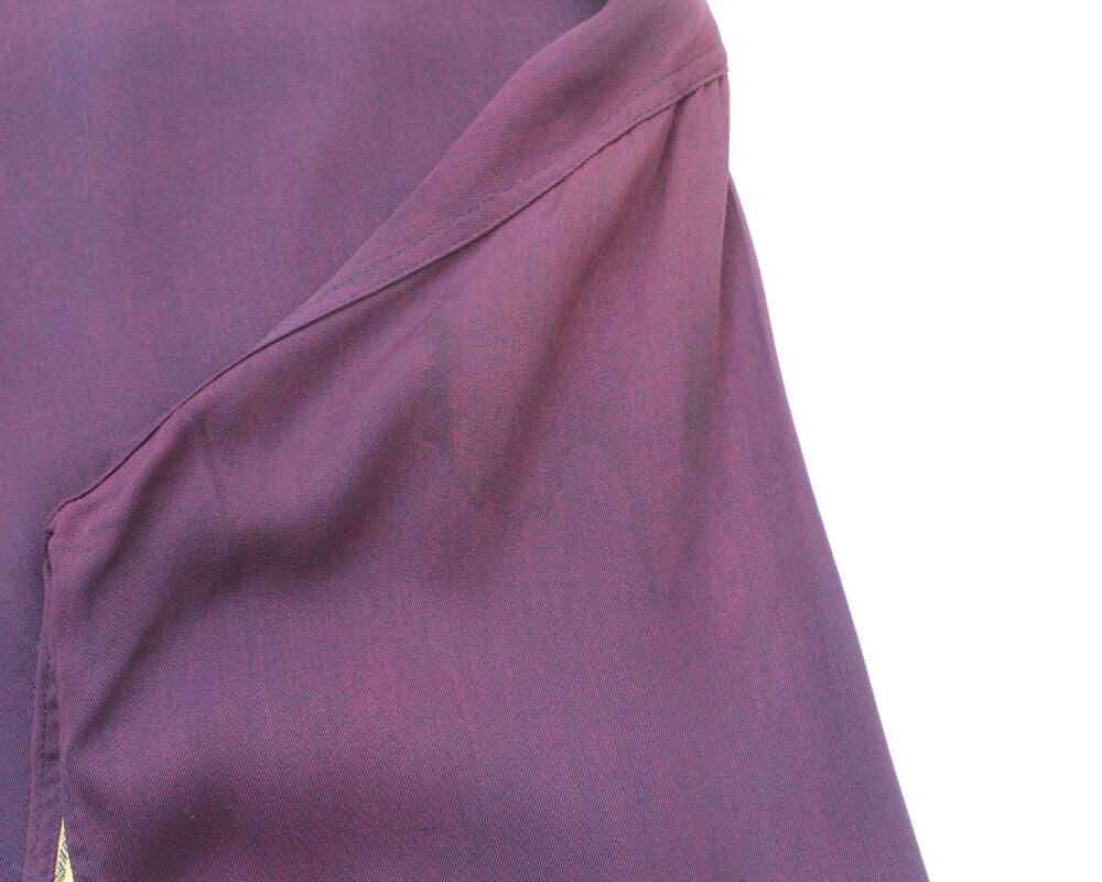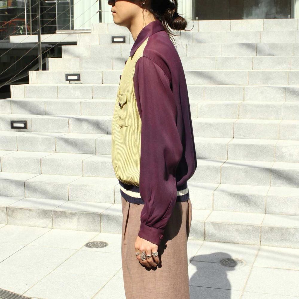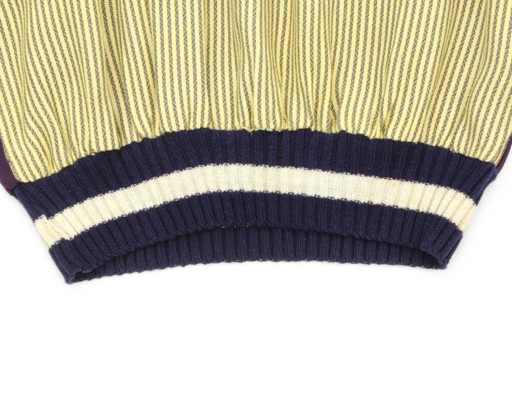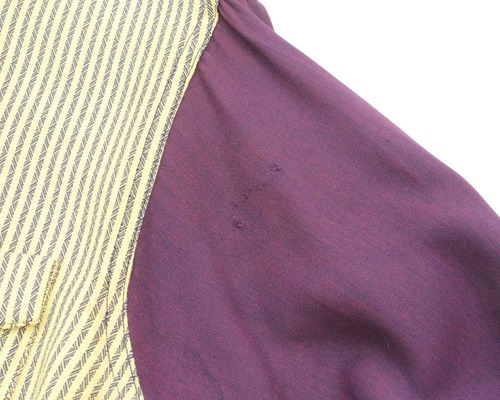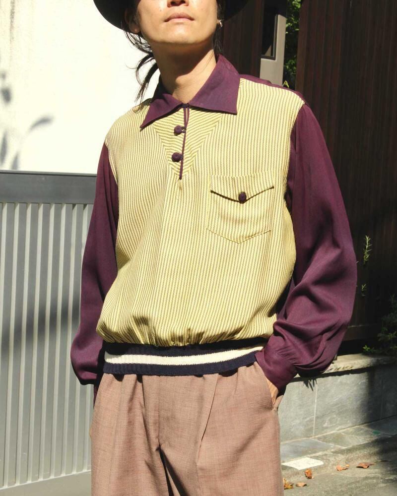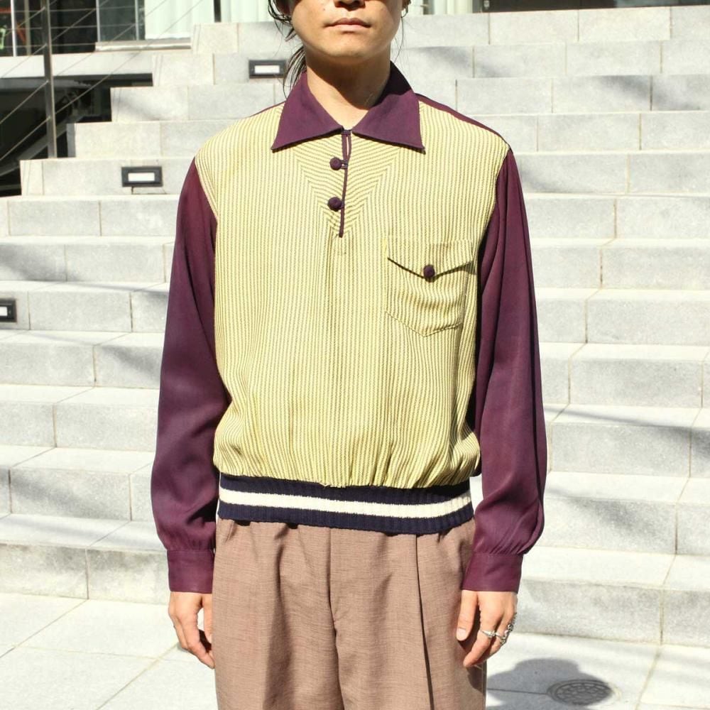 This pullover shirt dates back to the 1950s. Its two-tone body features a deep, aged eggplant navy blue fabric with blue and reddish-purple threads interlaced with a pale yellow and black woven pattern. The Henley style, with its three V-shaped buttons, is a rare construction somewhere between a jacket and a shirt. The navy ribbing adds a sporty touch, creating a rude design typical of this era. Its a size M, but its not too small and has a comfortable, relaxed silhouette. As this is an old item, there may be occasional signs of aging. Please review the photos and understand the nature of vintage items before purchasing.