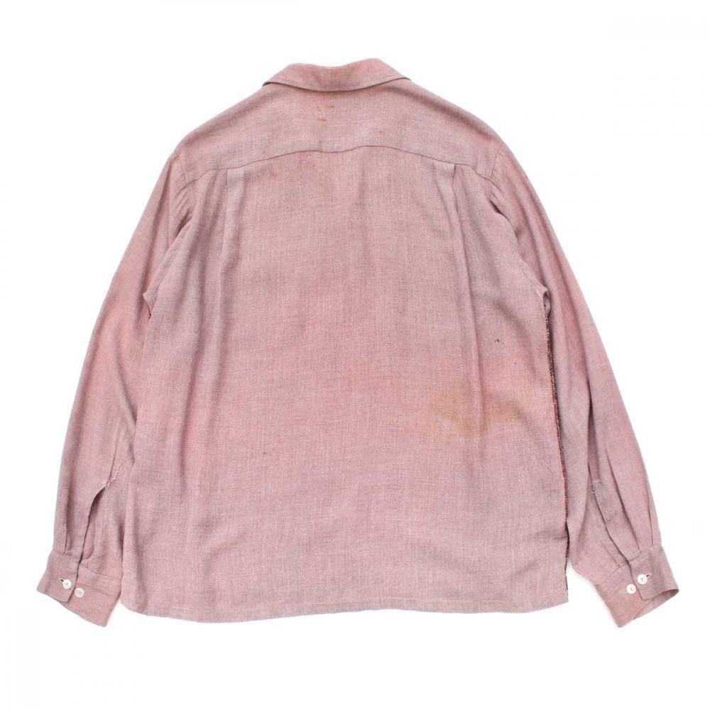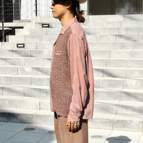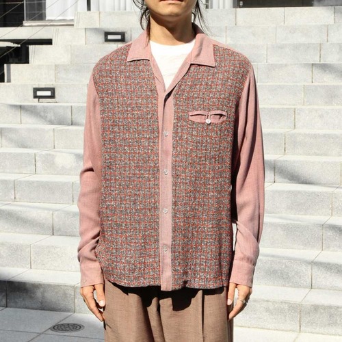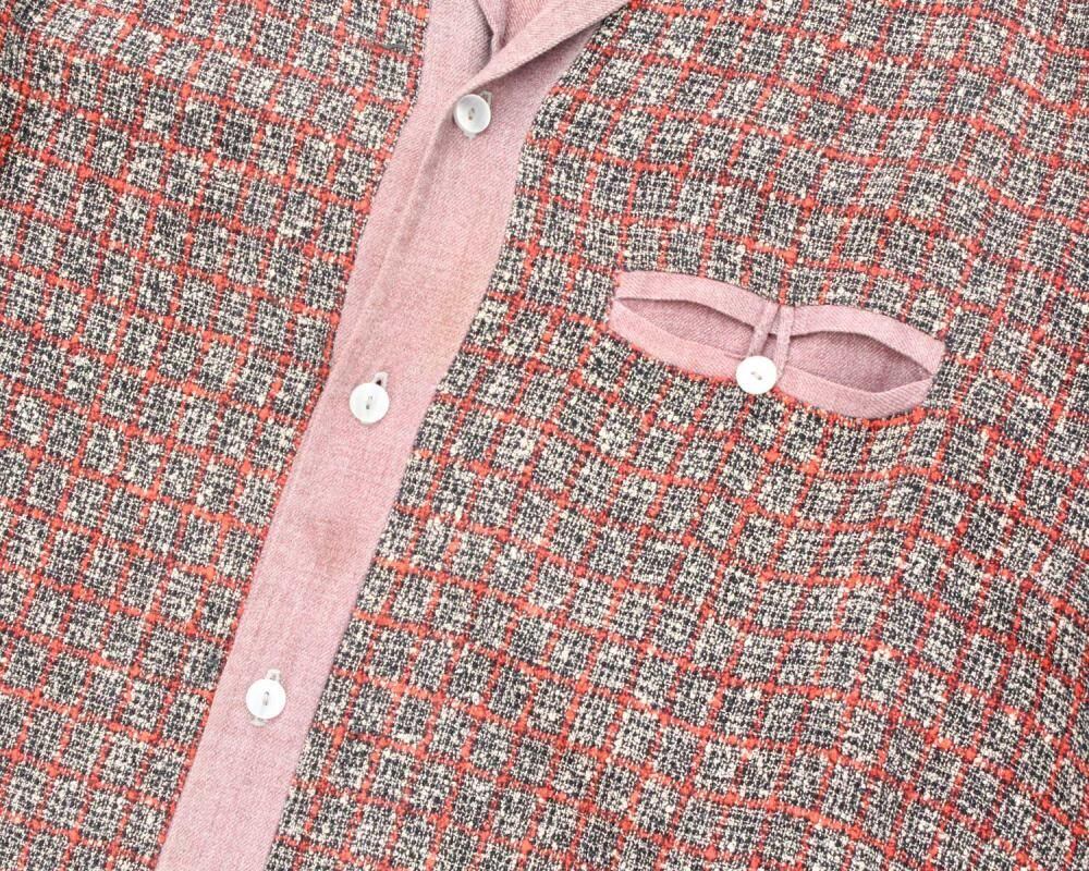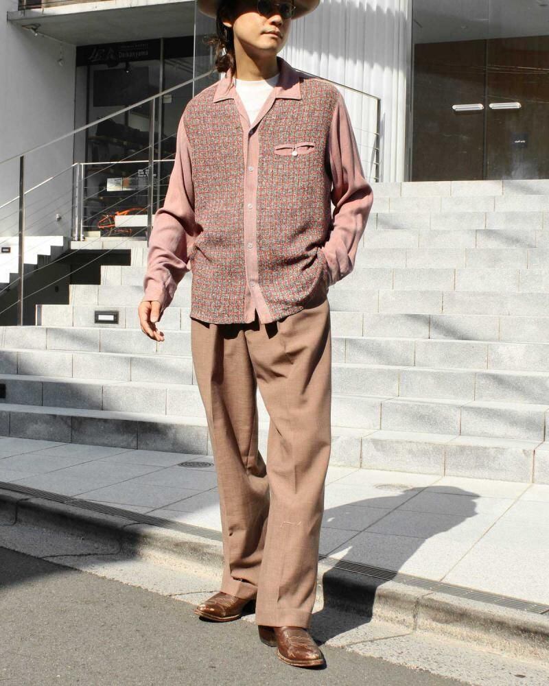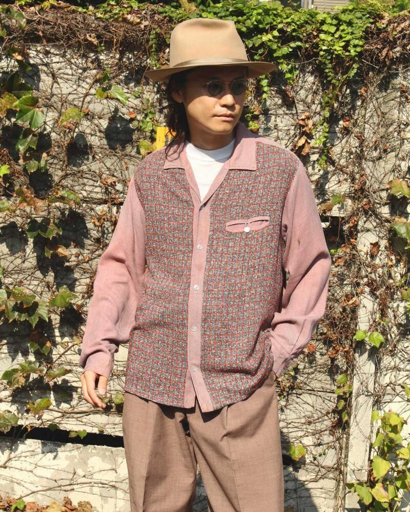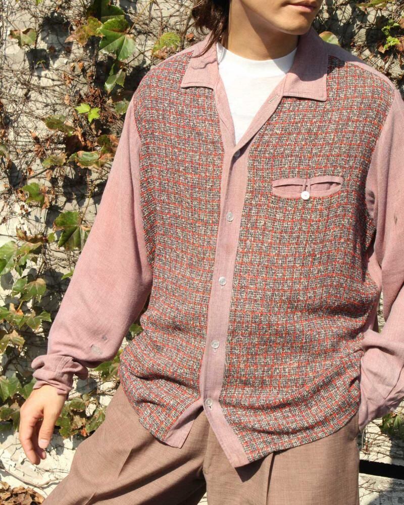 This open-collar shirt dates back to the 1960s. It features a rare design, featuring a rich fabric with a mix of reddish and beige threads, contrasted with a smooth tweed fabric. The soft, medium-weight rayon fabric and the tweed fabric on the front create a sophisticated look. The large size offers a well-balanced silhouette. As this is an old item, there may be some slight fading over time. Please review the photos and understand the characteristics of vintage items before purchasing.