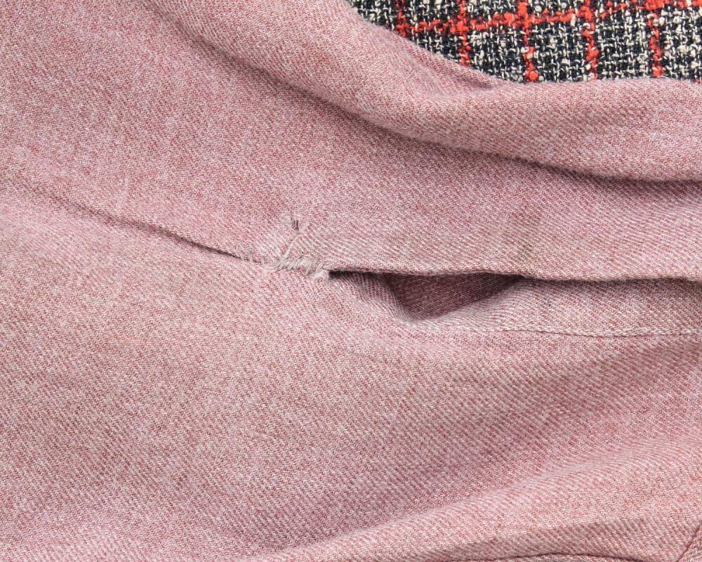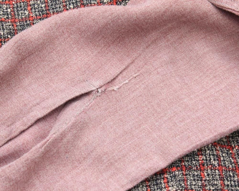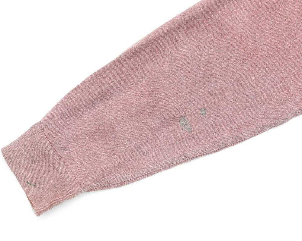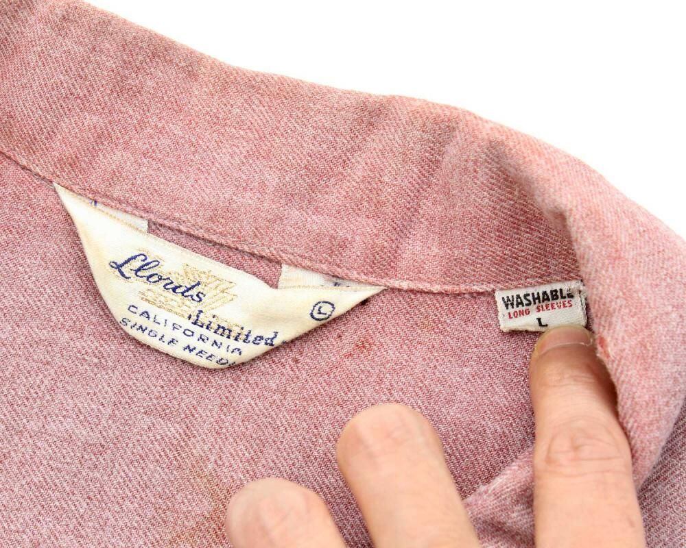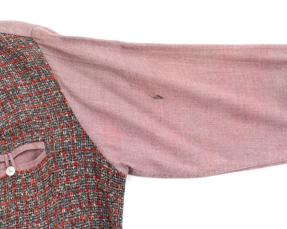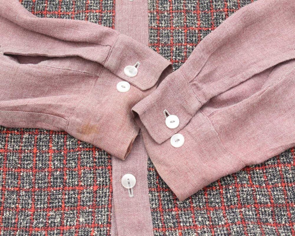 This open-collar shirt dates back to the 1960s. It features a rare design, featuring a rich fabric with a mix of reddish and beige threads, contrasted with a smooth tweed fabric. The soft, medium-weight rayon fabric and the tweed fabric on the front create a sophisticated look. The large size offers a well-balanced silhouette. As this is an old item, there may be some slight fading over time. Please review the photos and understand the characteristics of vintage items before purchasing.