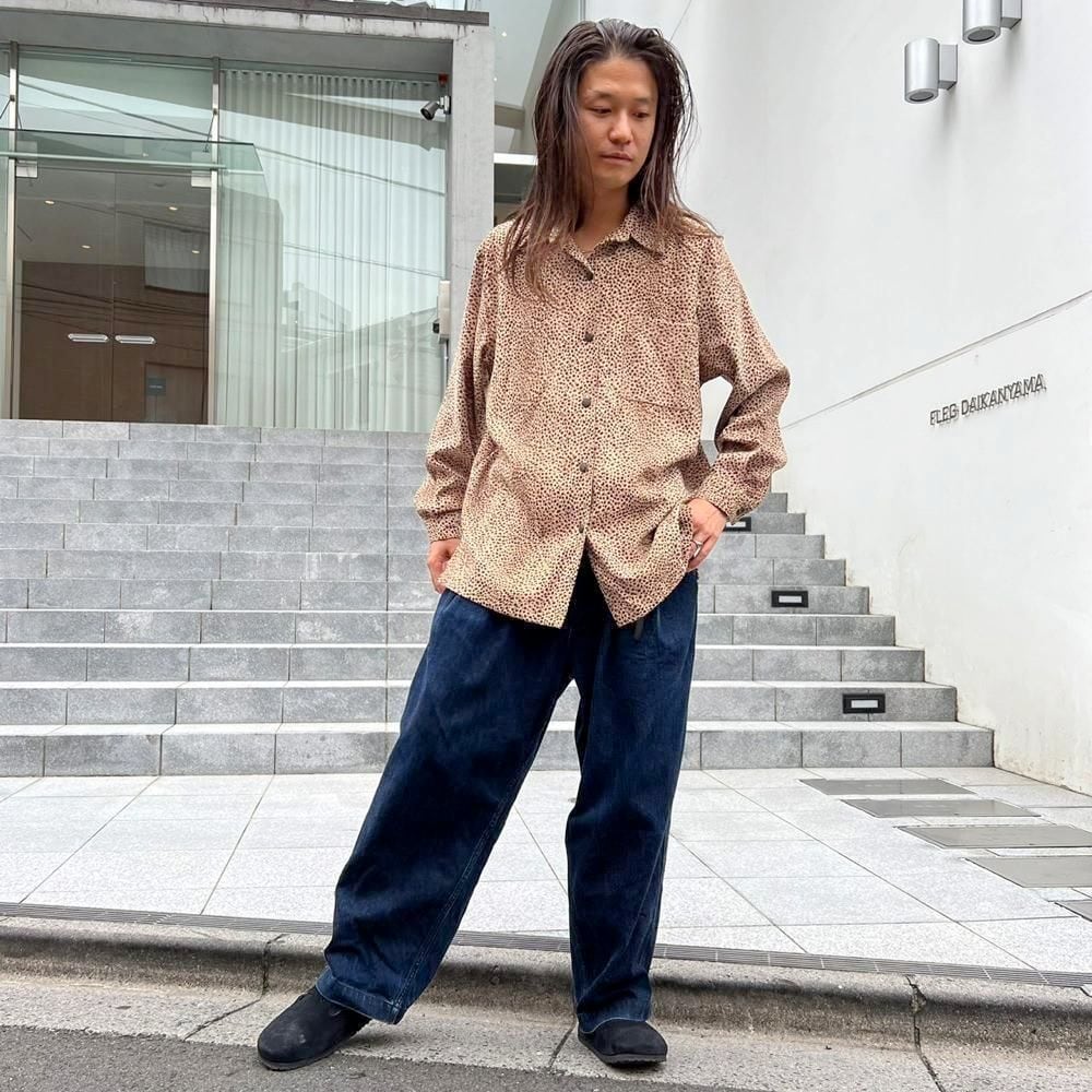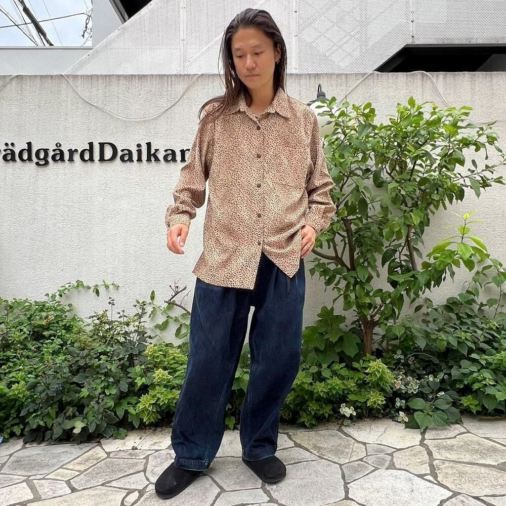 This 90s leopard print shirt features a brushed peach skin polyester fabric that feels smooth against the skin. The beige leopard print creates a soft, non-aggressive look, making it easy to coordinate with other items. It has a relaxed silhouette and a comfortable fit.
