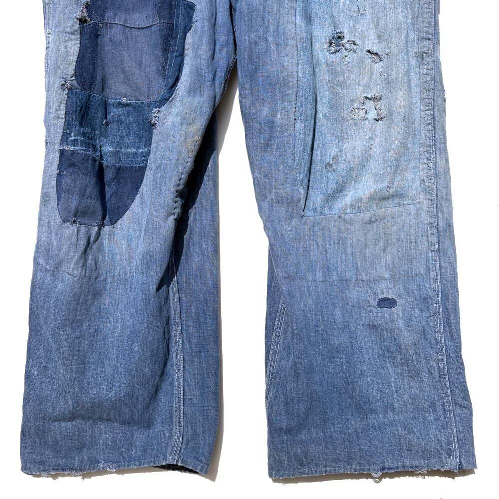 The fabric has softened over the years, giving it a light texture, and the indigo has retained its color and a subtle crease, making it a vintage denim fabric. The damage and repair marks give it an artistic look, making it a special piece with a unique presence.