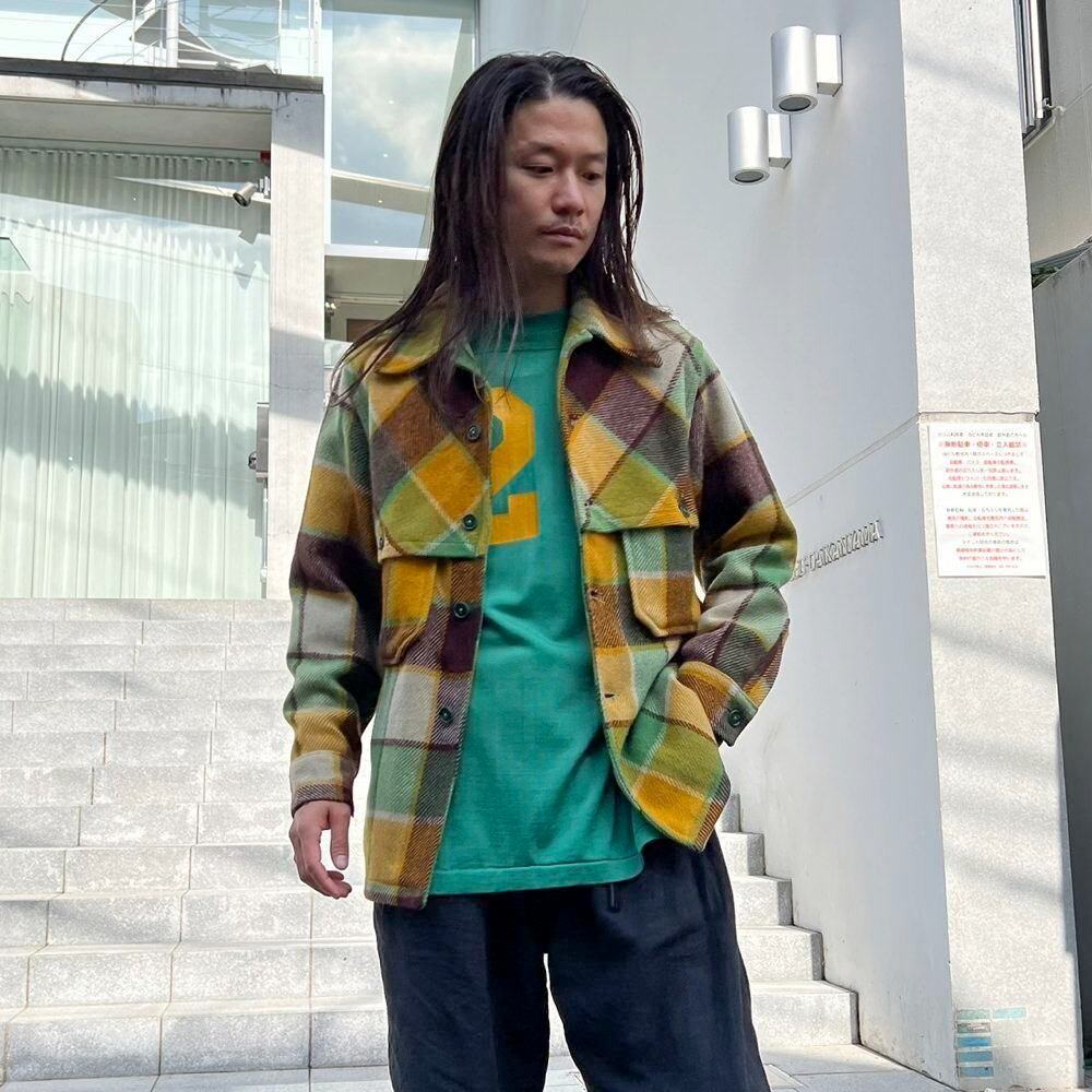 This heavy wool shirt from the 1950s features a check pattern in mustard, green, and brown, a vintage touch thats very appealing. The double-stitched details, with the yoke becoming a pocket flap, are also a nice touch. While theres no size tag, this shirt has a comfortable, roomy fit.