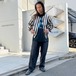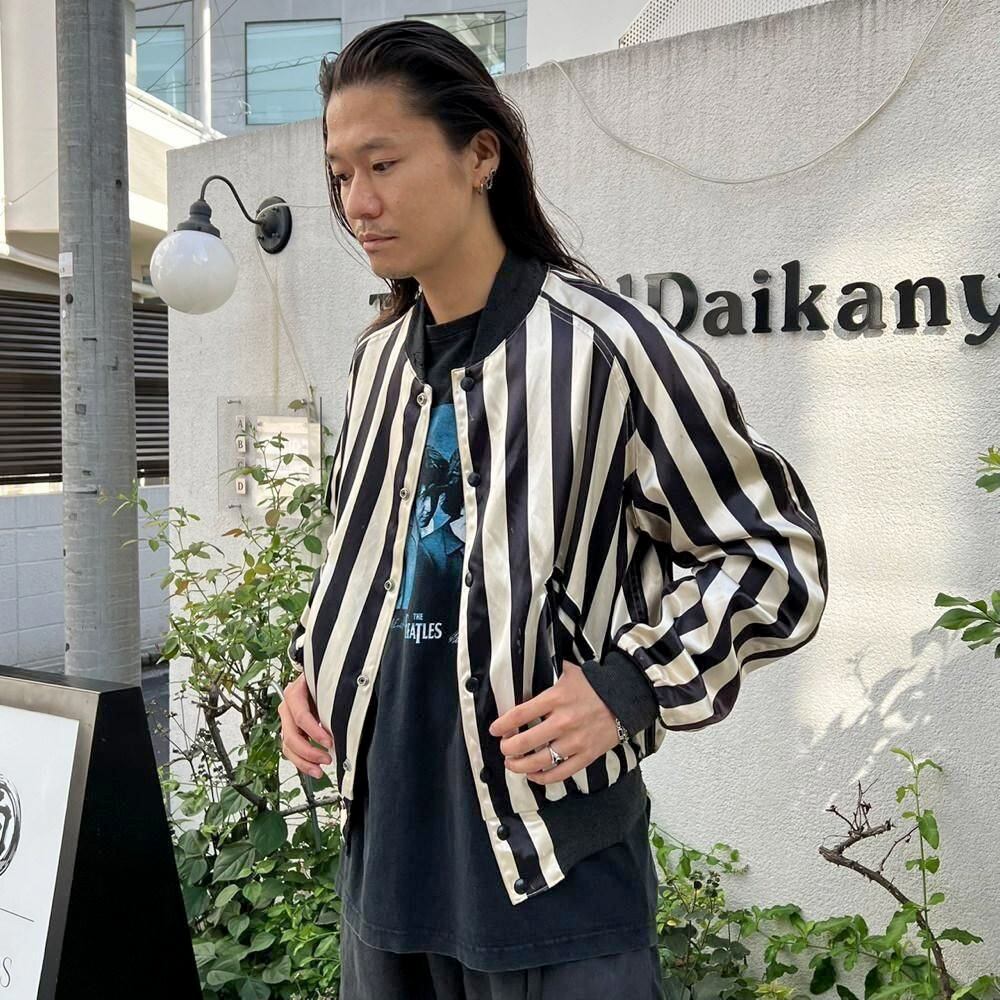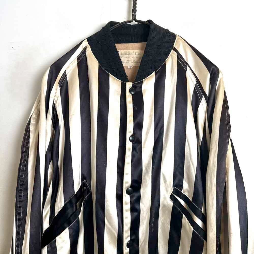 This referee jacket from the 1950s features a dusty white and black monotone stripe that has developed a unique character over time. The luxurious rayon satin fabric has a unique texture that is different from nylon satin. It is a size 40, and has a comfortable fit with just the right amount of room.
