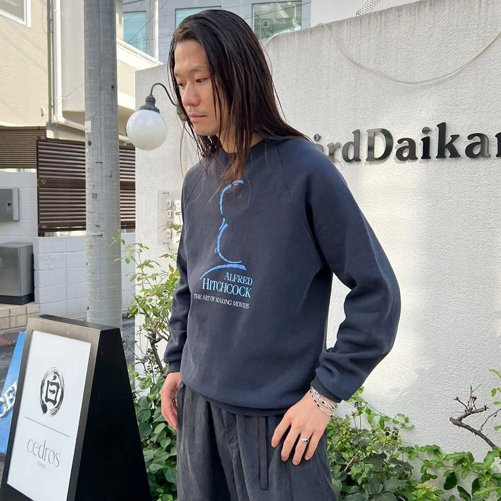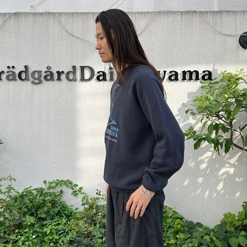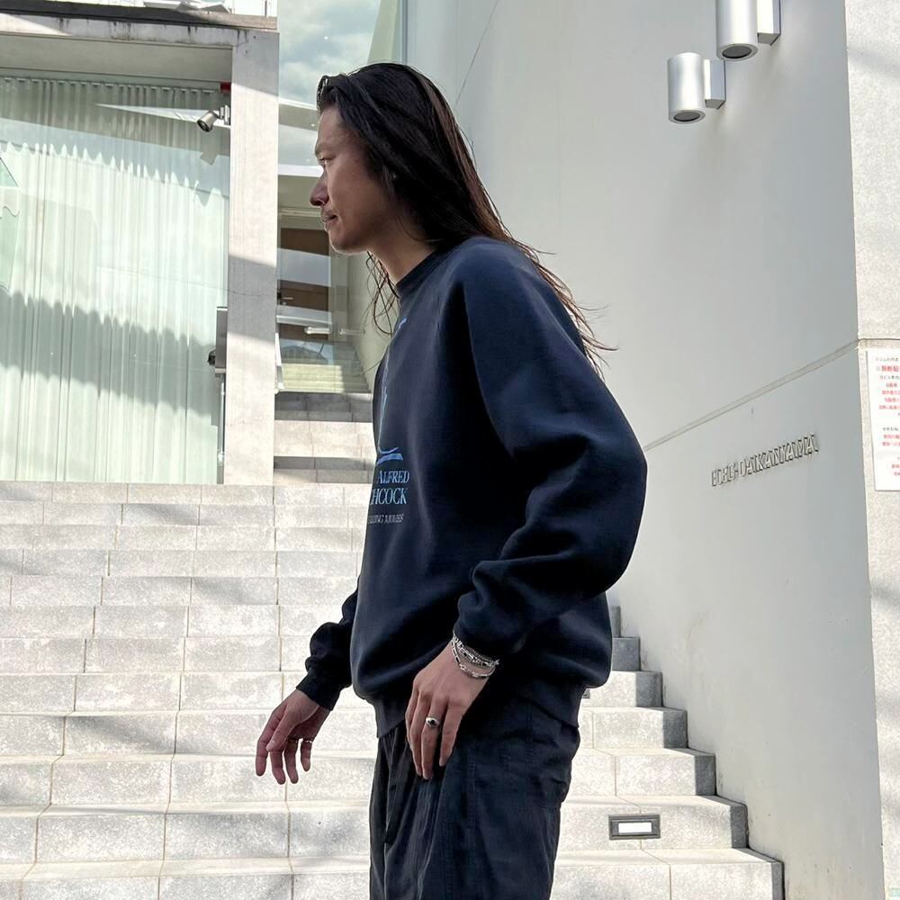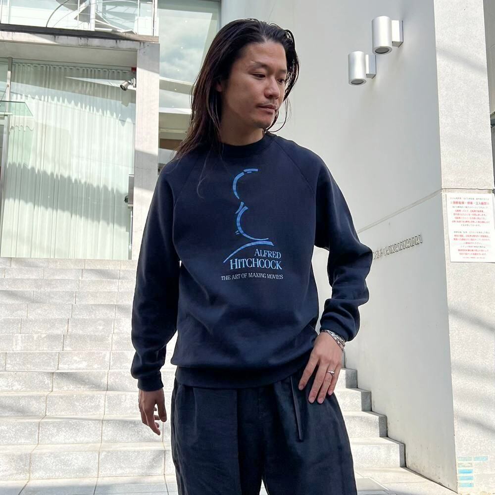 This is a souvenir from the time of the Hitchcock attraction at Universal Studios in the 1990s. The black color has aged nicely and is a comfortable size to wear as an inner layer. The deformed Hitchcock print gives it an artistic feel.