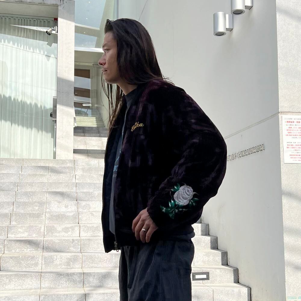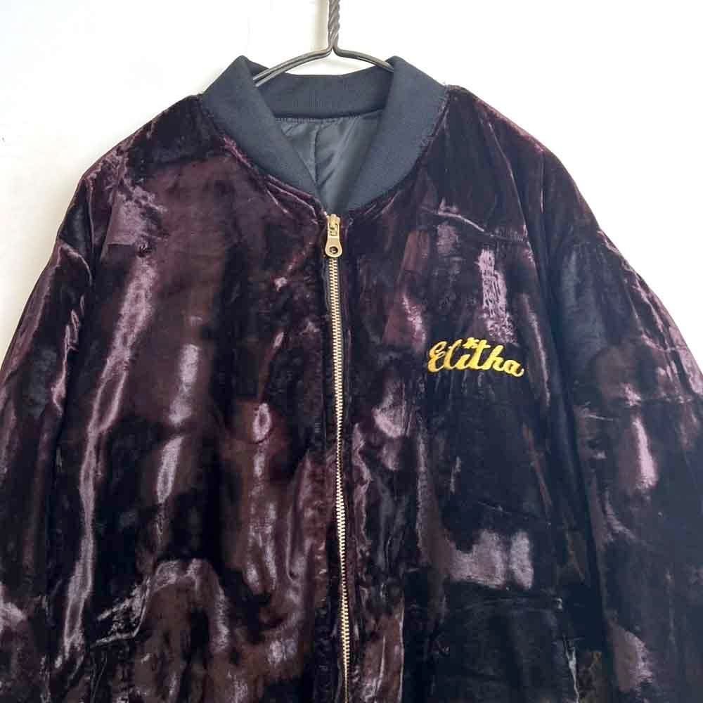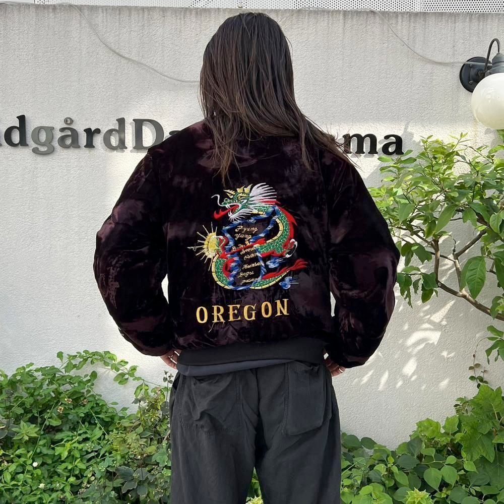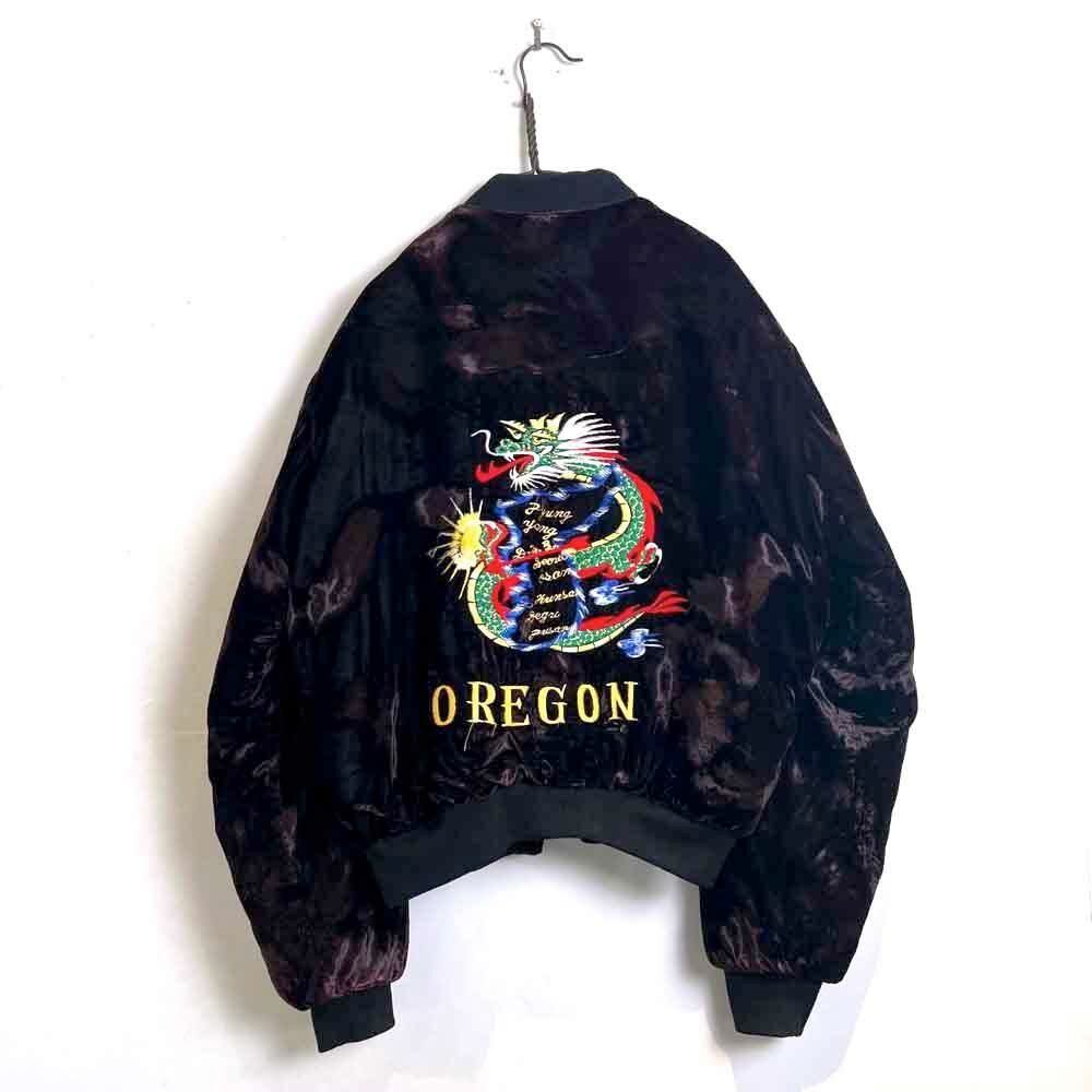 This 1980s Oregon velvet souvenir jacket features a luxurious dark purple velvet that almost looks black. It also features white rose embroidery on both sleeves and a dragon embroidery on the back, creating a stylish look. Its a generously sized piece for a vintage souvenir jacket.