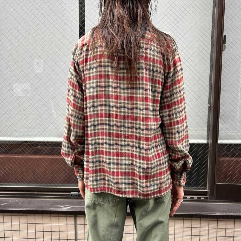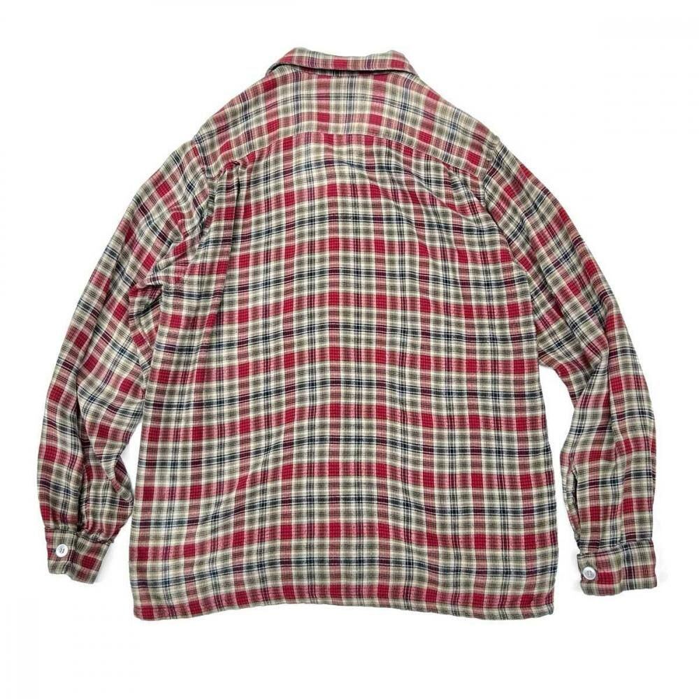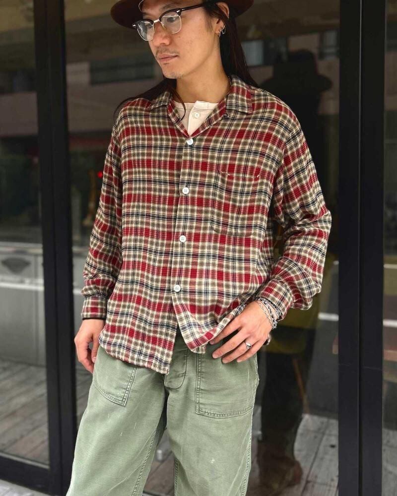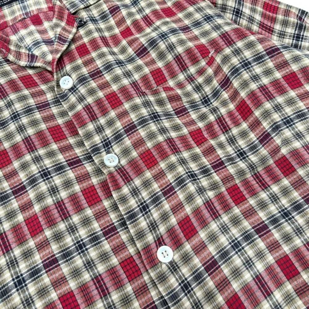 This open-collar shirt dates back to the 1960s. Crafted from a rare rayon flannel, it features a soft, flowing texture. The sophisticated shadow plaid check in black, red, and beige creates a vintage look. Its a size M, but its roomy and has a clean silhouette. As this is an old item, there may be some slight fading over time. Please check the photos and understand the characteristics of vintage items before purchasing.
