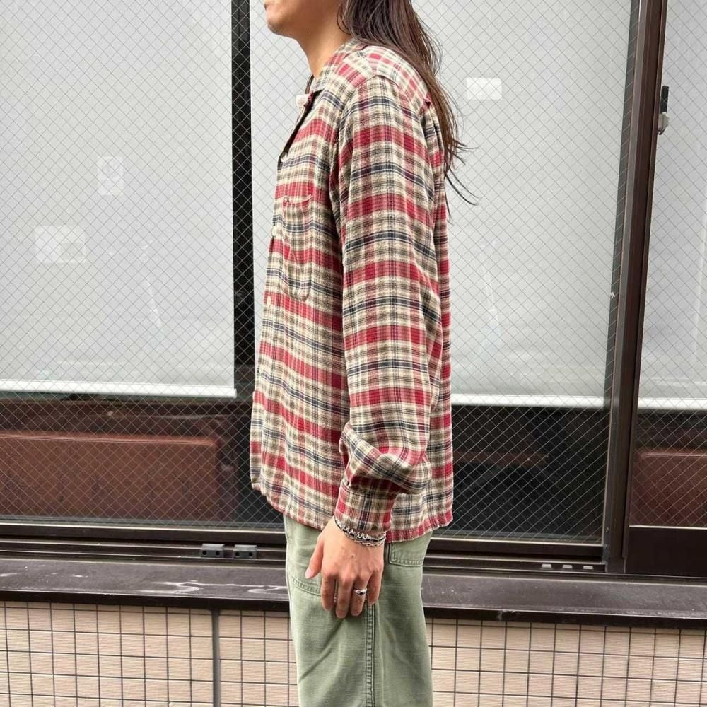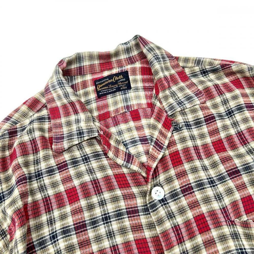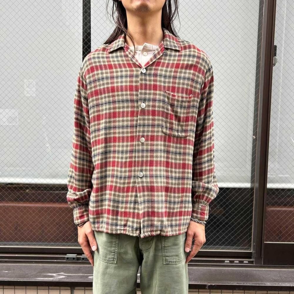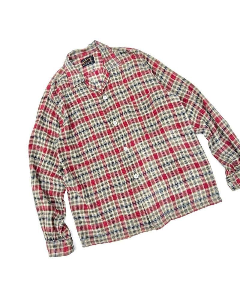 This open-collar shirt dates back to the 1960s. Crafted from a rare rayon flannel, it features a soft, flowing texture. The sophisticated shadow plaid check in black, red, and beige creates a vintage look. Its a size M, but its roomy and has a clean silhouette. As this is an old item, there may be some slight fading over time. Please check the photos and understand the characteristics of vintage items before purchasing.