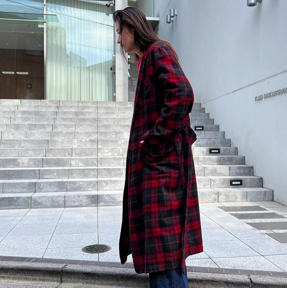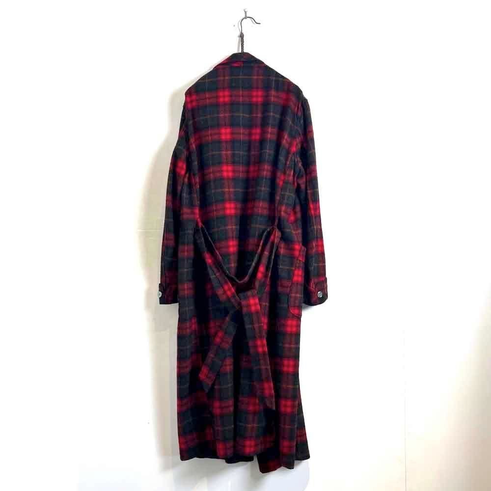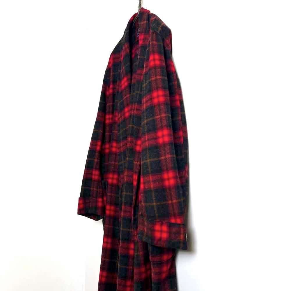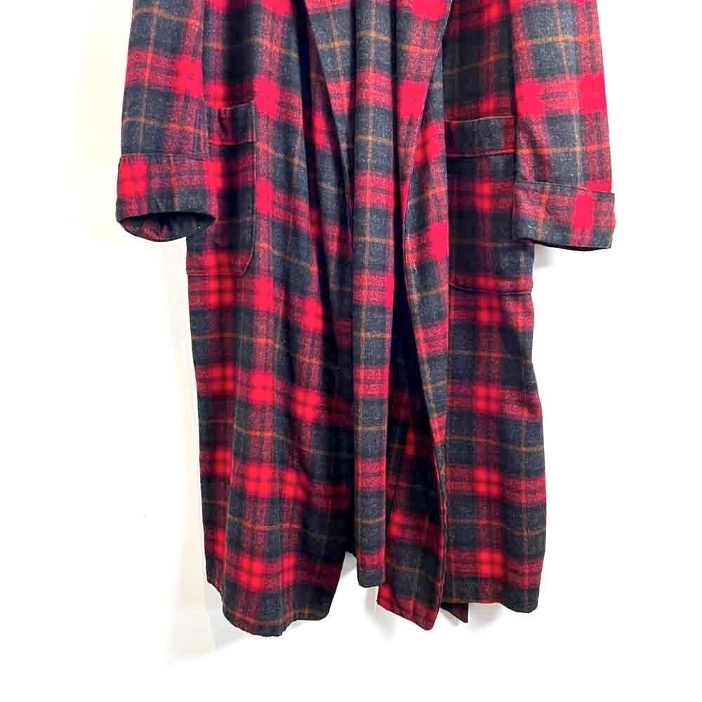 This 1960s Pendleton wool gown features a cool, faded red and black check pattern. Its in excellent condition and has a comfortable, relaxed fit. The long silhouette makes it easy to wear and is a unique piece.