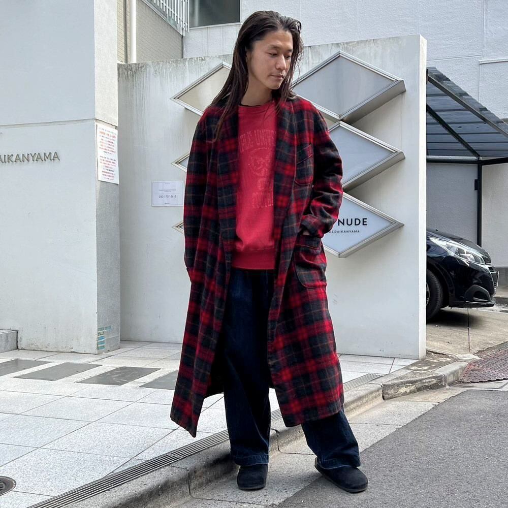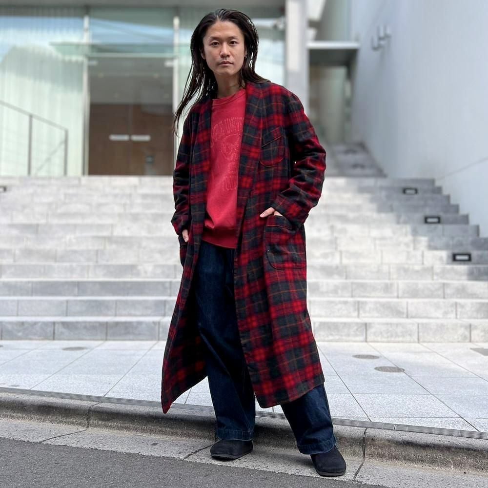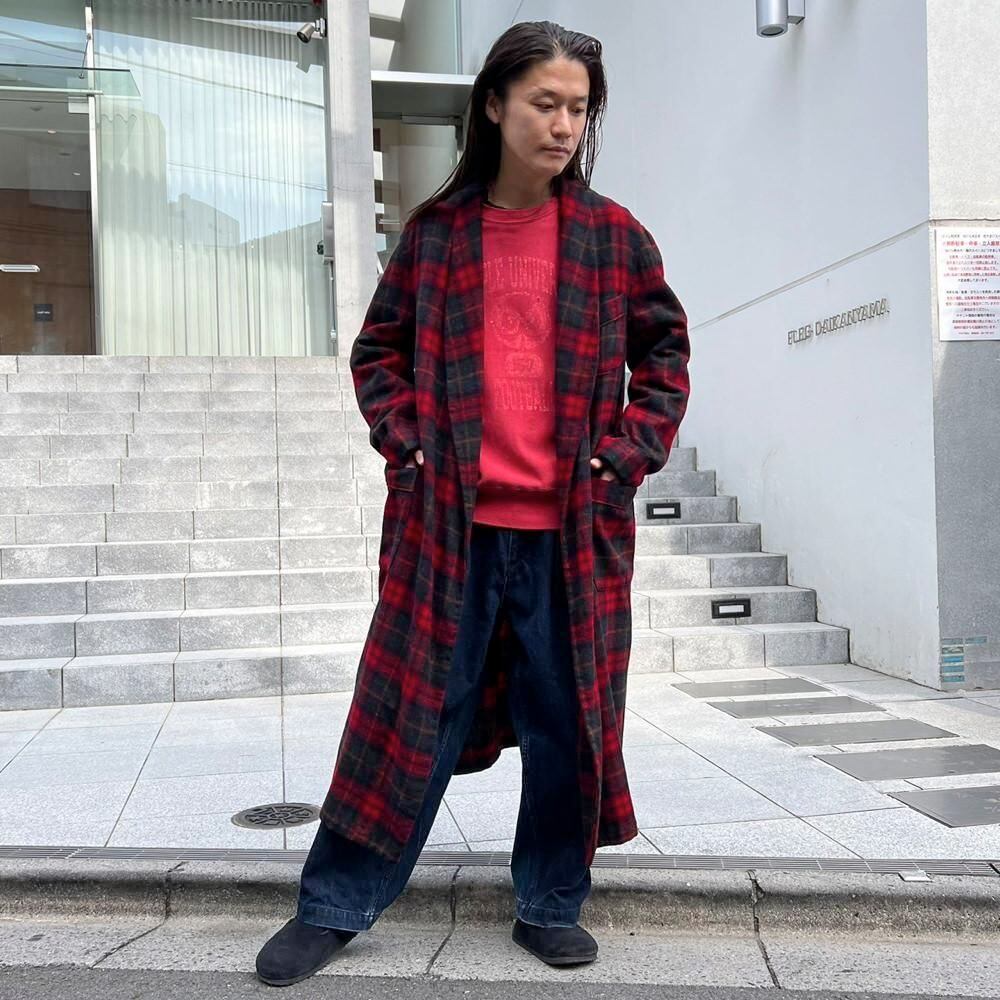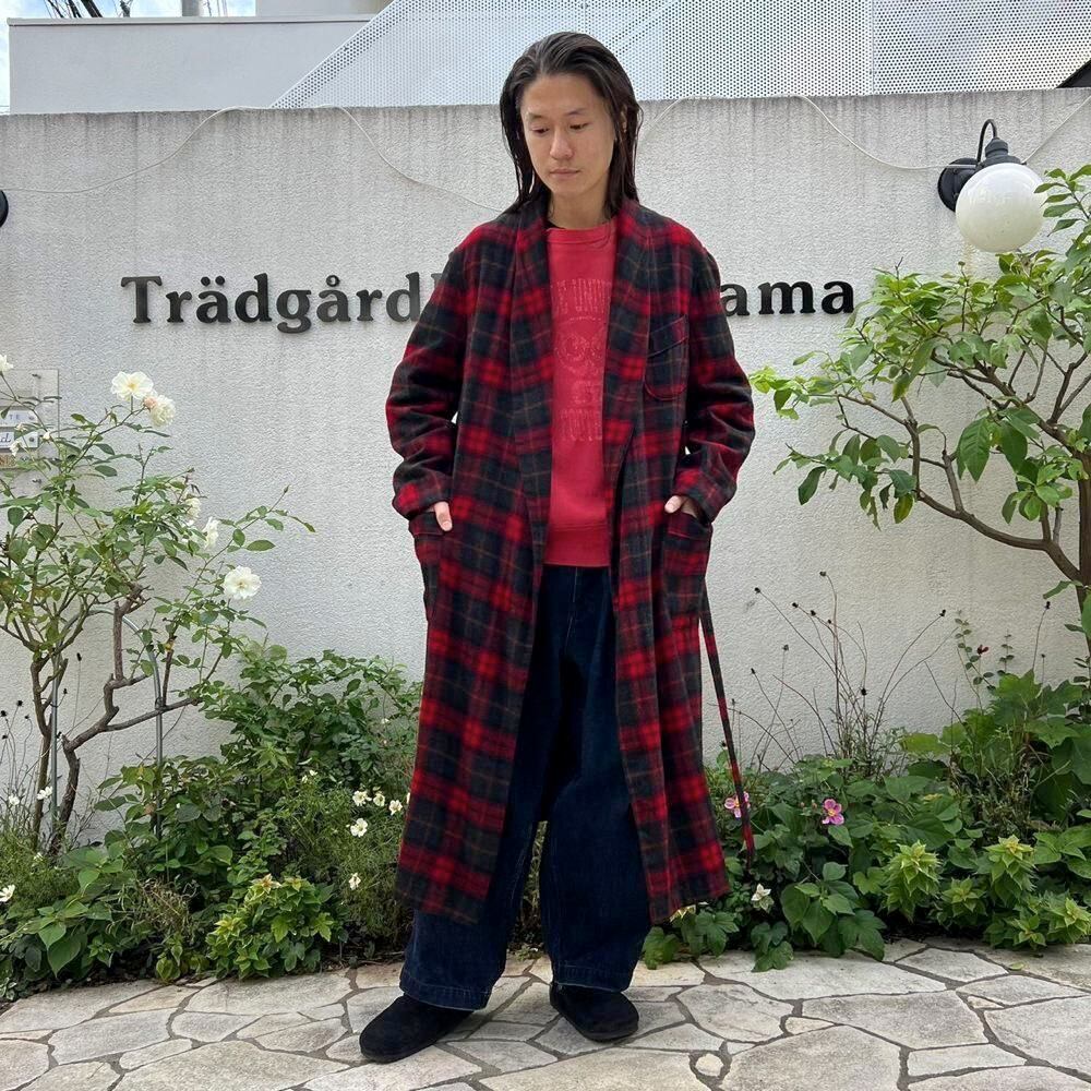 This 1960s Pendleton wool gown features a cool, faded red and black check pattern. Its in excellent condition and has a comfortable, relaxed fit. The long silhouette makes it easy to wear and is a unique piece.