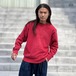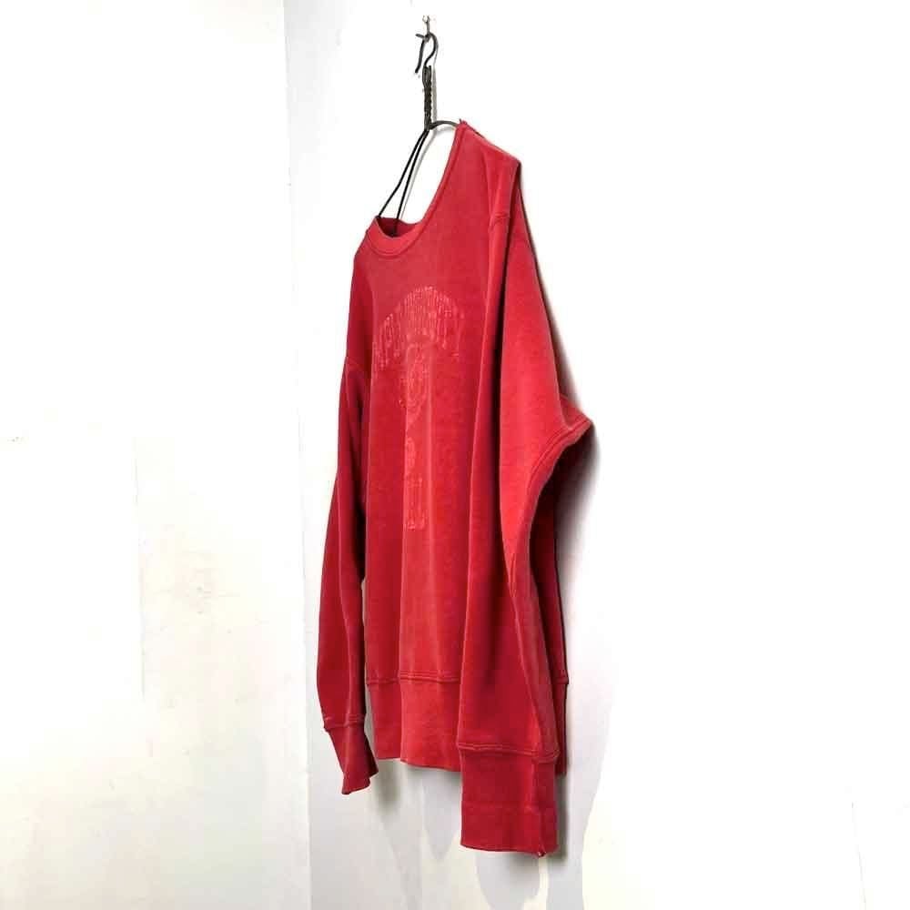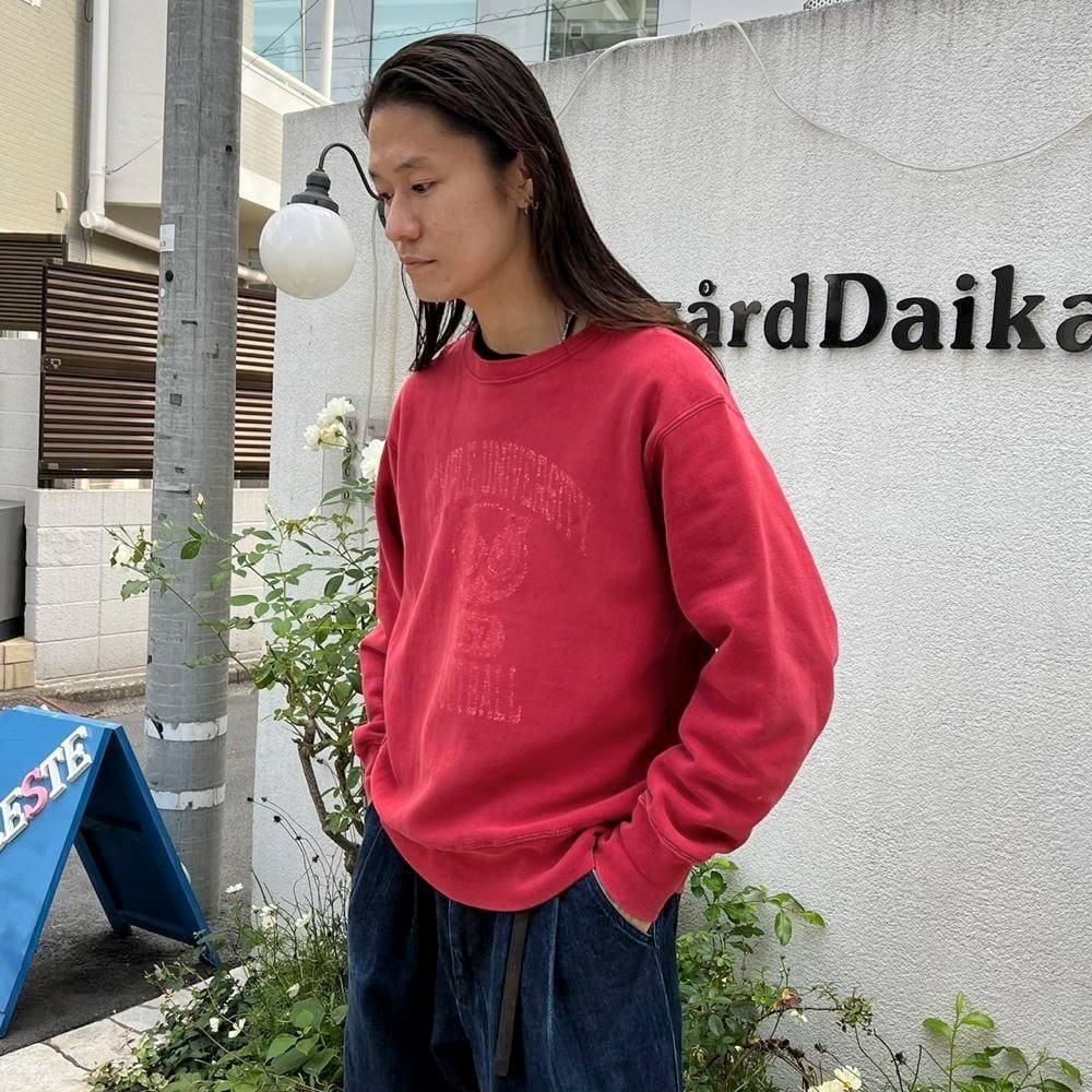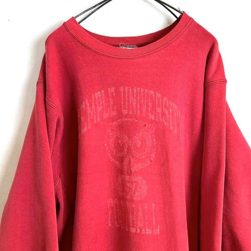 This 80s Temple University of Pennsylvania football team sweatshirt features a lovely faded red color and a slightly cracked print. It features a cute Hooters-esque owl design, a Champion reverse weave, and a size L. Its a comfortable fit with a roomy silhouette.