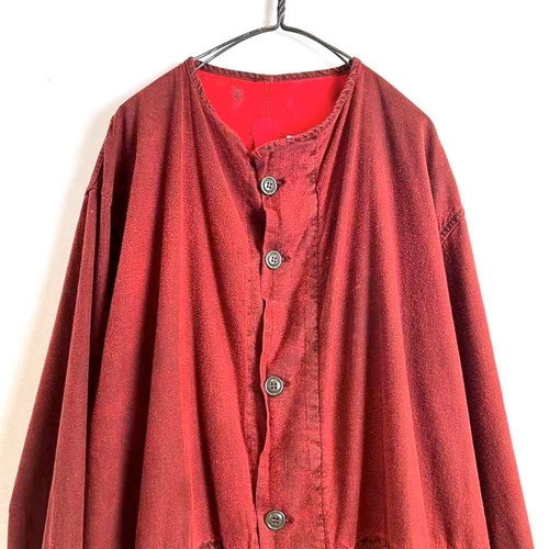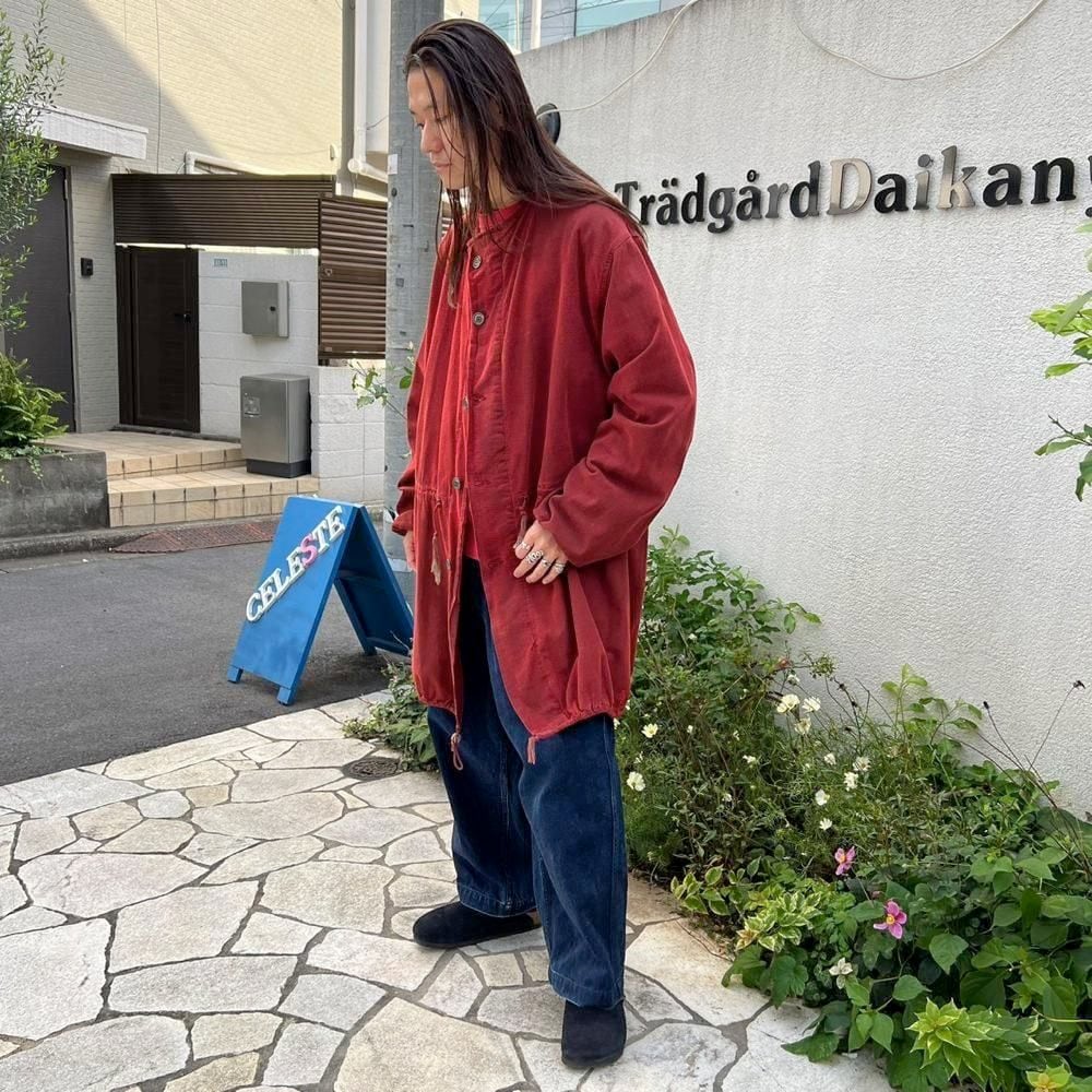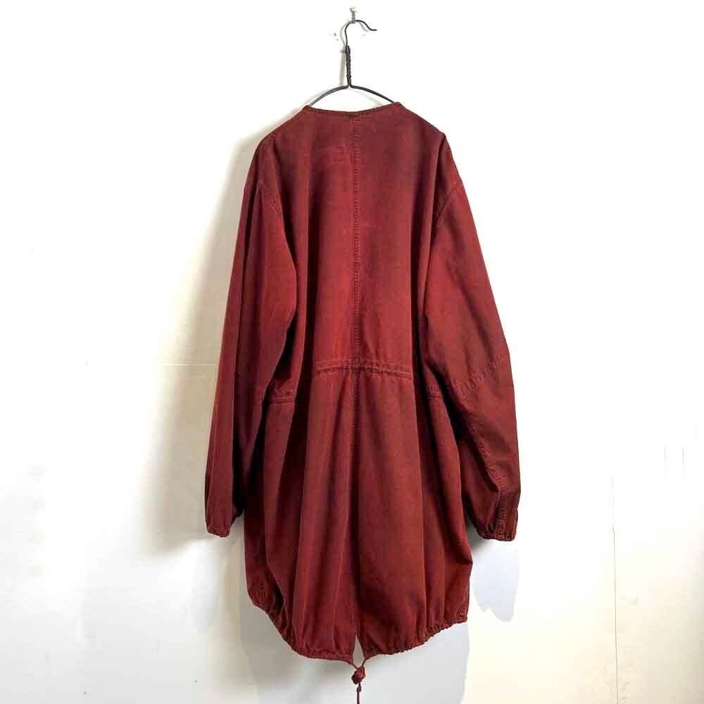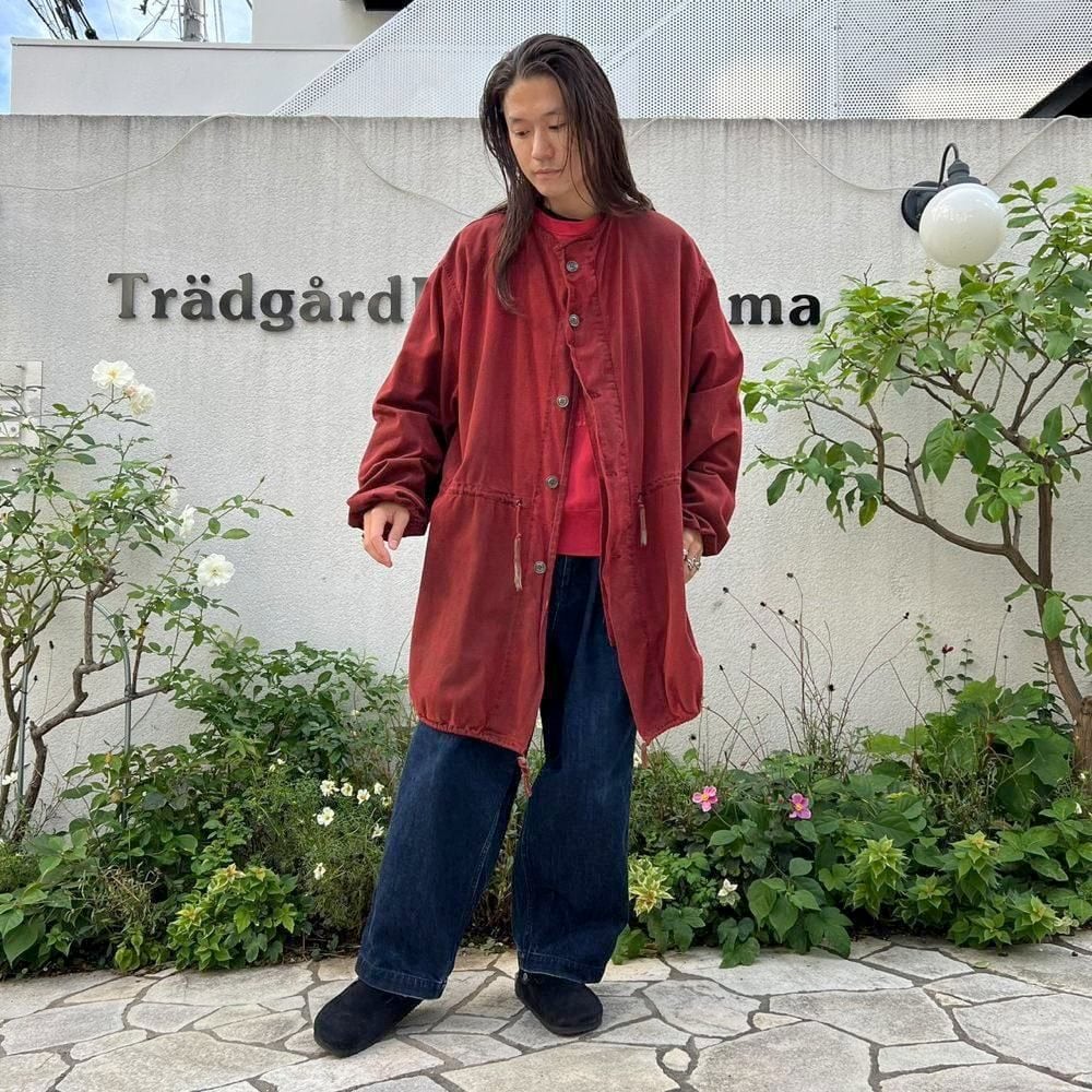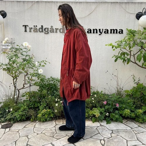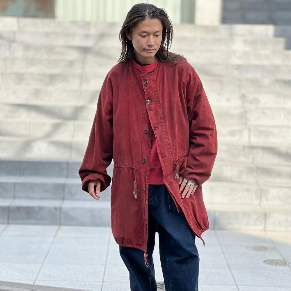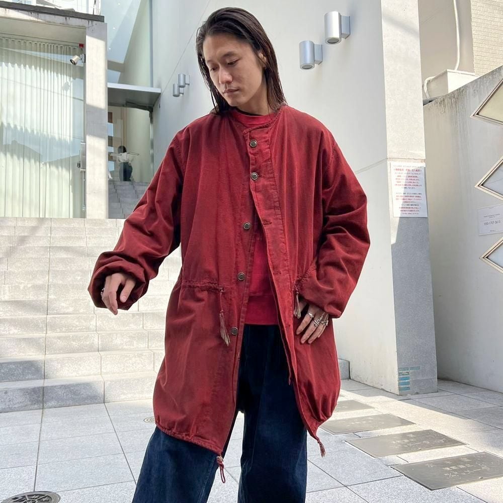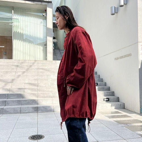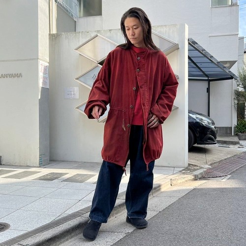 This is a 1960s US military gas protective coat that has been recolored in a rich red by post-dyeing. It is made of soft, supple cotton fabric and has a relaxed fit, making it a versatile piece to layer in the winter.