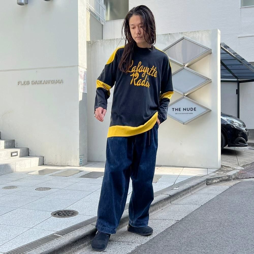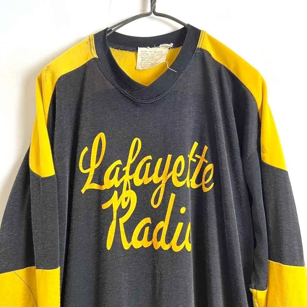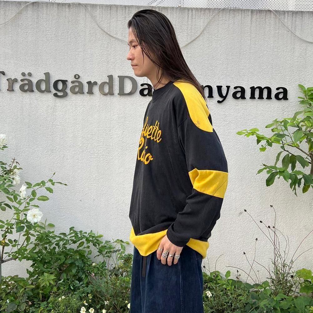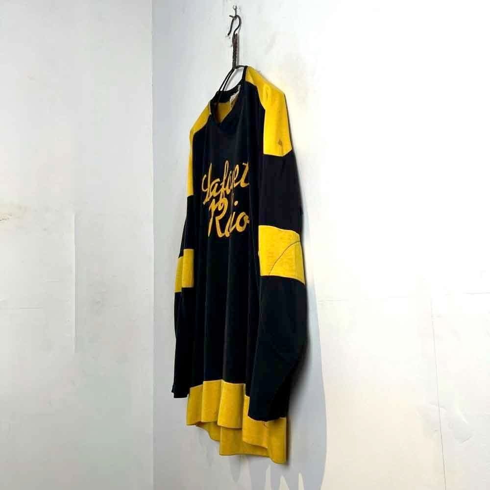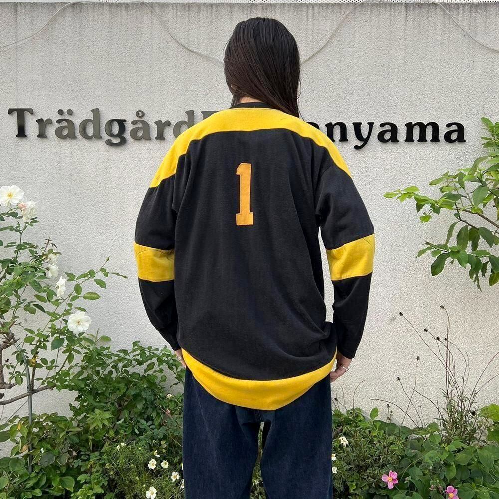 This 1960s ice hockey shirt features a catchy black and yellow color scheme, well-designed lettering, and the number 1 on the back gives it an ace vibe. Crafted from rayon and cotton, it has a glossy, smooth, and soft feel. The relaxed fit makes it a rare piece.