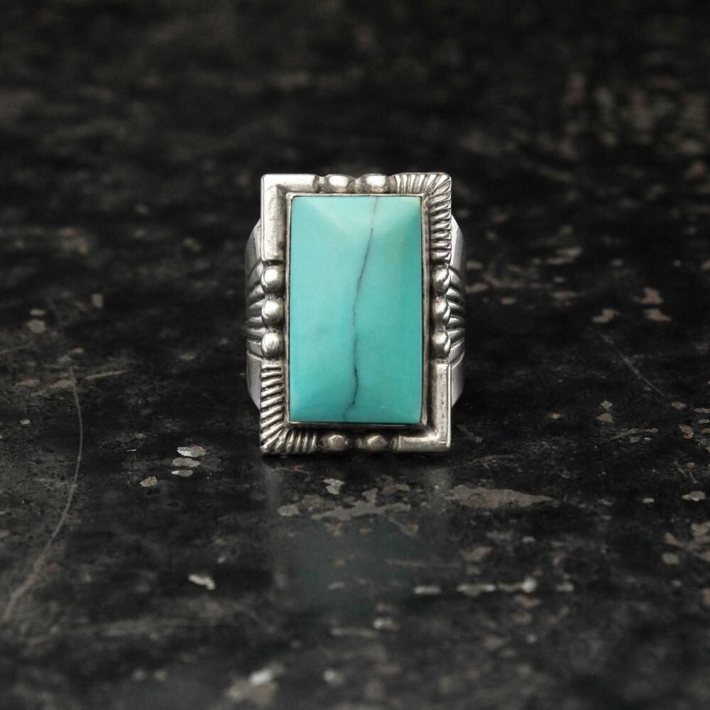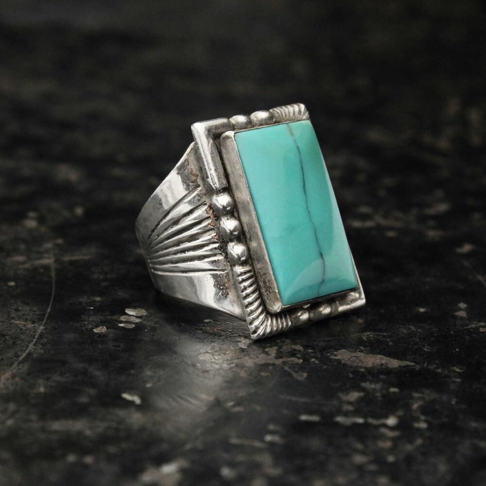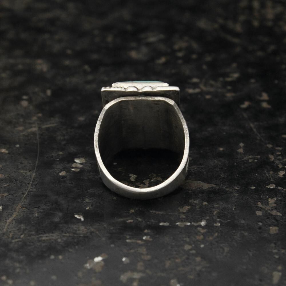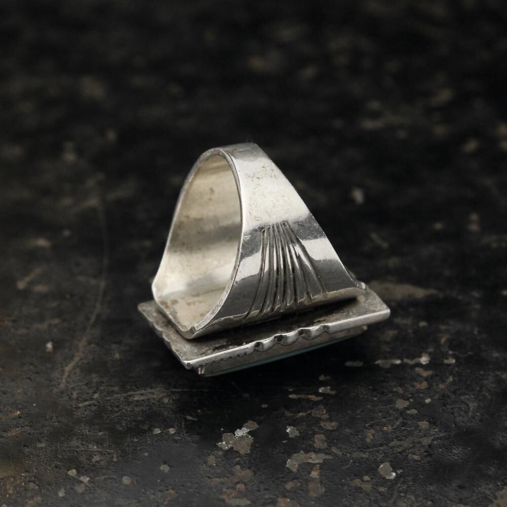 Maisels Indian Trading Post is a Fred Harvey-style jewelry shop in Albuquerque, New Mexico, since 1939. This signet ring features a simple hoop with subtle ethnic details and a large turquoise at the top, creating an impactful look. Its solid construction and design suggest it may date to the 1950s. It bears the distinctive Kachina hallmark, STERLING. Please review the photos to confirm the condition and understand the unique characteristics of this vintage piece before purchasing.