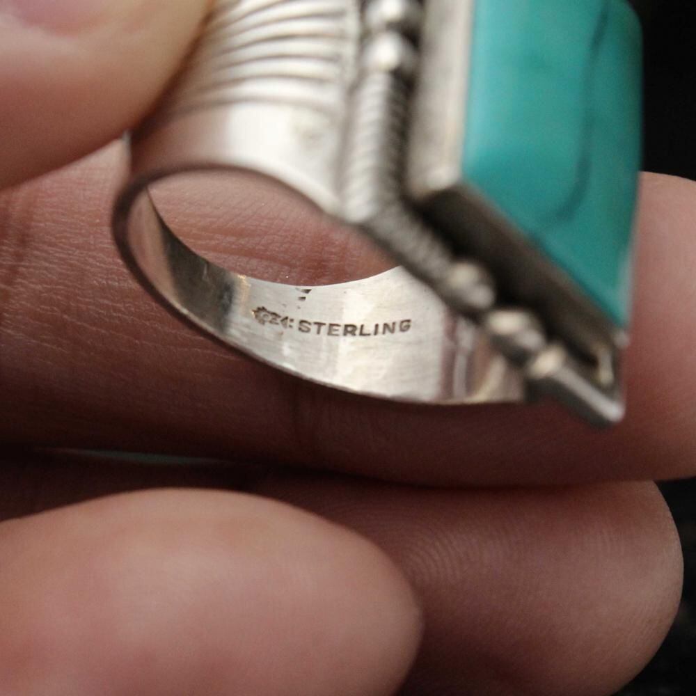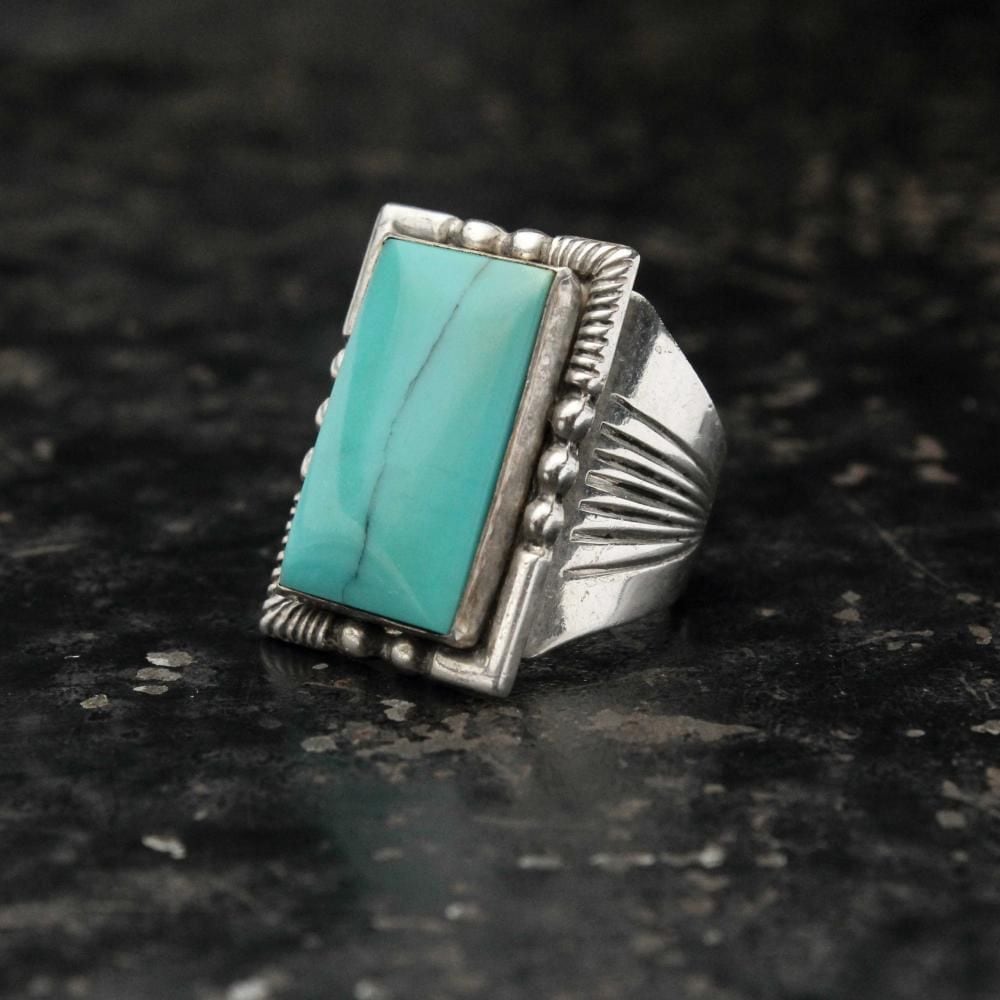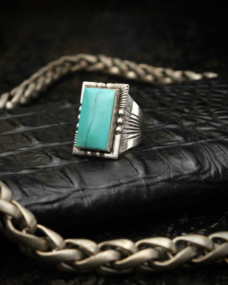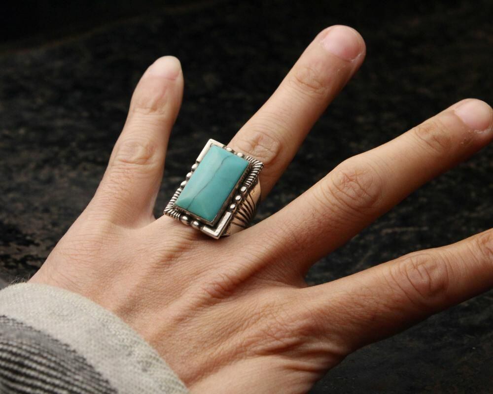 Maisels Indian Trading Post is a Fred Harvey-style jewelry shop in Albuquerque, New Mexico, since 1939. This signet ring features a simple hoop with subtle ethnic details and a large turquoise at the top, creating an impactful look. Its solid construction and design suggest it may date to the 1950s. It bears the distinctive Kachina hallmark, STERLING. Please review the photos to confirm the condition and understand the unique characteristics of this vintage piece before purchasing.