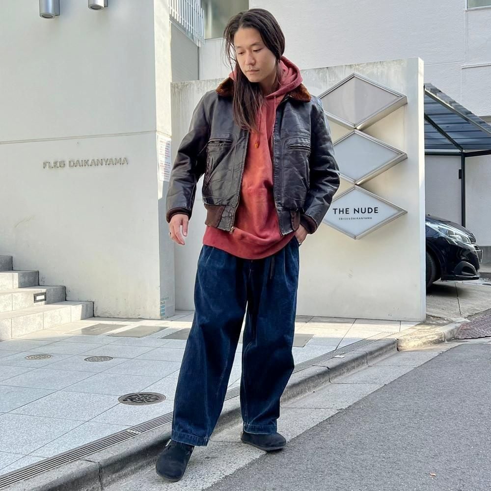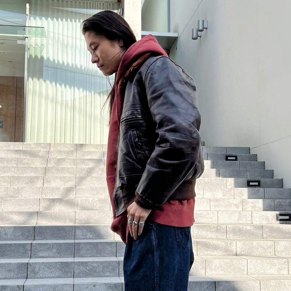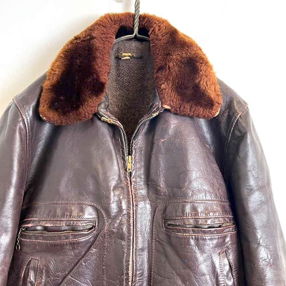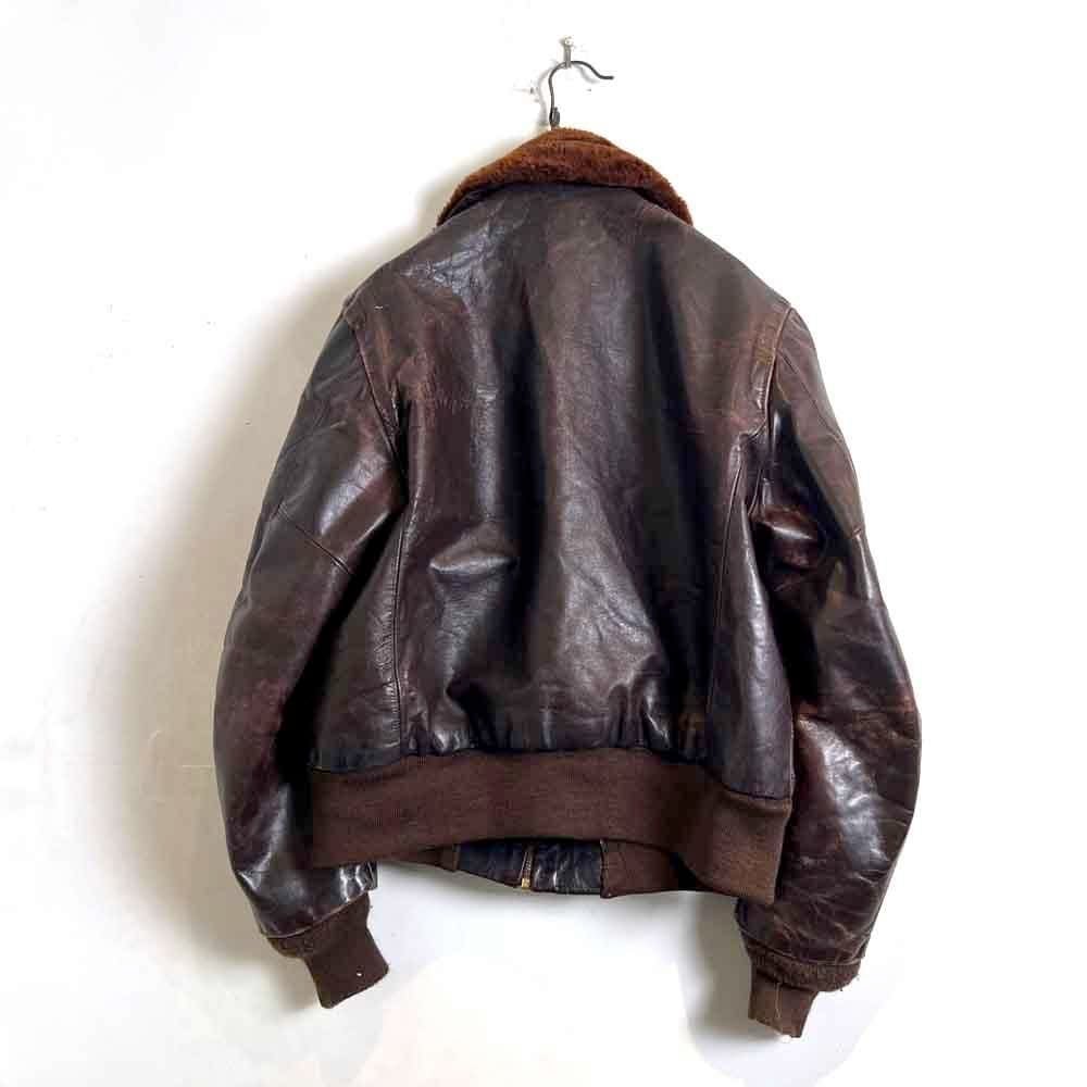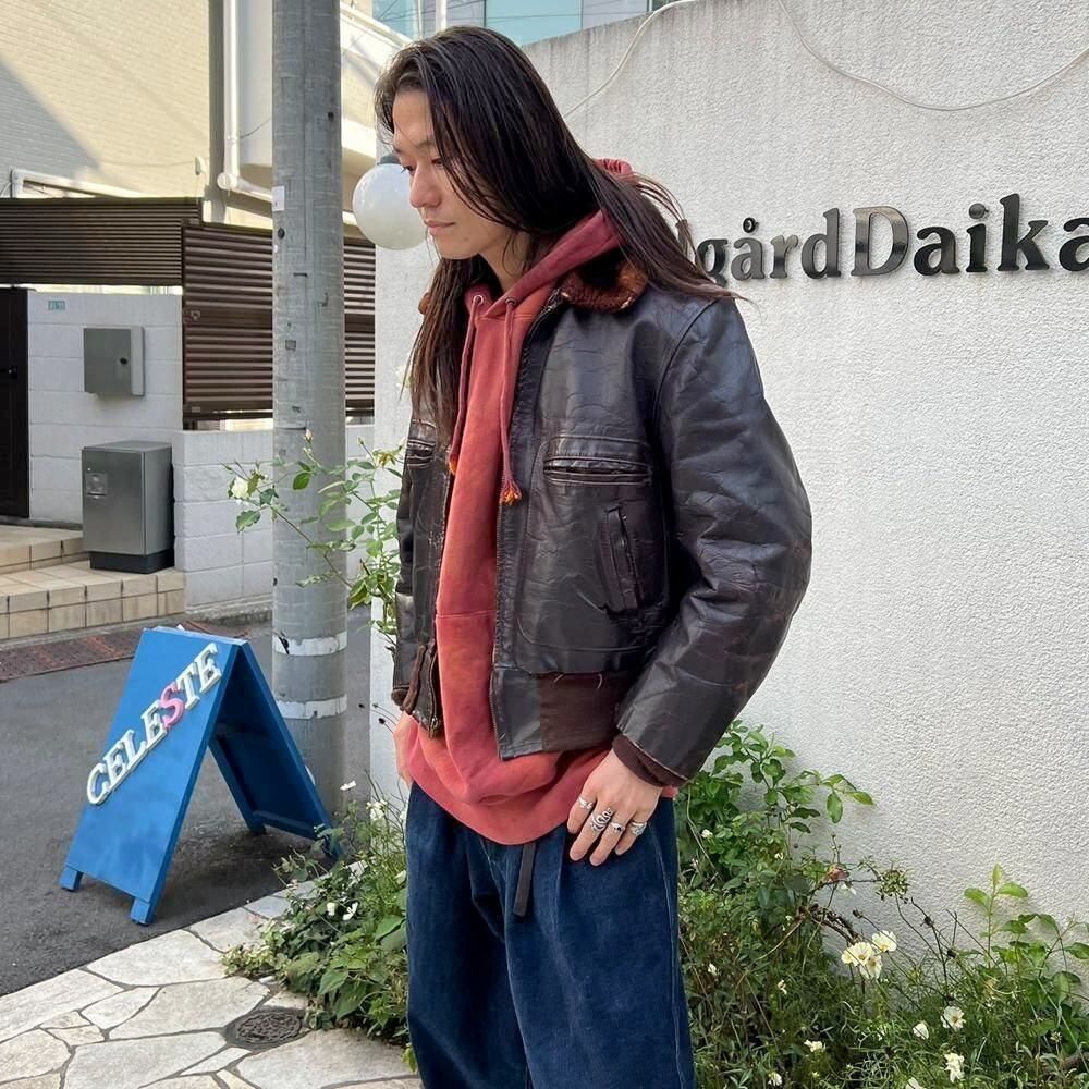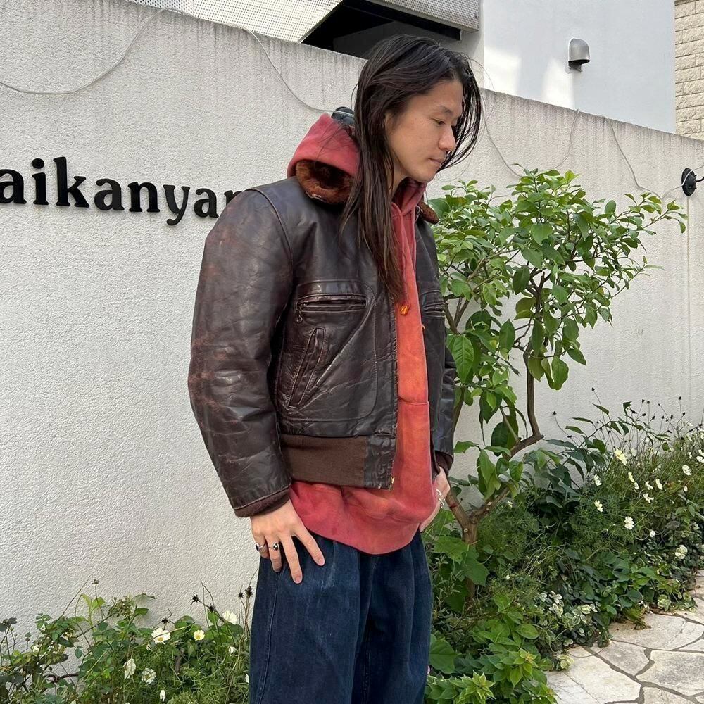 This 1950s G-1 leather jacket features a richly textured, cracked finish over time, and the smooth sheen of horse leather creates a stylish look. The lining is made of 100% alpaca for excellent cold protection. While there is no size indication, it fits comfortably around a size L.