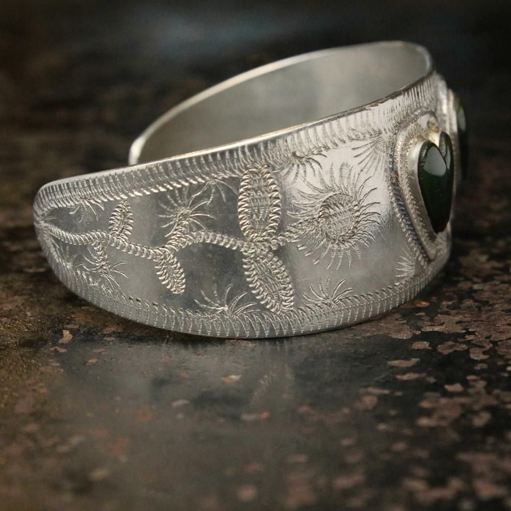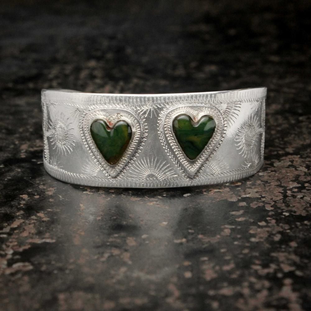 Although its age is unknown, this handmade bangle appears to date back to the 1950s. The sweetheart motif is inlaid with green stones resembling turquoise and jade, creating an eye-catching design, while the substantial body adds a touch of sophistication. Although its made of alloy, the intricate carvings add to its charm. As its an old piece, there are some scratches. Please review the photos and understand the characteristics of vintage items before purchasing.