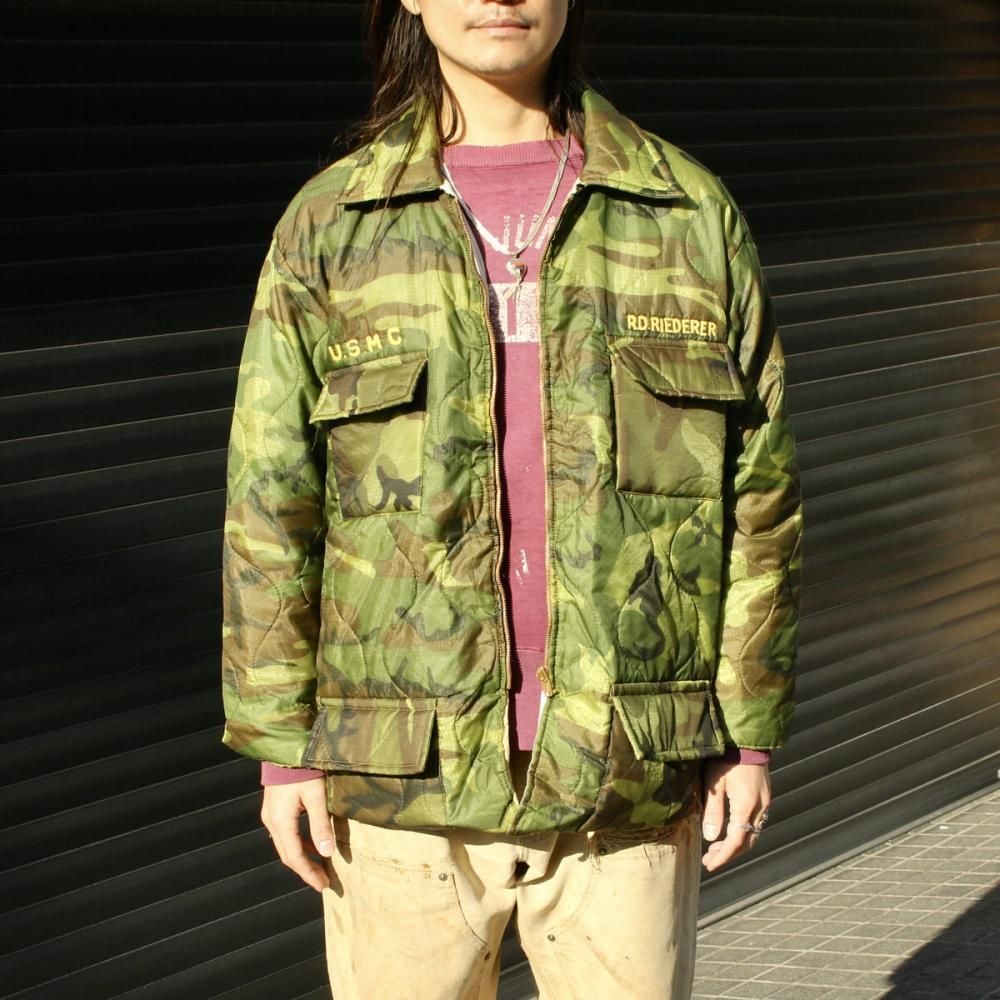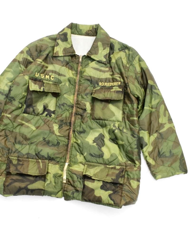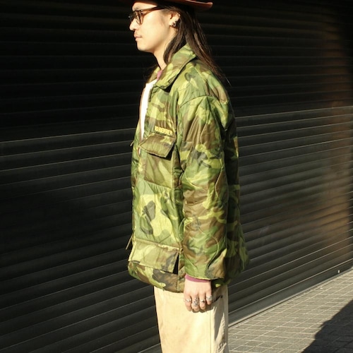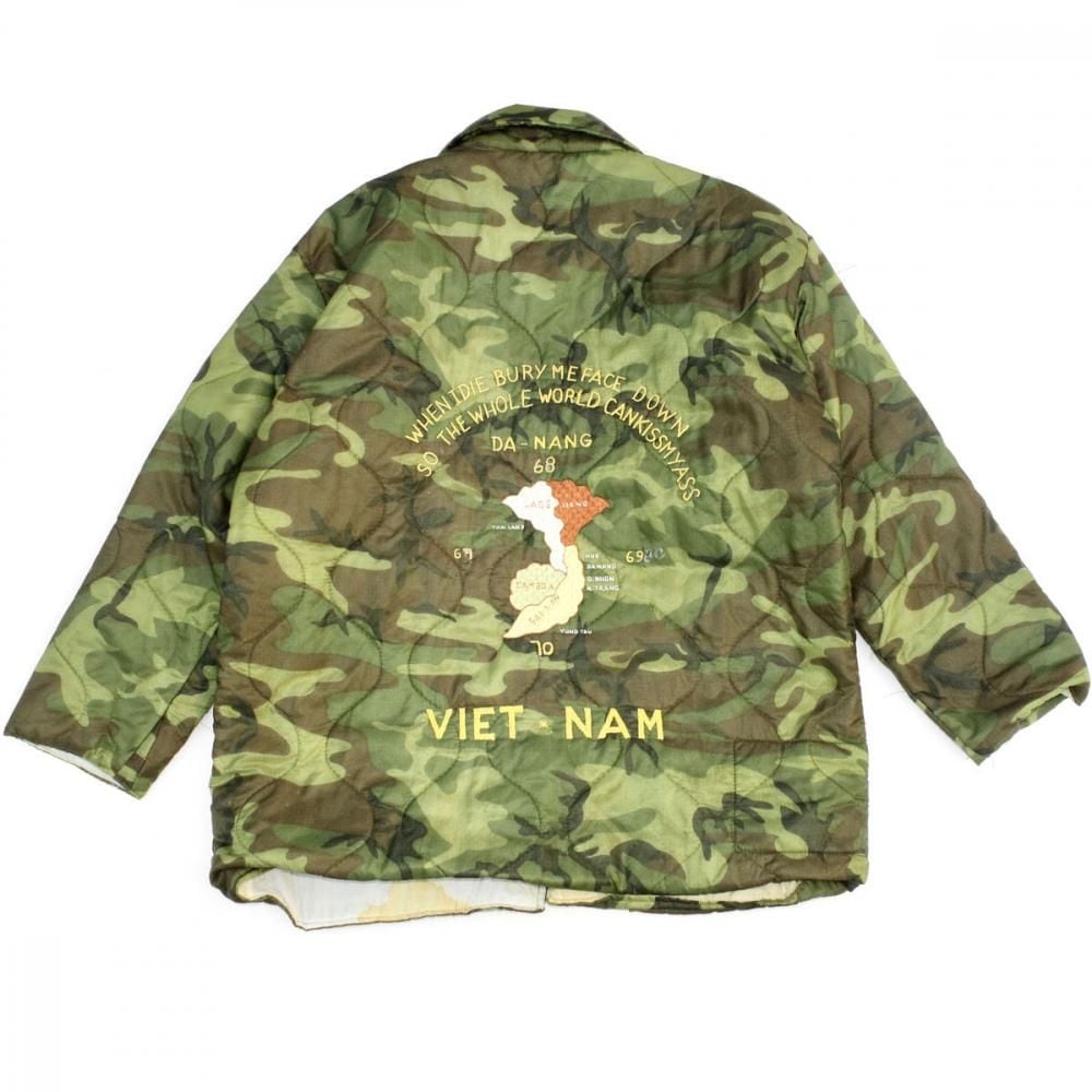 This souvenir jacket was made by the U.S. Marine Corps stationed at Da Nang Air Base during the Vietnam War. Crafted from ripstop polyester and quilted woodland camouflage fabric, it offers a distinctive military look, unique to this era. The back features the words WHEN I DIE BURY ME FACE DOWN THE WHOLE WORLD CAN KISS MY ASS embroidered by hand, rather than machine-sewn, for a soft, distinctive look. This rare size offers a comfortable, roomy fit, even among the many smaller items. While there are some loose quilting stitching, primarily around the shoulders, stains on the lining, and vertical shrinkage of the lining, these are typical signs of vintage aging for this item. *Measurements were taken without stretching. As this is an old item, there may be occasional fading due to age. Please review the photos and understand the characteristics of vintage items before purchasing.